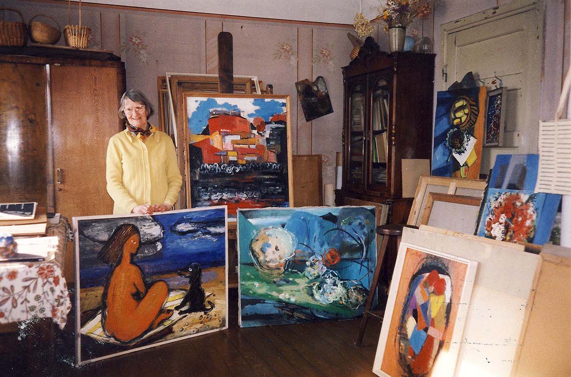 | | Ērika Gulbe savā darbnīcā 2001.gadā. LNA LVA, 2405. f., 1-v. apr., 18. l., 103.lp |