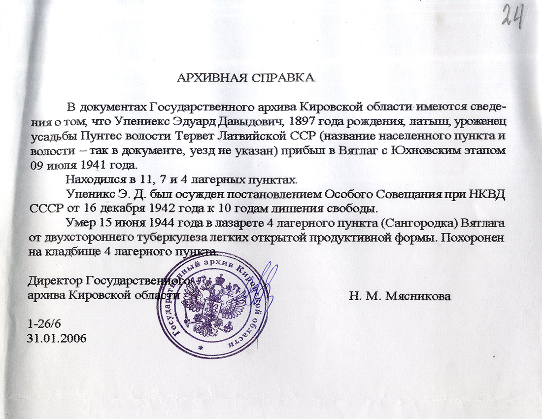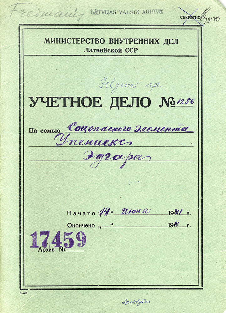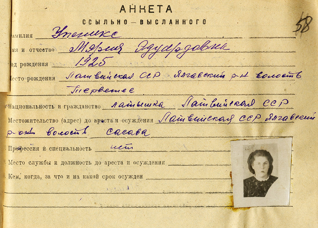 Mērijas un Gunāra Upenieku ģimeneUpenieks Gunārs Eduarda d., dz. 1927, dzīvoja Jelgavas apriņķa, Tērvetes pagasta Puntēs. Izsūtīts 14.06.1941. uz Krasnojarskas novada, Sajānu rajonu. Atbrīvots 21.12.1956. LVA, 1987. f., 1. apr. (Jelgava), 17459. lieta. Māsa Upeniece Mērija Eduarda m., dz. 1926, dzīvoja Jelgavas apriņķa, Tērvetes pagasta Puntēs. Izsūtīta 14.06.1941. uz Krasnojarskas novada, Sajānu rajonu. Atbrīvota 21.12.1956. LVA, 1987. f., 1. apr. (Jelgava), 17459. lieta. Tēvs Upenieks Eduards Dāvida d., dz. 1897, dzīvoja Jelgavas apriņķa, Tērvetes pagasta Puntēs. Arestēts 14.06.1941., ieslodzīts Vjatlagā. Miris 10.06.1944. Vjatlaga 4. nometnes lazaretē. LVA, 1986. f., 2. apr., P-6354. lieta. LVA, 1987. f., 1. apr. (Jelgava), 17459. lieta. Māte Upeniece Beatrise Jāņa m., dz. 1897, dzīvoja Jelgavas apriņķa, Tērvetes pagasta Puntēs. Izsūtīta 14.06.1941. uz Krasnojarskas novada, Sajānu rajonu. Mirusi 27.09.1947. Igarkā. LVA, 1987. f., 1. apr. (Jelgava), 17459. lieta. |