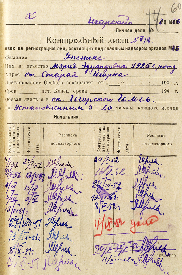 Mērija Upeniece: 1942. gada jūnijā mūsu ģimene, kas visu laiku bija dzīvojusi kopā ar Veras Jurevičas ģimeni, pēc milicijas pavēles tika vestas tālā ceļā uz ziemeļiem – uz Igarku. Tanti veru līdzi neņēma, jo viņas bērni bija mazi. Aizveda mūs atpakaļ uz Krasnojarsku un tālāk ar liellaivām pa Jeņiseju uz leju. Vispirms līdz pieturai “Šuškovo”, kur bija uzcelta pilnīgi jauna baraka un pirts (domātas izsūtīto nometināšanai). Tur mēs bijām kopā daudzu tautību cilvēkiem – latvieši, grieķi, kalmiki, rumāņi, vācieši, somi u. c.