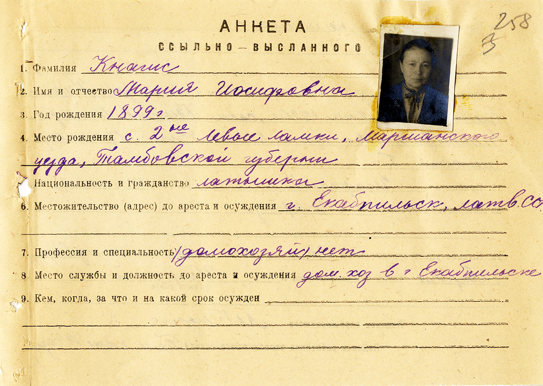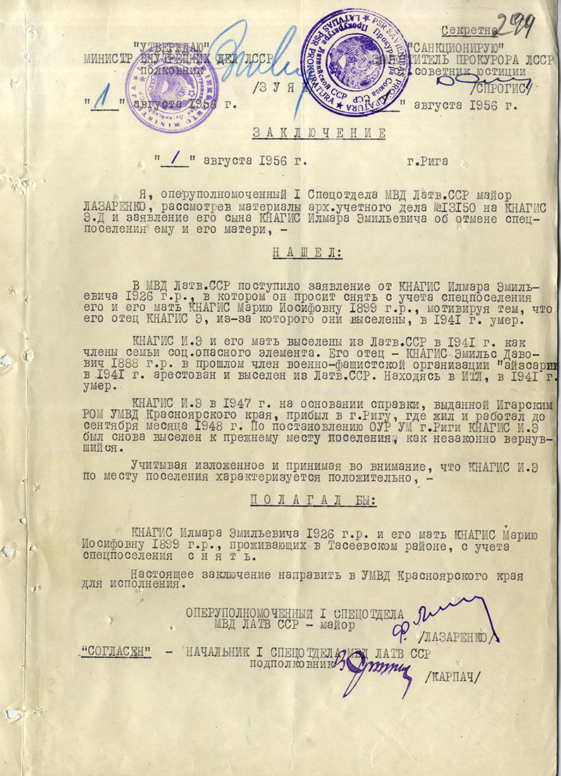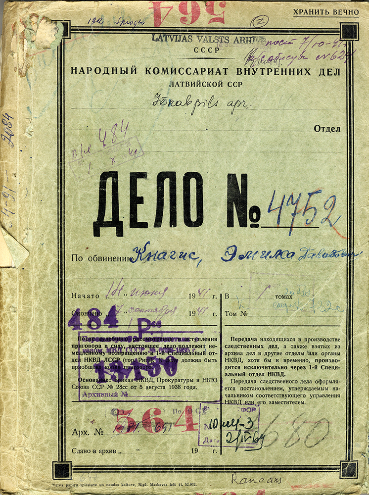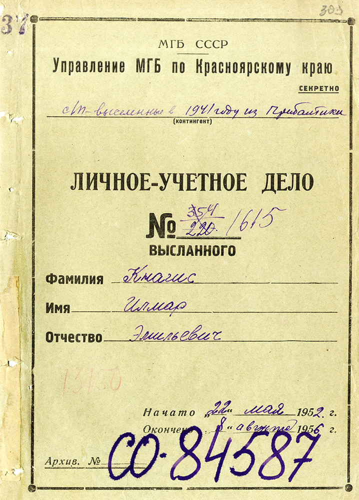 Ilmāra Knaģa ģimeneKnaģis Ilmārs Emīla d., 1926, dzīvoja Jēkabpilī, Brīvības ielā 144. Izsūtīts 14.06.1941. uz Krasnojarskas novada Berjozovskas rajona Kuļičku sādžu. Atgriezies Latvijā 15.10.1947. Nosūtīts atpakaļ 01.08.1949., otrreiz izsūtījumā atradies dažādos Krasnojarskas novada rajonos. Atbrīvots 08.08.1956. Latvijā atgriezies 1962. gadā. Miris 11.12.2020. LVA, 1987. f., 1. apr., (Jēkabpils), 484-R. lieta. Tēvs Knaģis Emīls Dāvja d., 1888, dzīvoja Jēkabpilī, Brīvības ielā 144. Arestēts 14.06.1941., ieslodzīts Vjatlagā, miris 04.10.1941., apglabāts 7. nometnes kapsētā. LVA, 1987. f., 1. apr., (Jēkabpils), 484-R. lieta. Māte Knaģe Marija Jāzepa m., 1899, dzīvoja Jēkabpilī, Brīvības ielā 144. Izsūtīta 14.06.1941. uz Krasnojarskas novada Berjozovskas rajona Kuļičku sādžu. Izsūtījumā atradusies arī Igarkas, Kanskas, Tasejevas rajonos. Atbrīvota 08.08.1956. LVA, 1987. f., 1. apr., (Jēkabpils), 484-R. lieta. |
