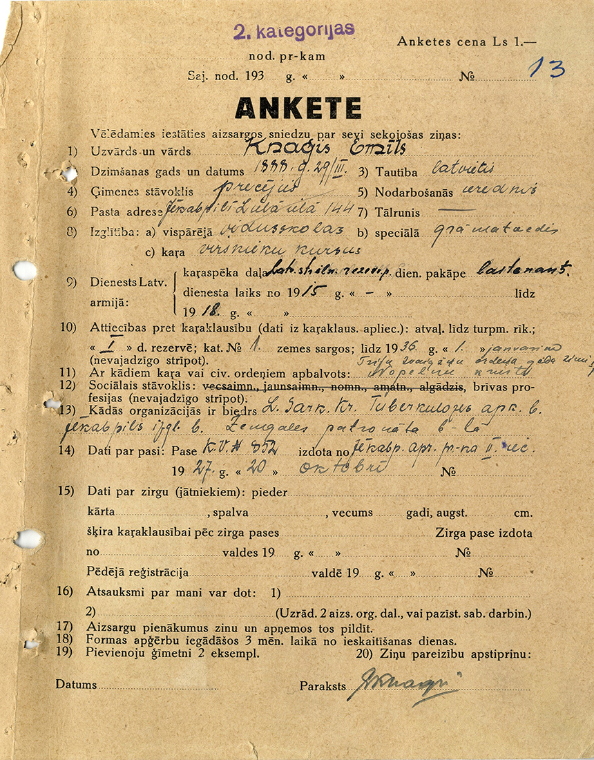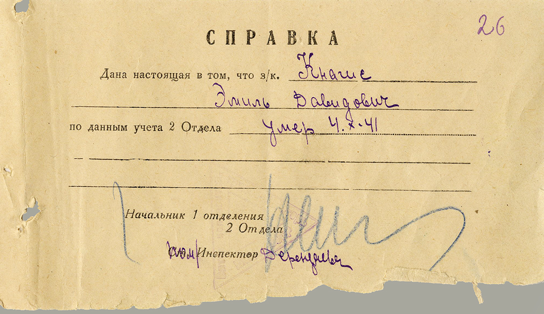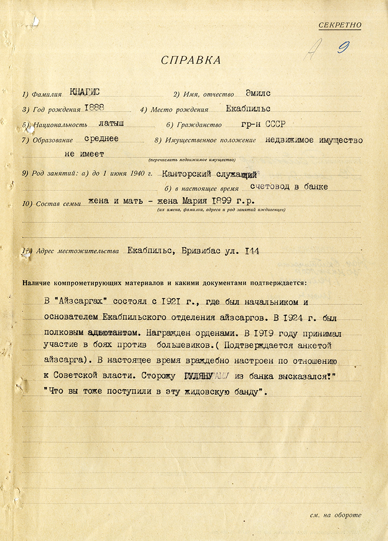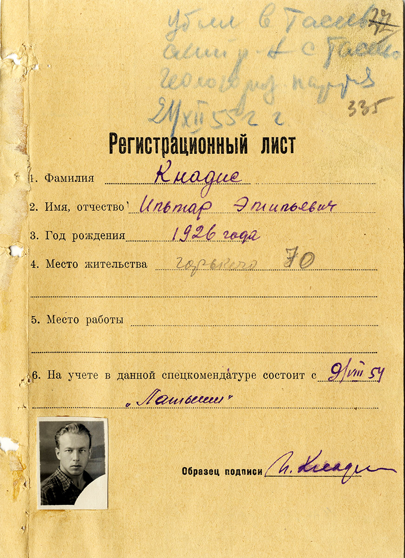 Ilmāra Knaģa ģimeneKnaģis Ilmārs Emīla d., 1926, dzīvoja Jēkabpilī, Brīvības ielā 144. Izsūtīts 14.06.1941. uz Krasnojarskas novada Berjozovskas rajona Kuļičku sādžu. Atgriezies Latvijā 15.10.1947. Nosūtīts atpakaļ 01.08.1949., otrreiz izsūtījumā atradies dažādos Krasnojarskas novada rajonos. Atbrīvots 08.08.1956. Latvijā atgriezies 1962. gadā. Miris 11.12.2020. LVA, 1987. f., 1. apr., (Jēkabpils), 484-R. lieta. Tēvs Knaģis Emīls Dāvja d., 1888, dzīvoja Jēkabpilī, Brīvības ielā 144. Arestēts 14.06.1941., ieslodzīts Vjatlagā, miris 04.10.1941., apglabāts 7. nometnes kapsētā. LVA, 1987. f., 1. apr., (Jēkabpils), 484-R. lieta. Māte Knaģe Marija Jāzepa m., 1899, dzīvoja Jēkabpilī, Brīvības ielā 144. Izsūtīta 14.06.1941. uz Krasnojarskas novada Berjozovskas rajona Kuļičku sādžu. Izsūtījumā atradusies arī Igarkas, Kanskas, Tasejevas rajonos. Atbrīvota 08.08.1956. LVA, 1987. f., 1. apr., (Jēkabpils), 484-R. lieta. |
