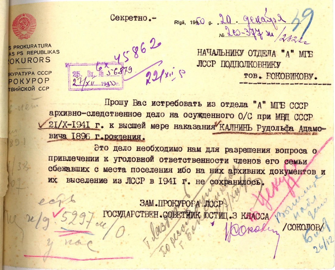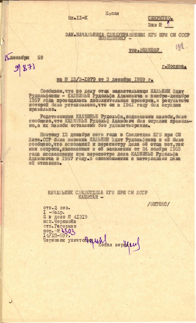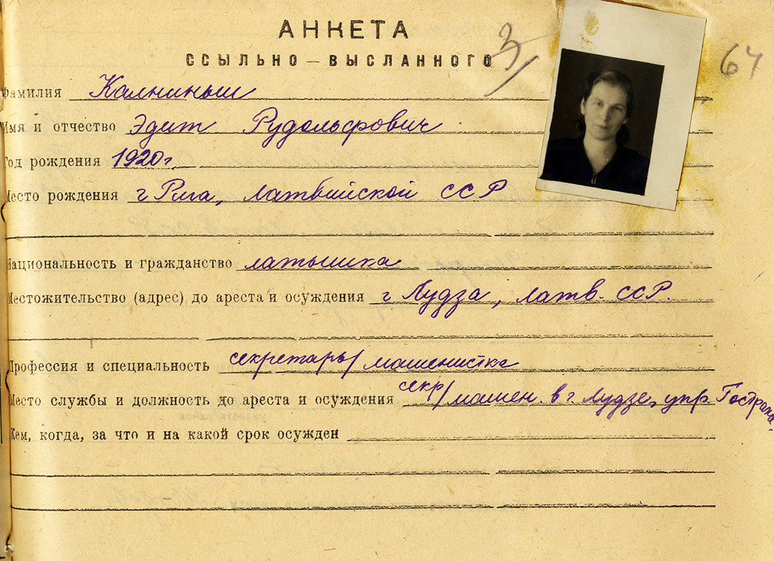 Māsa Kalniņa Edīte Rūdolfa m., 1921, dzīvoja Ludzā, Daugavpils ielā 5. Izsūtīta 14.06.1941. uz Krasnojarskas novada Ilanskas rajonu. Atbrīvota 28.02.1956. LVA, 1987. f., 1. apr. (Ludza), 20024. lieta.