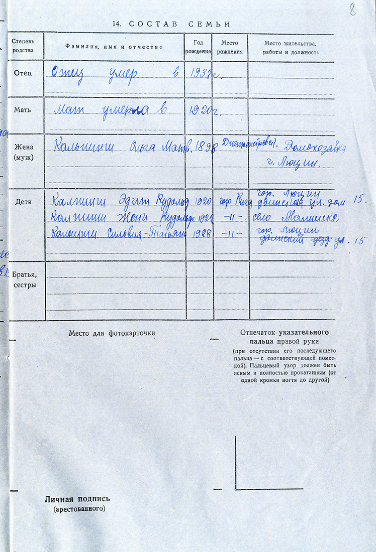 Māte Kalniņa Olga Mihaila m., 1905, dzīvoja Ludzā, Daugavpils ielā 5. Izsūtīta 14.06.1941. uz Krasnojarskas novada Ilanskas rajonu. 15.11.1946. atgriezās Latvijā. 12.09.1950. nosūtīta atpakaļ uz Krasnojarskas novadu. Atbrīvota 28.02.1956. LVA, 1987. f., 1. apr. (Ludza), 20024. lieta.