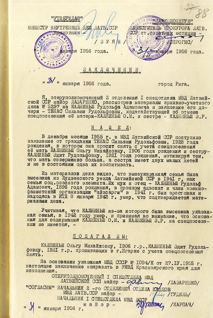 Mana māte pēc atbrīvošanas atgriezās uz Latviju un dzīvoja Rīgā. Viņa atgriezās 1948. gadā, bet 1950. gadā viņu atkal izsūtīja uz Soļikamskas pilsētu Kazačinskas rajonā un [Latvijā] viņa atgriezās tikai 1956. gadā. Bet māsa Edīte bija atbrīvota no ieslodzījuma [faktiski – specnometinājuma] Igarkā uz brīvu apmetni 1957. gadā.