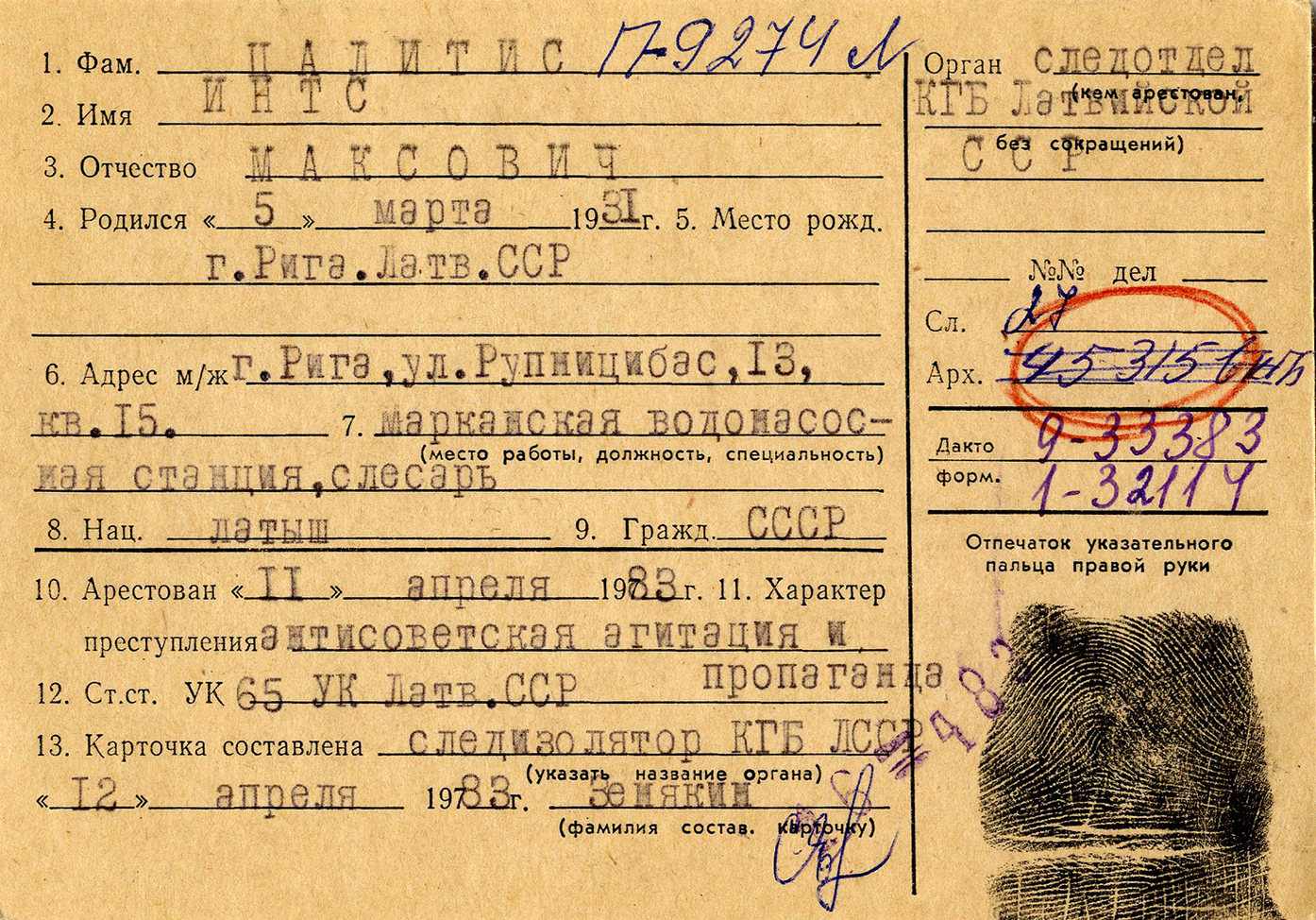 11. Latvijas PSR Valsts Drošības komitejas veidotā uzskaites kartīte par Inta Cālīša sodāmību. 1983. gada 12. aprīlis.