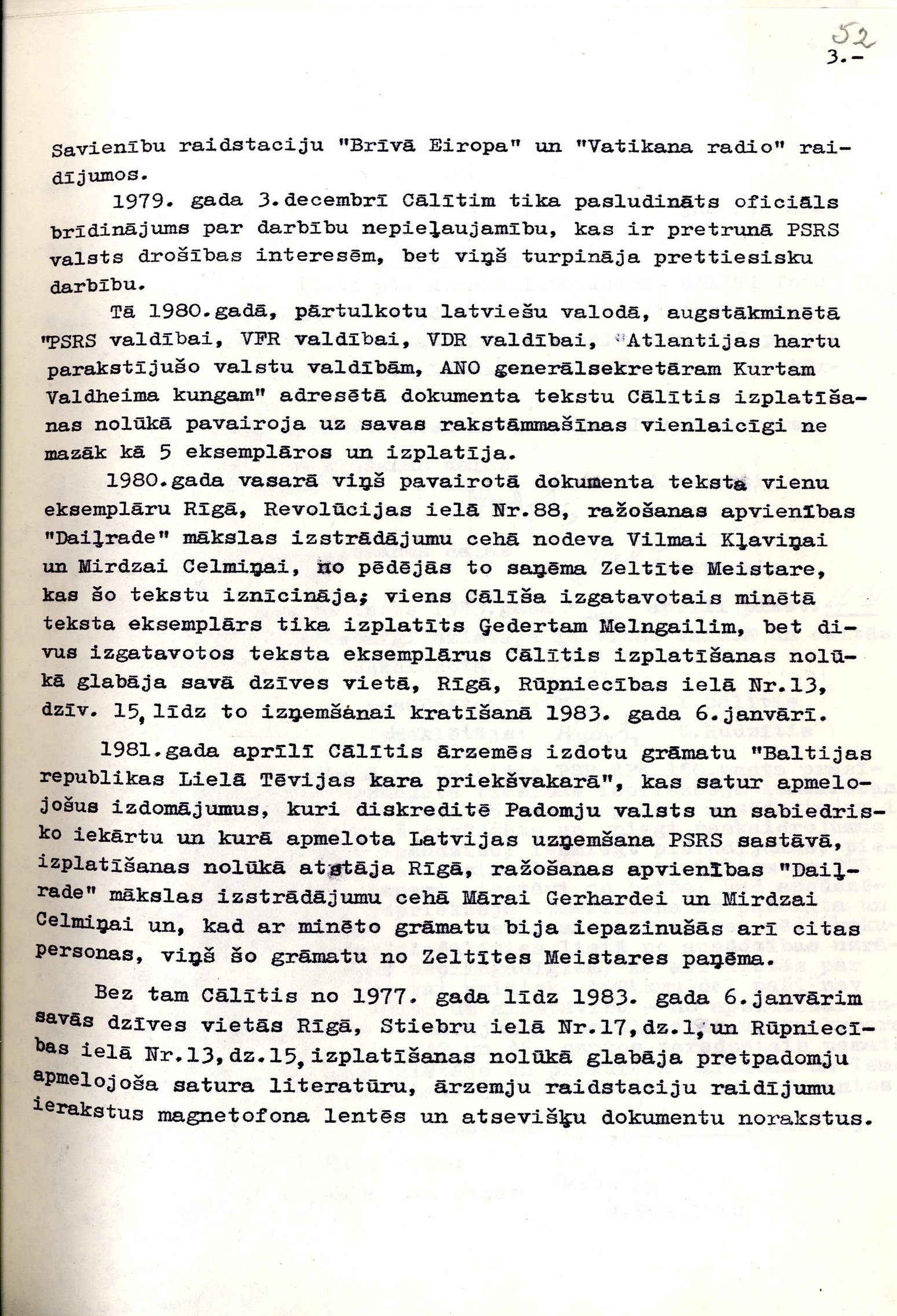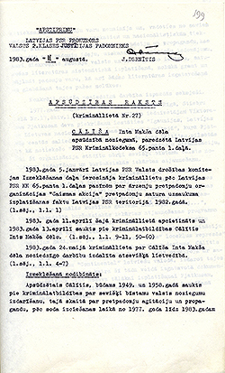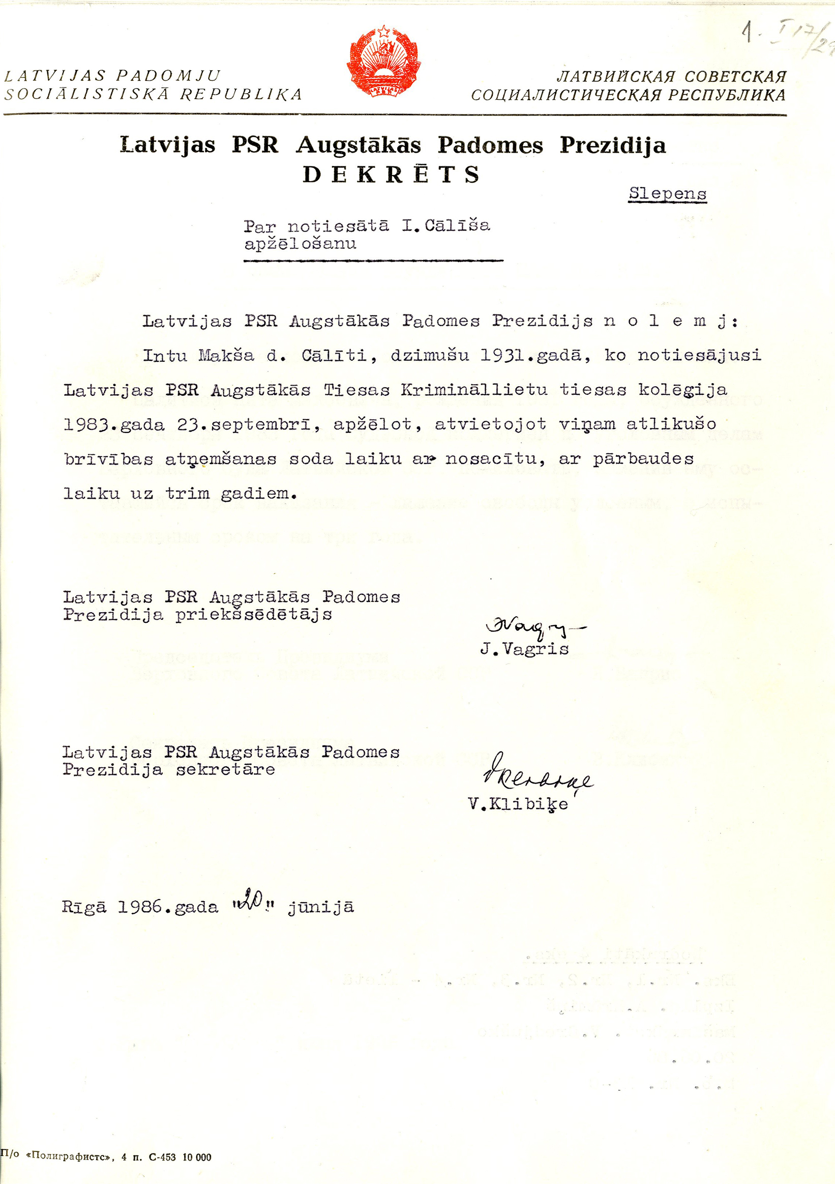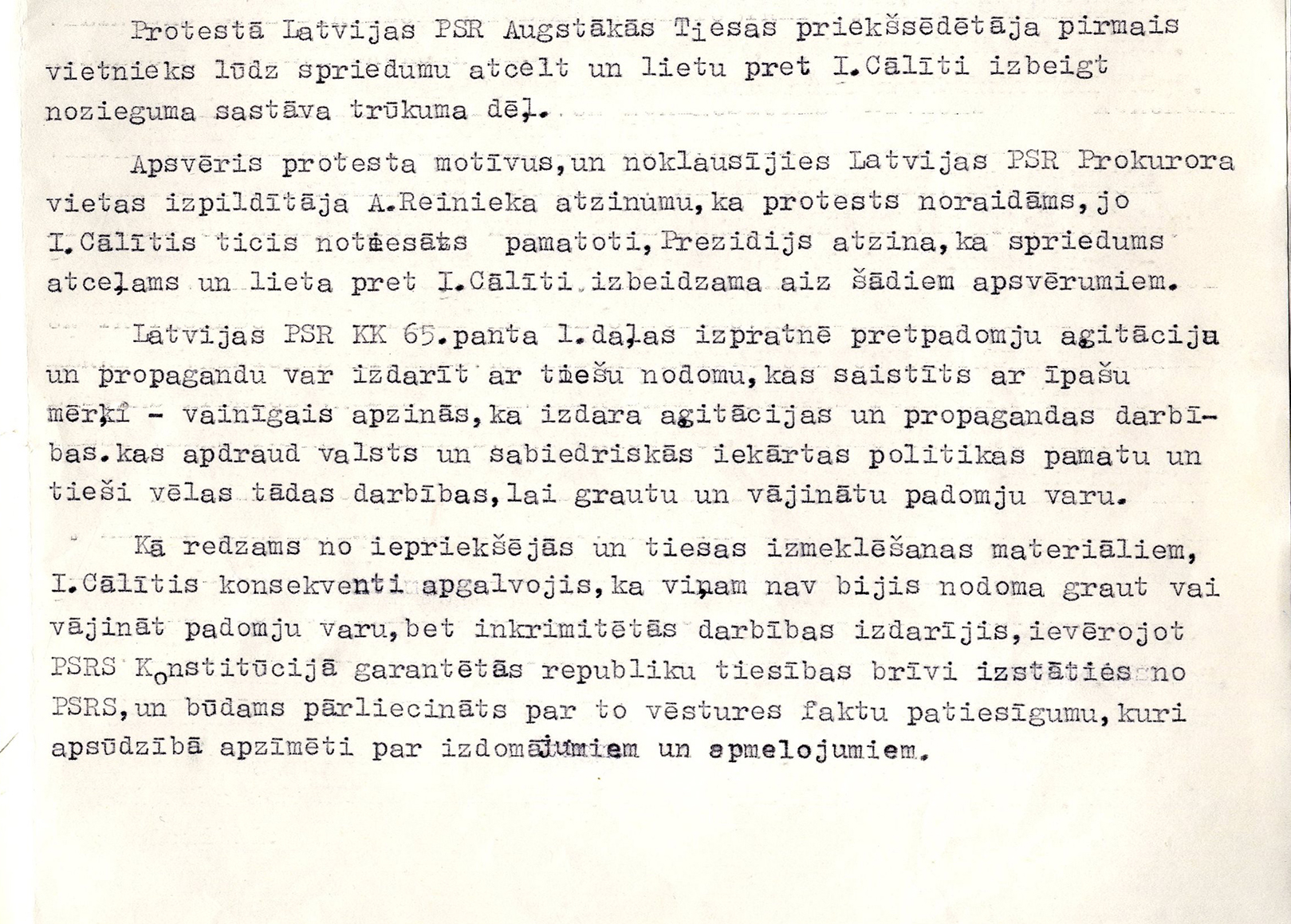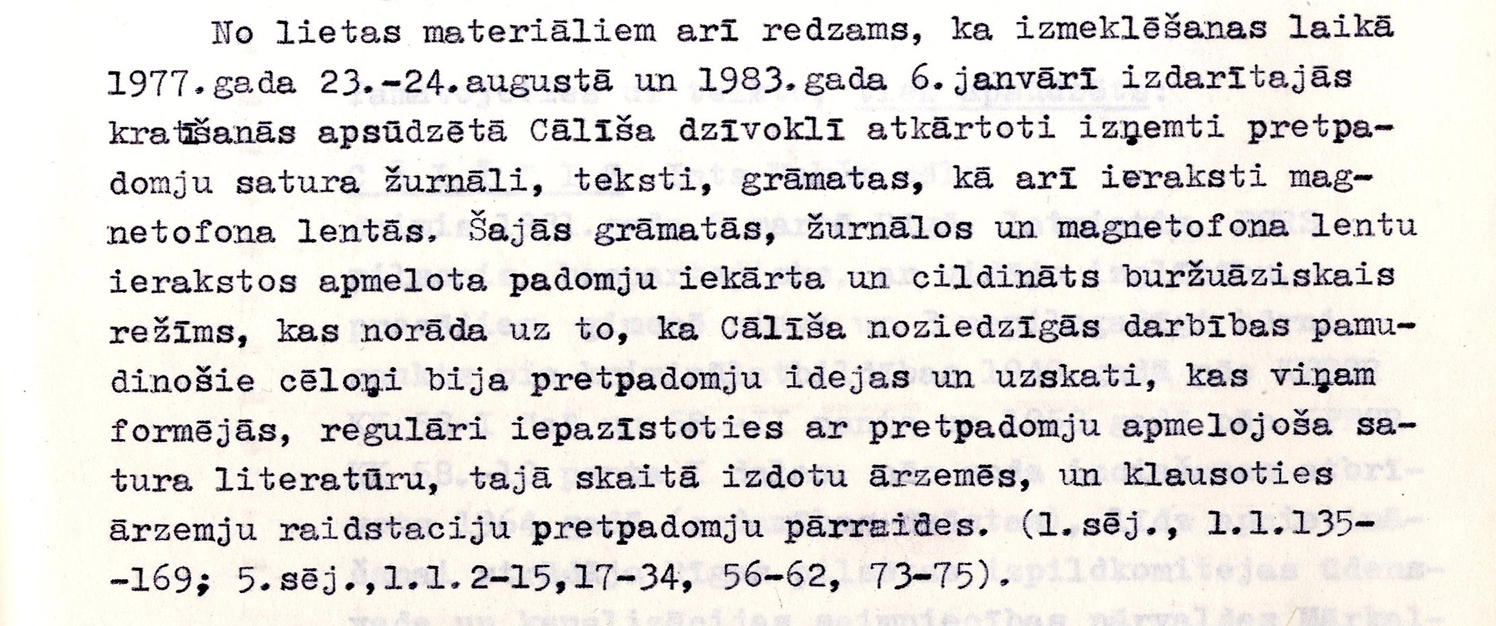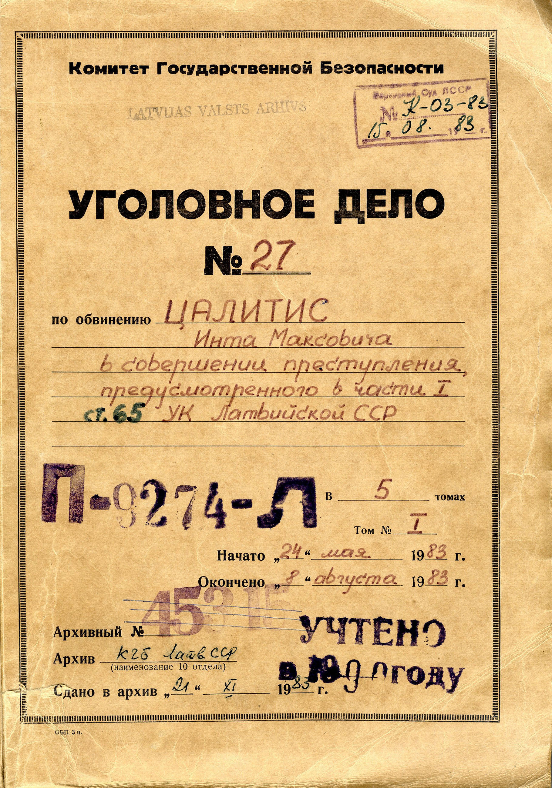 Publicējam 10 dokumentus no 1983. gada krimināllietas pret I. Cālīti, vienu dokumentu no Latvijas PSR Augstākās Padomes prezidija lietas par I. Cālīša apžēlošanu, kā arī uzskaites kartīti par I. Cālīti no Latvijas PSR Iekšlietu ministrijas Informācijas centra kartotēkas.