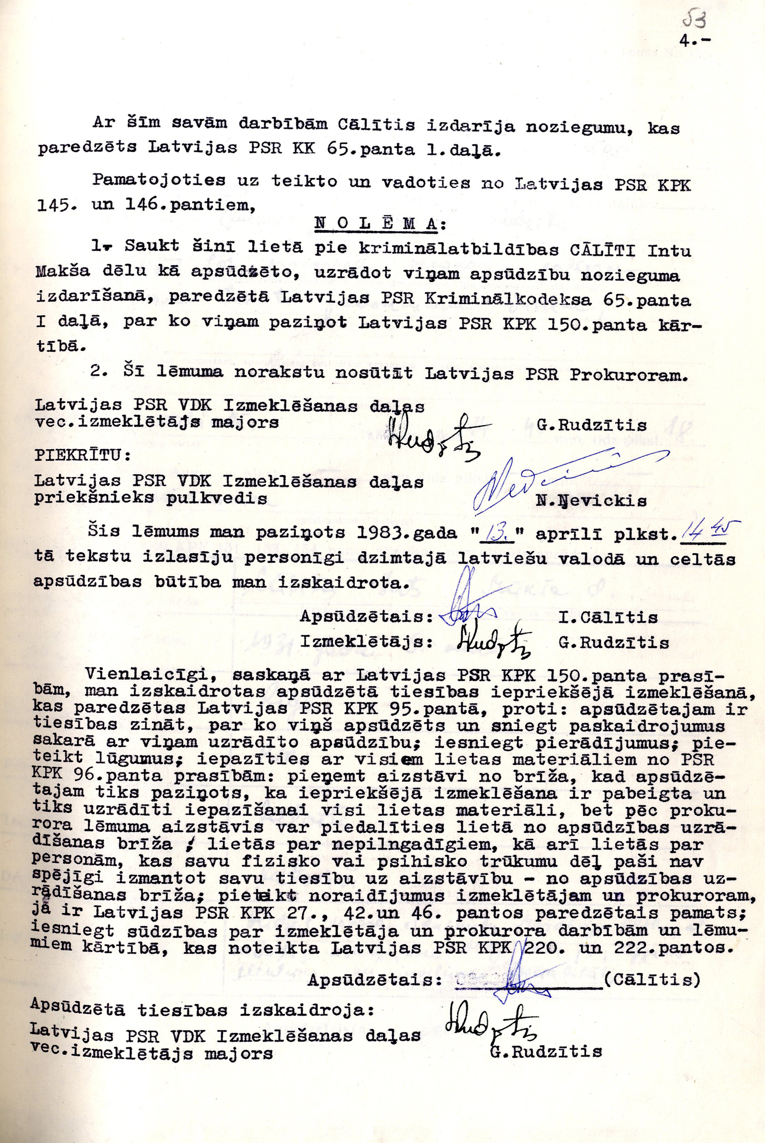 5. Lēmums par Inta Cālīša saukšanu pie kriminālatbildības. 1983. gada 13. aprīlis.