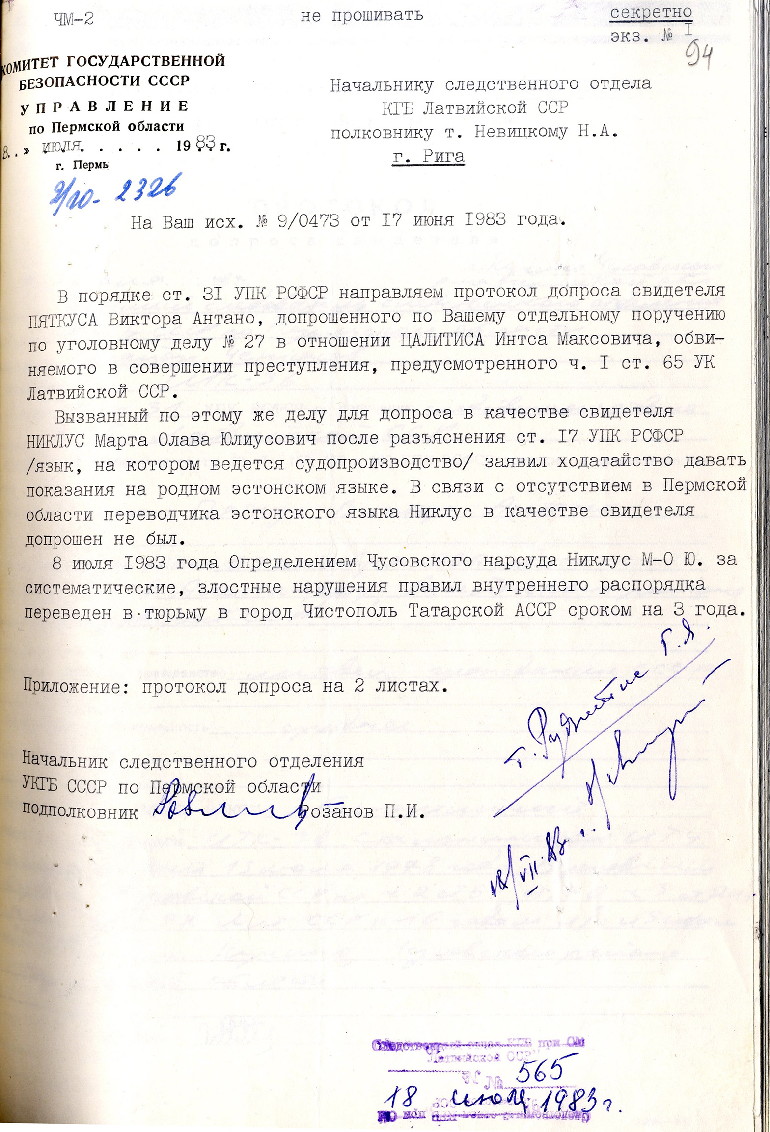 I. Cālīša lietas izmeklēšanas laikā 1983. gada 17. jūnijā Latvijas PSR VDK nosūtīja uz Permas apgabala un Magadanas apgabala VDK pārvaldēm vēstules ar pieprasījumu nopratināt vairākus I. Cālīša domubiedrus no Igaunijas un Lietuvas – Martu Niklusu, Viktoru Petku un Antanu Terlecku. Viņi bija notiesāti jau 70. gadu beigās – 80. gadu sākumā un izcieta ieslodzījumu minēto apgabalu "labošanas darbu nometnēs". Kā redzams no šā dokumenta, M. Nikluss piekrita liecināt tikai savā dzimtajā valodā un, tā kā Permas apgabalā nebija igauņu – krievu valodas tulka, VDK no viņa nekādas liecības iegūt nespēja. No dokumenta teksta pēdējās rindkopas redzams, ka vēlmi liecināt tikai savā dzimtajā valodā nometnes administrācija interpretēja kā ″sistemātiskus, ļaunprātīgus iekšējās kārtības noteikumu pārkāpumus″ un tajā pat dienā Čusovas ″tautas tiesa″ nolēma M. Niklusu uz 3 gadiem ieslodzīt Čistopoles cietumā, kura režīms bija vēl smagāks kā režīms padomju ″labošanas darbu nometnēs″. Savukārt V. Petkus vispār atteicās no liecināšanas pret I. Cālīti, bet A. Terlecks paziņoja, ka viņam par I. Cālīša aktivitātēm nekas nav zināms. Līdz ar to VDK mēģinājumi iegūt ″pierādījumus″ pret I. Cālīti no viņa domubiedriem beidzās bez rezultātiem.