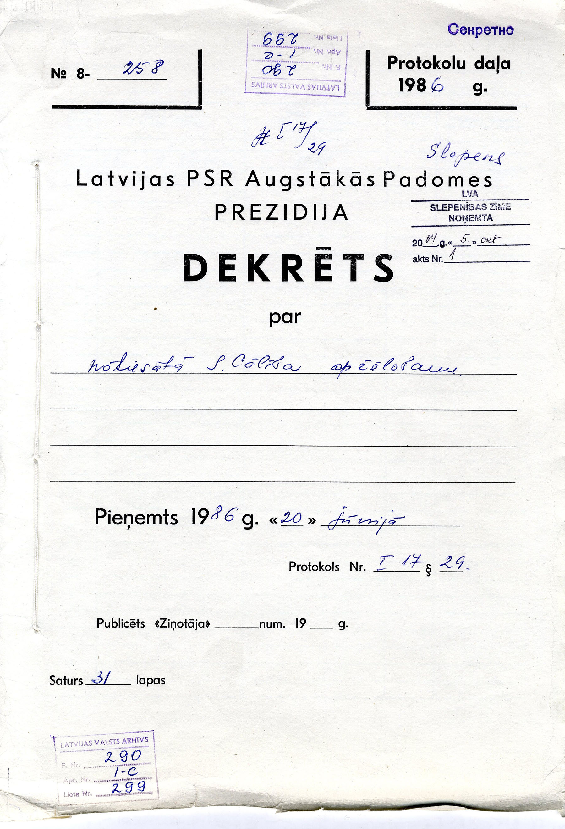 10. Latvijas PSR Augstākās Padomes prezidija dekrēts par Inta Cālīša apžēlošanu. 1986. gada 20. jūnijs.