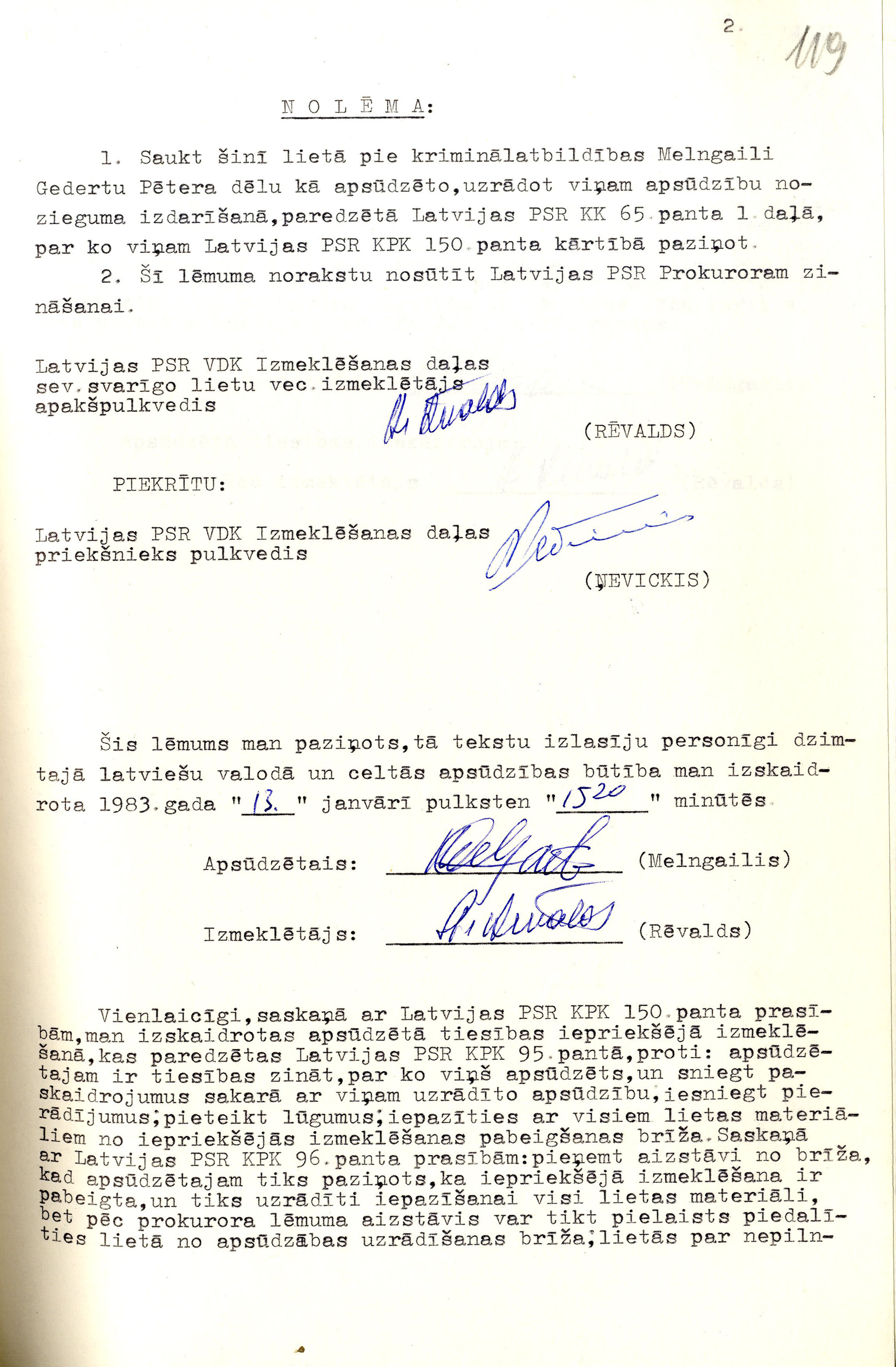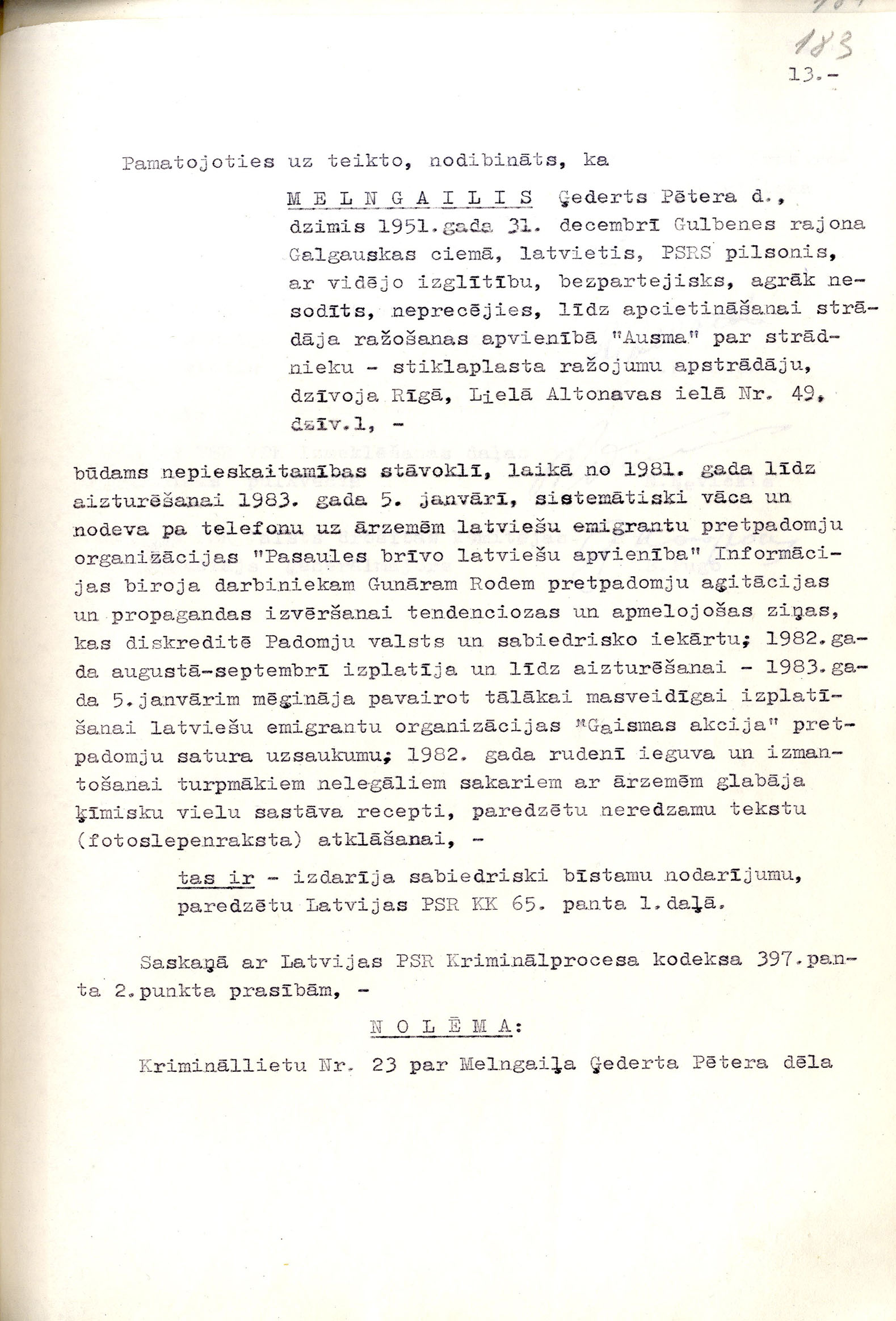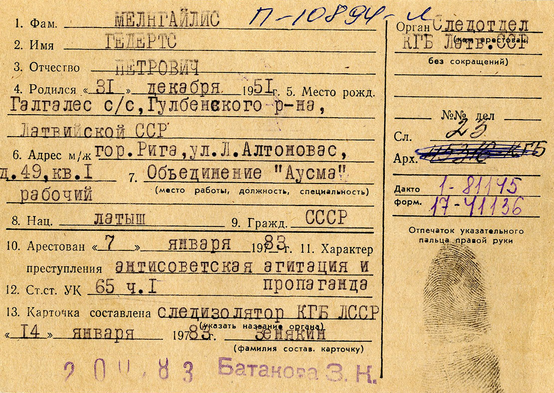 Šajā izstādes sadaļā publicēti 10 dokumenti no 1983. gada krimināllietas pret Ģ. Melngaili, kā arī divas uzskaites kartītes no Latvijas PSR Iekšlietu ministrijas Informācijas centra kartotēkas.