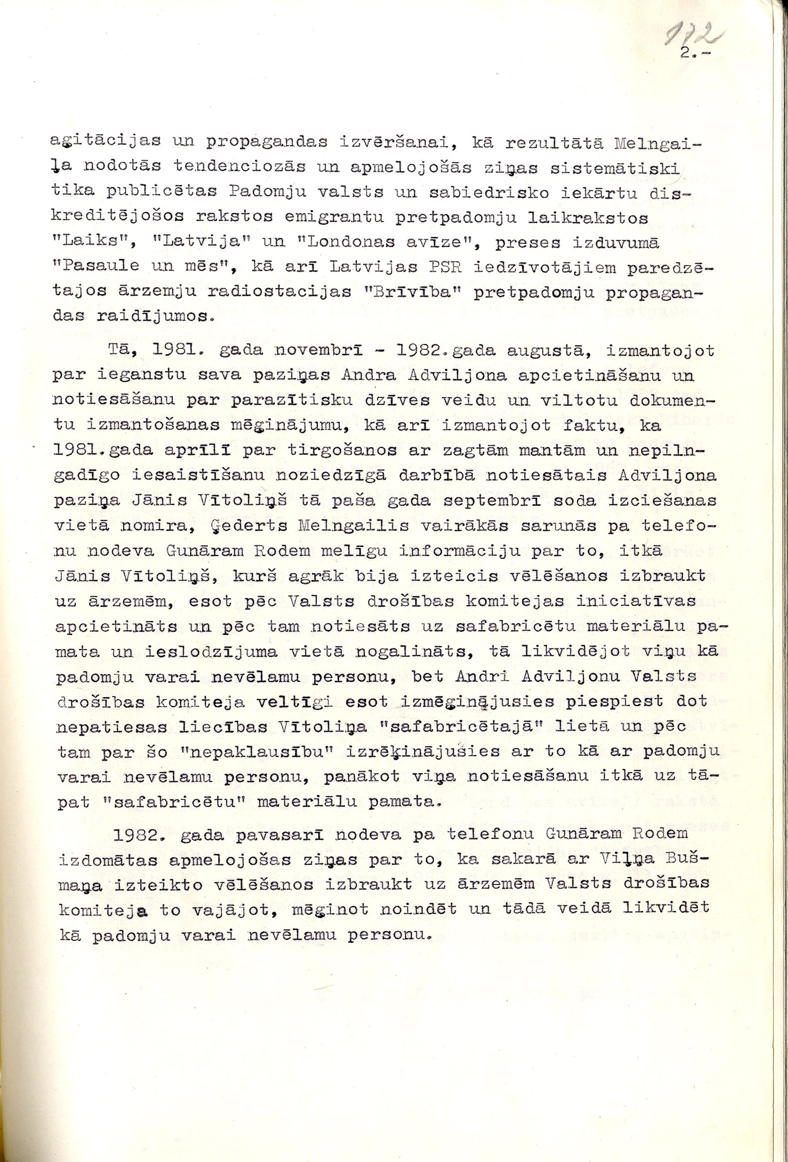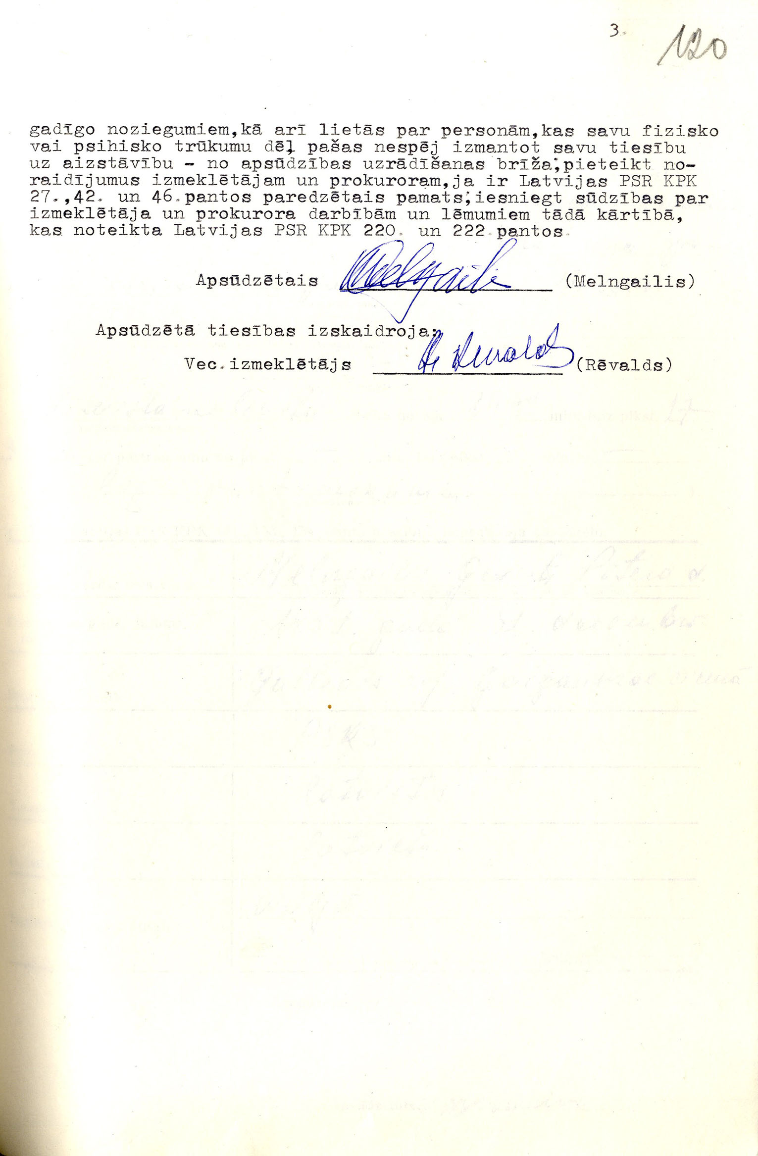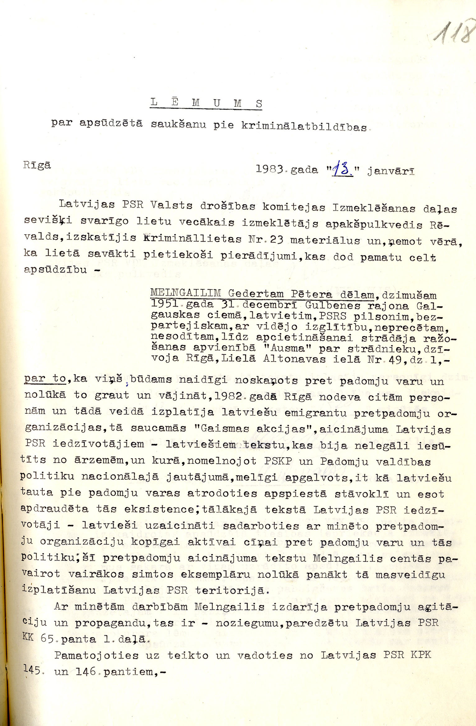 Šajā izstādes sadaļā publicēti 10 dokumenti no 1983. gada krimināllietas pret Ģ. Melngaili, kā arī divas uzskaites kartītes no Latvijas PSR Iekšlietu ministrijas Informācijas centra kartotēkas.