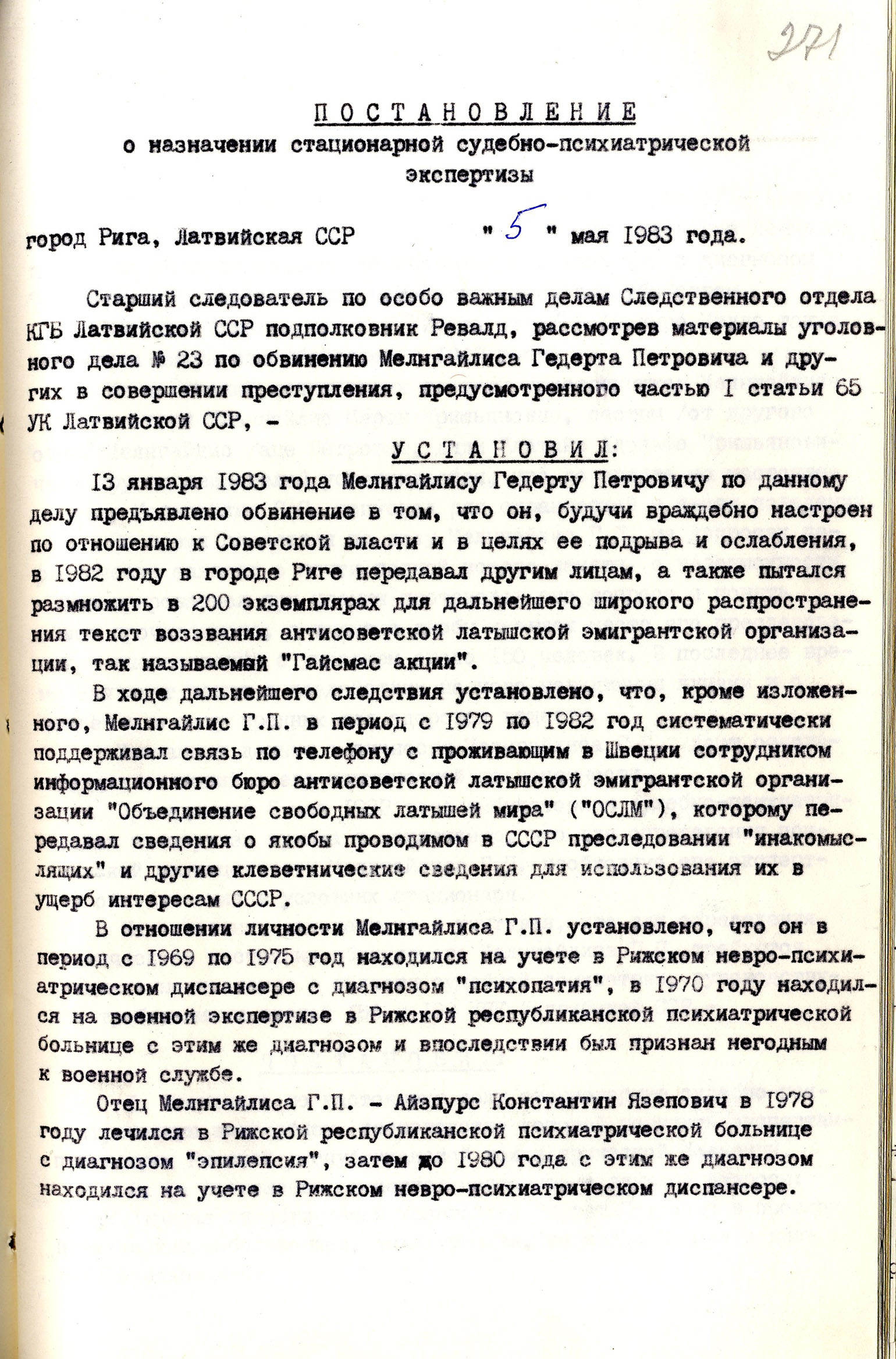6. Lēmums par stacionārās tiesu psihiatriskās ekspertīzes nozīmēšanu Ģedertam Melngailim. 1983. gada 5. maijs.