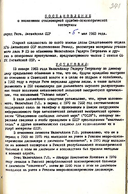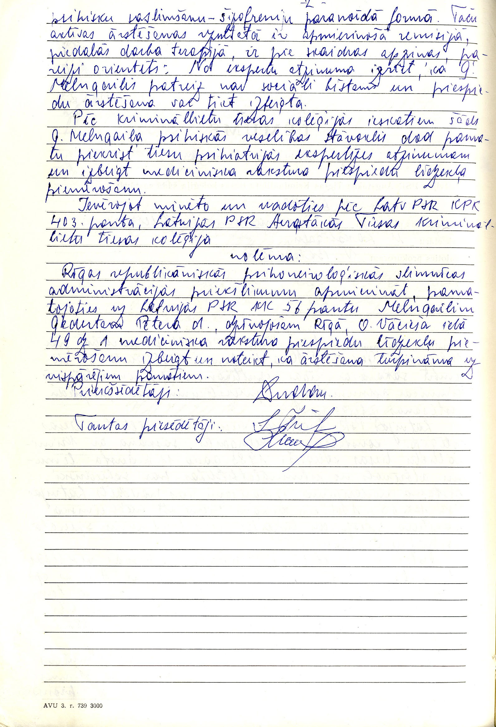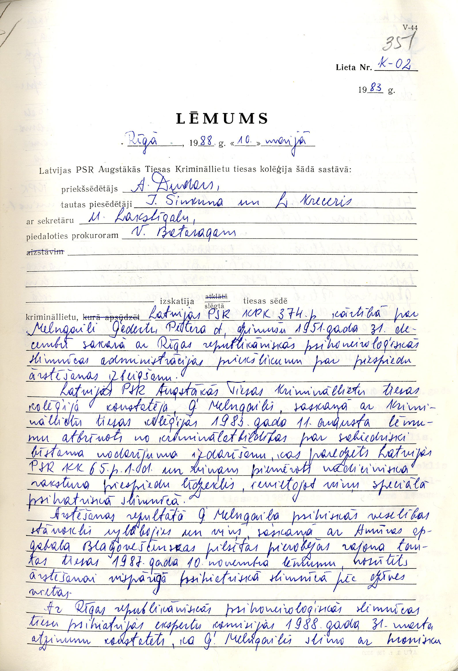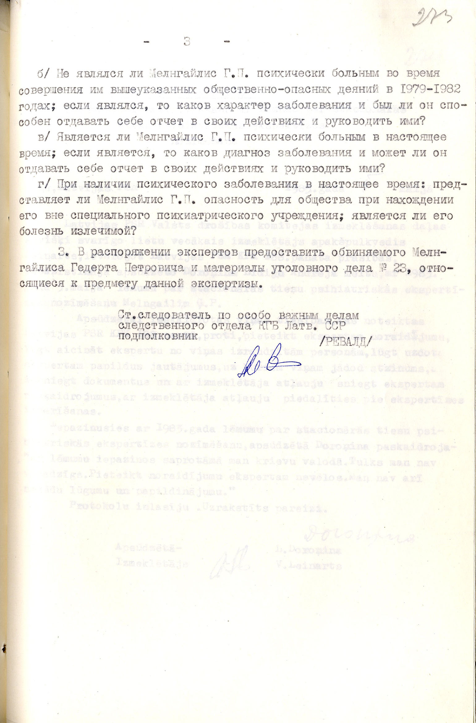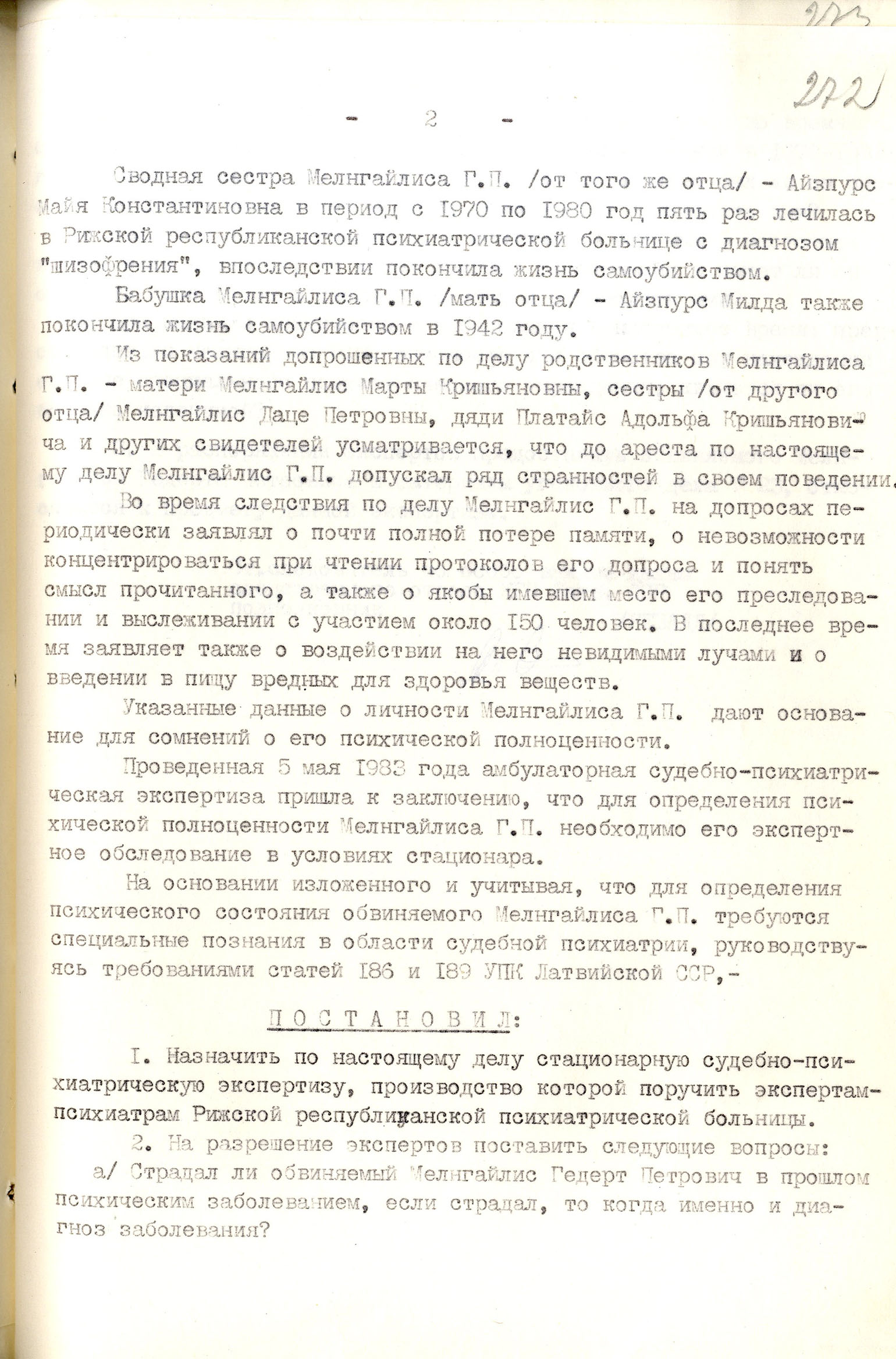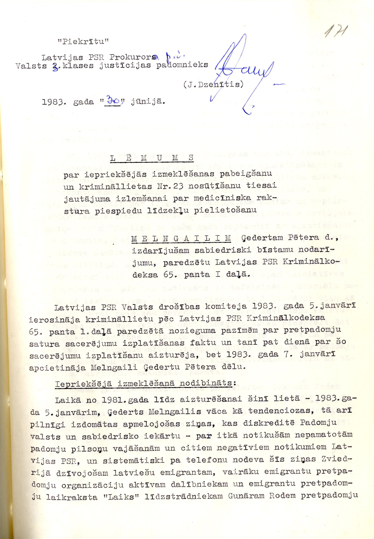7. Fragmenti no lēmuma par iepriekšējās izmeklēšanas pabeigšanu un medicīniska rakstura piespiedu līdzekļu pielietošanu Ģedertam Melngailim. 1983. gada 28. jūnijs.