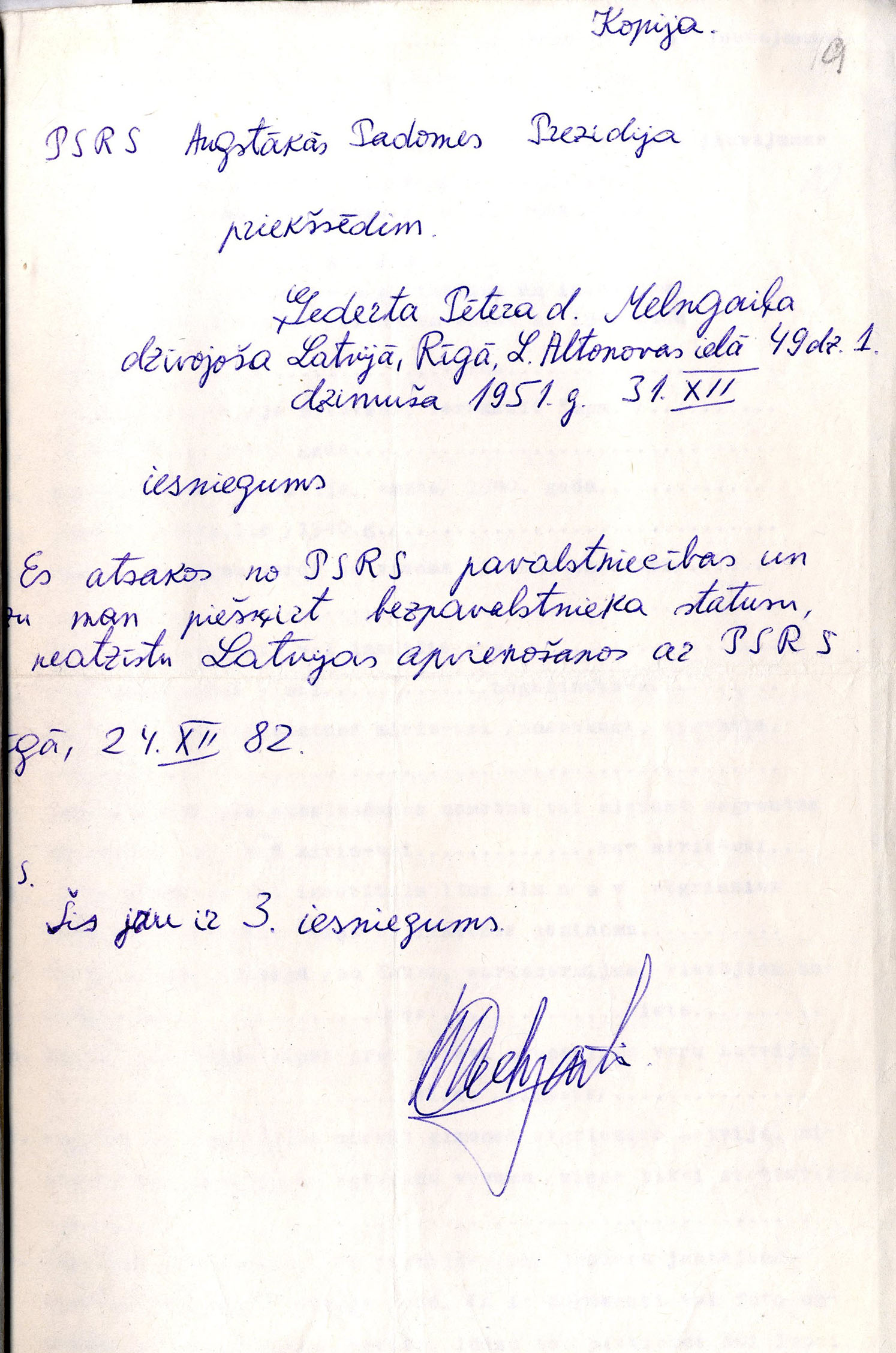 1982. gadā Ģ. Melngailis bija uzrakstījis iesniegumu PSRS Augstākās Padomes prezidija priekšsēdētājam, kurā atteicās no PSRS pilsonības. Dokumenta labās puses augšējā stūrī ir atzīme ″kopija″. Šajā gadījumā tā ir paša Ģ. Melngaiļa rakstīta atzīme par to, ka Augstākajai Padomei ir iesniegts šā dokumenta viens eksemplārs, savukārt otru eksemplāru viņš bija saglabājis pie sevis. Uz šā iesnieguma nav nekādas atzīmes, kas liecinātu ka tas ir sasniedzis adresātu. No tā var secināt, ka, lai arī šis iesniegums tika nosūtīts PSRS Augstākās Padomes prezidija priekšsēdētājam pa pastu, visticamāk Latvijas PSR VDK šo vēstuli ″pārtvēra″ jau īsi pēc tās nosūtīšanas un Maskavu tā nav sasniegusi.