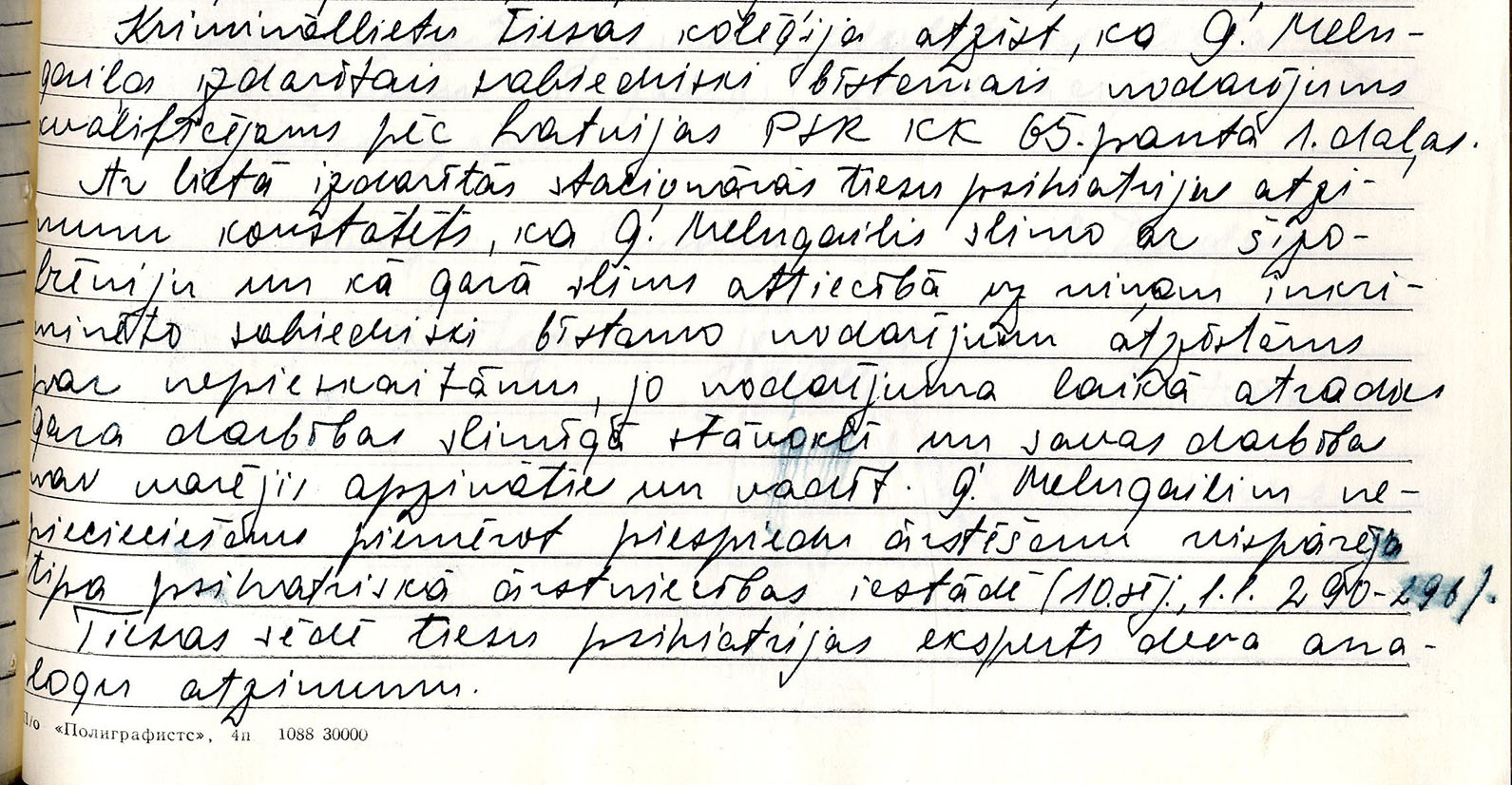 Krimināllietu pret Ģ. Melngaili un L. Doroņinu izskatīja Latvijas PSR Augstākā tiesa slēgtā sēdē. Šeit eksponēti tiesas sēdes protokola fragmenti ar prokurora un advokāta runām. No prokurora runas redzams, ka viņš prasīja Ģ. Melngailim noteikt piespiedu ārstēšanos ″sevišķa režīma ārstniecības iestādē″. Sevišķa režīma psihiatriskās ārstniecības iestādes PSRS pastāvēšanas laikā atradās nevis Veselības aizsardzības ministrijas padotībā, bet gan Iekšlietu ministrijas padotībā un pēc būtības bija ieslodzījuma vietas. Režīms tajās bija ļoti smags un piespiedu ″ārstēšanai″ nereti tika izmantotas tādas metodes, kuru rezultātā pat vesels cilvēks varēja kļūt par invalīdu. Advokāte prasīja par piespiedu ārstēšanas vietu noteikt ″vispārēja režīma psihiatrisku slimnīcu″, tā cenšoties atvieglot Ģ. Melngaiļa piespiedu ārstēšanas apstākļus, jo ″vispārēja režīma psihiatriskā slimnīcā″, salīdzinājumā ar sevišķa režīma iestādēm, režīms bija ″maigāks″.
