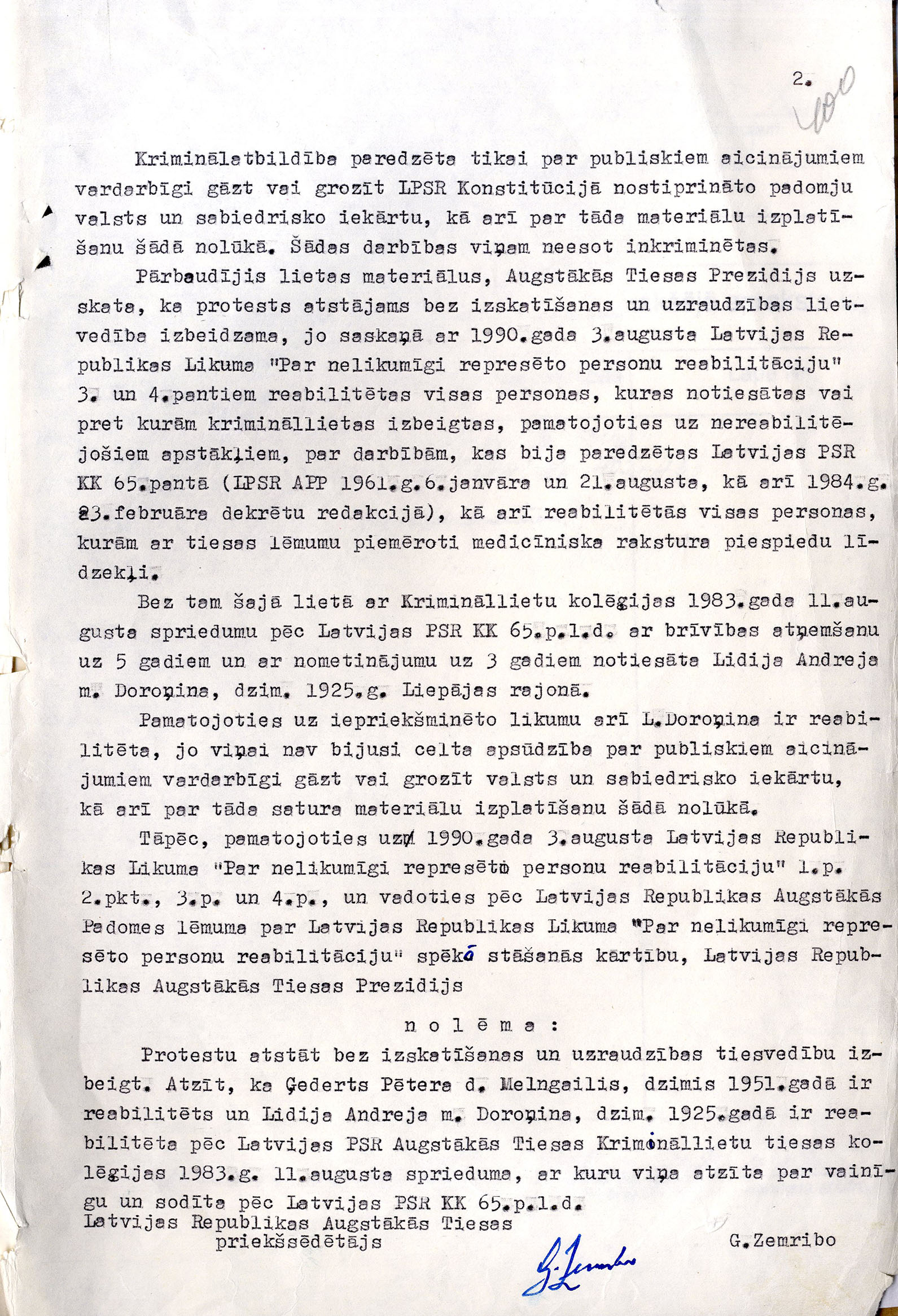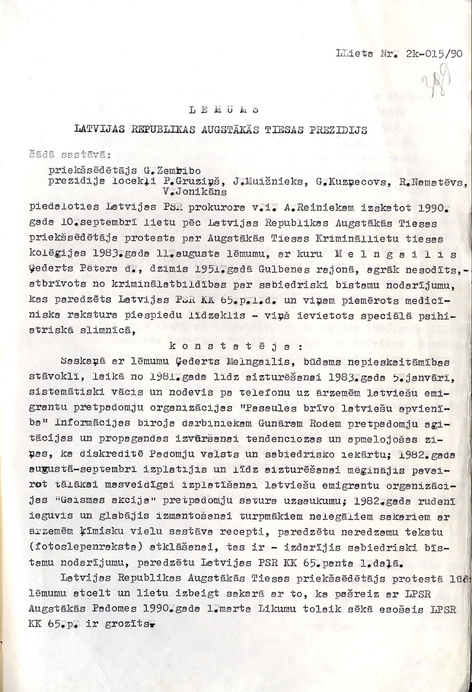 Dokuments nav datēts, taču Ģ. Melngaiļa uzskaites kartītē (sk. nākamo dokumentu) minēts, ka šis lēmums pieņemts 1990. gada 10. septembrī. 1990. gada 28. jūnijā Latvijas Republikas Augstākās tiesas priekšsēdētājs G. Zemribo iesniedza protestu LR Augstākās tiesas prezidijam, kurā prasīja atcelt Latvijas PSR Augstākās tiesas Krimināllietu tiesas tiesas kolēģijas 1983. gada 11. augusta lēmumu Ģ. Melngaiļa lietā un pašu lietu izbeigt. Taču tā kā 1990. gada 3. augustā LR Augstākā Padome pieņēma likumu ″Par nelikumīgi represēto personu reabilitāciju″, tādēļ Latvijas Republikas Augstākās tiesas prezidijs nolēma Ģ. Melngaili atzīt par reabilitējamu.