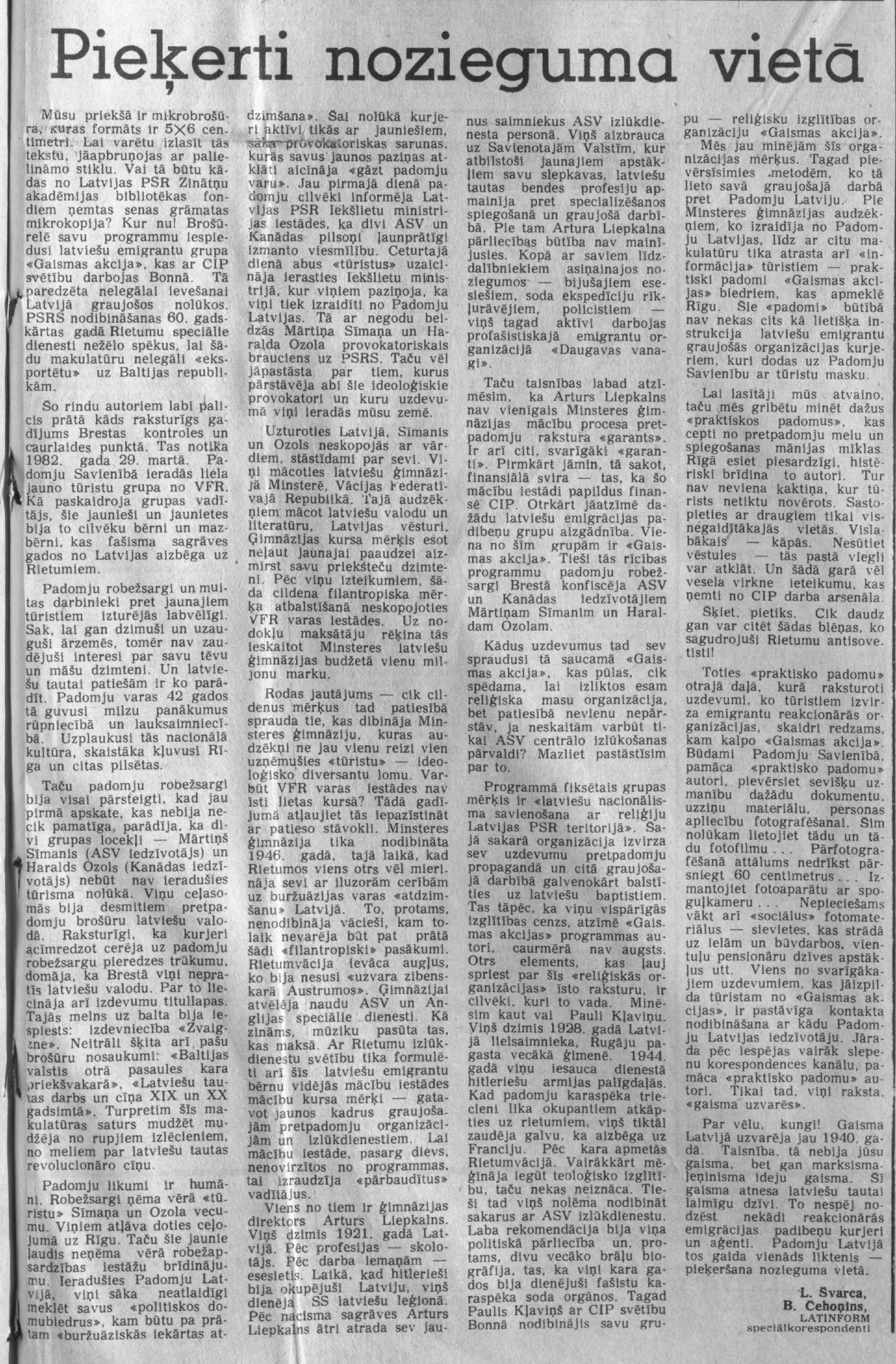 6. L. Švarca un B. Čehoņina raksts ″Pieķerti nozieguma vietā″. 1982. gada 28. decembris.