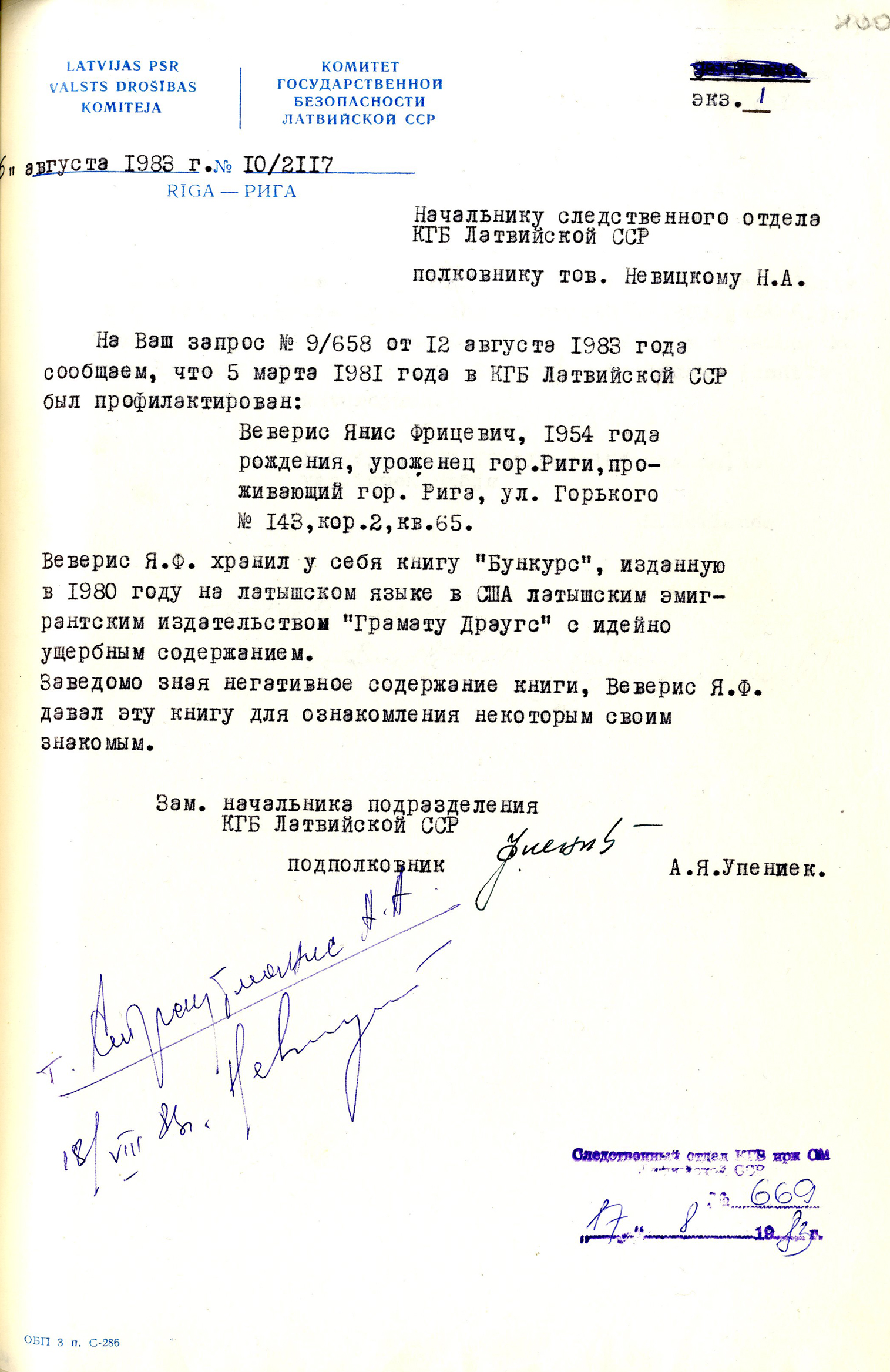 3. Latvijas PSR Valsts Drošības komitejas apakšvienības priekšnieka vietnieka A. Upenieka ziņojums Izmeklēšanas daļas vadītājam N. Ņevickim par Jāņa Vēvera ”profilaktēšanu” 1981. gada 5. martā. 1983. gada 16. augusts.