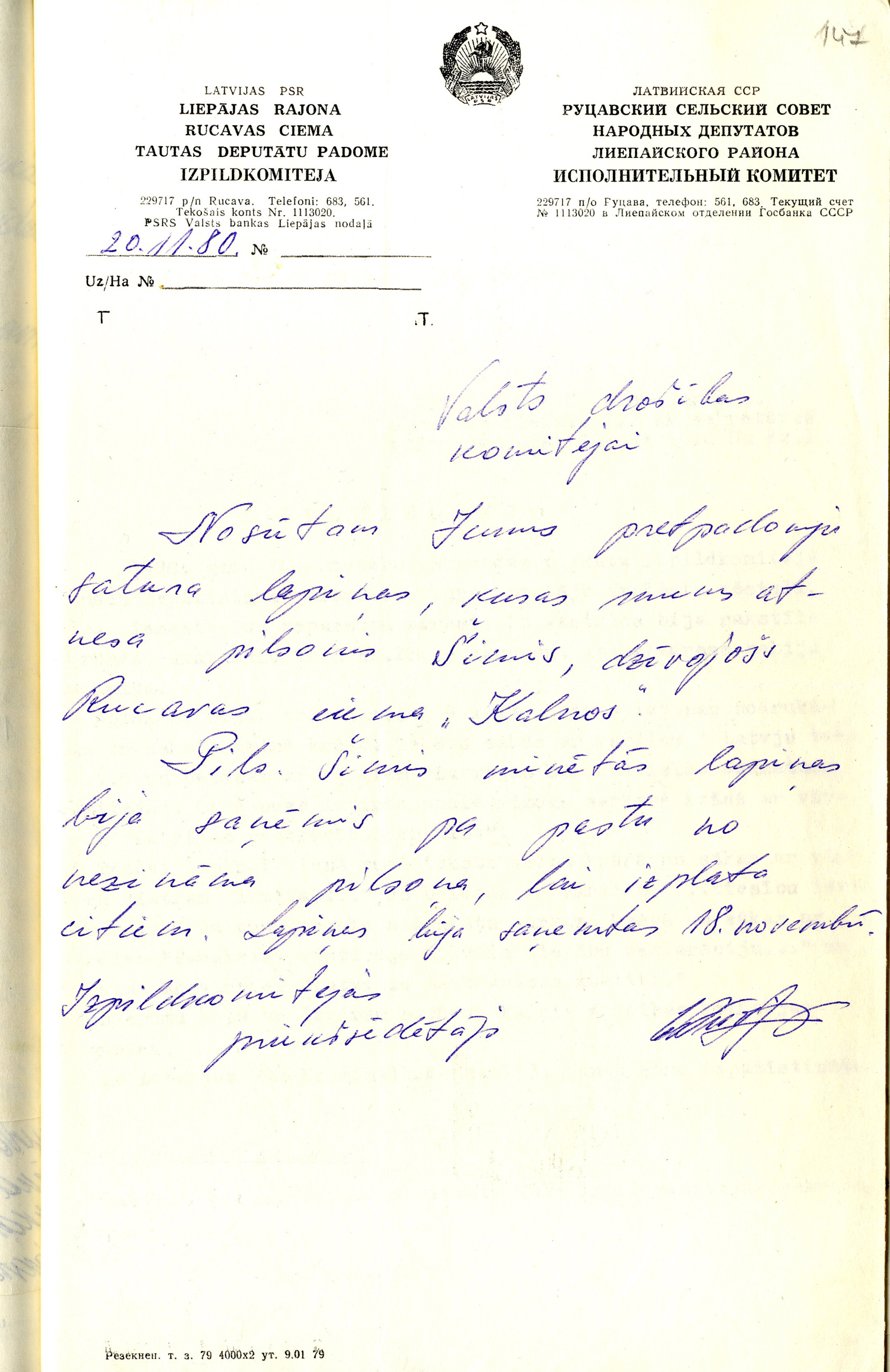 4. Rucavas ciema padomes izpildkomitejas priekšsēdētāja vēstule Valsts Drošības komitejai. 1980. gada 20. novembris.