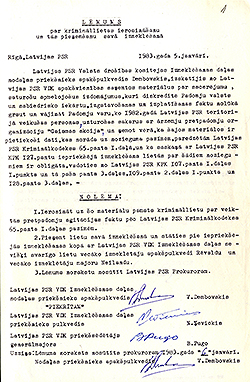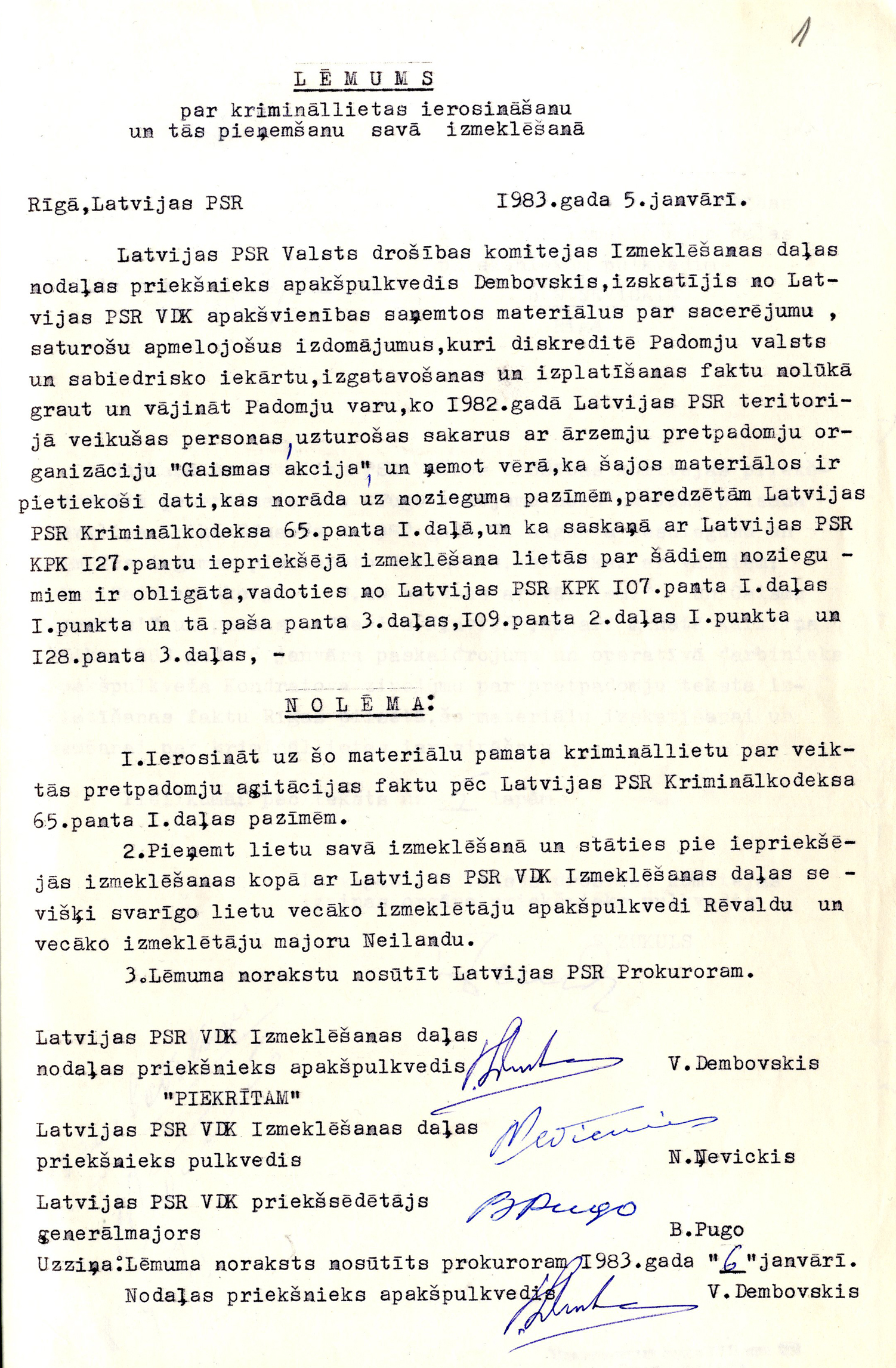 Šis dokuments bija juridiskais pamats, ar kuru sākās varai nevēlamo cilvēku kriminālvajāšana 1983. gadā. Dokumenta oriģināls ir iekļauts krimināllietā pret Lidiju Doroņinu un Ģedertu Melngaili, taču lēmuma kopijas ir iekļautas arī citās tā laika krimināllietās (pret G. Astru, I. Cālīti, G. Freimani, J. Rožkalnu un J. Vēveri), kuras 1983. gada maijā tika izdalītas no šīs janvārī ierosinātās krimināllietas kā atsevišķas lietas. Lēmumos par lietu sadalīšanu minēts, ka sadalītajās lietās apsūdzētās personas ″savā noziedzīgā darbībā″ nav saistītas ar citām šajā lietā pie kriminālatbildības sauktām personām. Šāda argumentācija gan nešķiet pārliecinoša, jo līdz ar to nav saprotams – ja viena daļa no krimināllietas sakarā arestētajām personām nav saistītas ar citām tās pašas krimināllietas sakarā arestētajām personām, tad kādēļ visas šīs personas tomēr ir arestētas vienas krimināllietas ietvaros. Turklāt, šajās sadalītajās lietās atrodami materiāli, kas attiecas uz kādu citu no sadalītajām lietām. Kopumā lietas sadalīšanas rezultātā iznāca, ka šis lēmums faktiski kļuva par pamatu četrām 1983. gada politiskajām prāvām, kurās kopumā tika tiesāti 7 cilvēki. Zīmīgi, ka šajā lēmumā nav nekādas norādes uz VDK Izmeklēšanas daļas priekšnieka N. Ņevicka vēstulē minētajām ″operatīvās izstrādes″ un ″operatīvās pārbaudes″ lietām (sk. 7. dokumentu). Tātad jau kopš paša krimināllietas ierosināšanas sākuma VDK slēpa tās faktiskos ierosināšanas iemeslus.