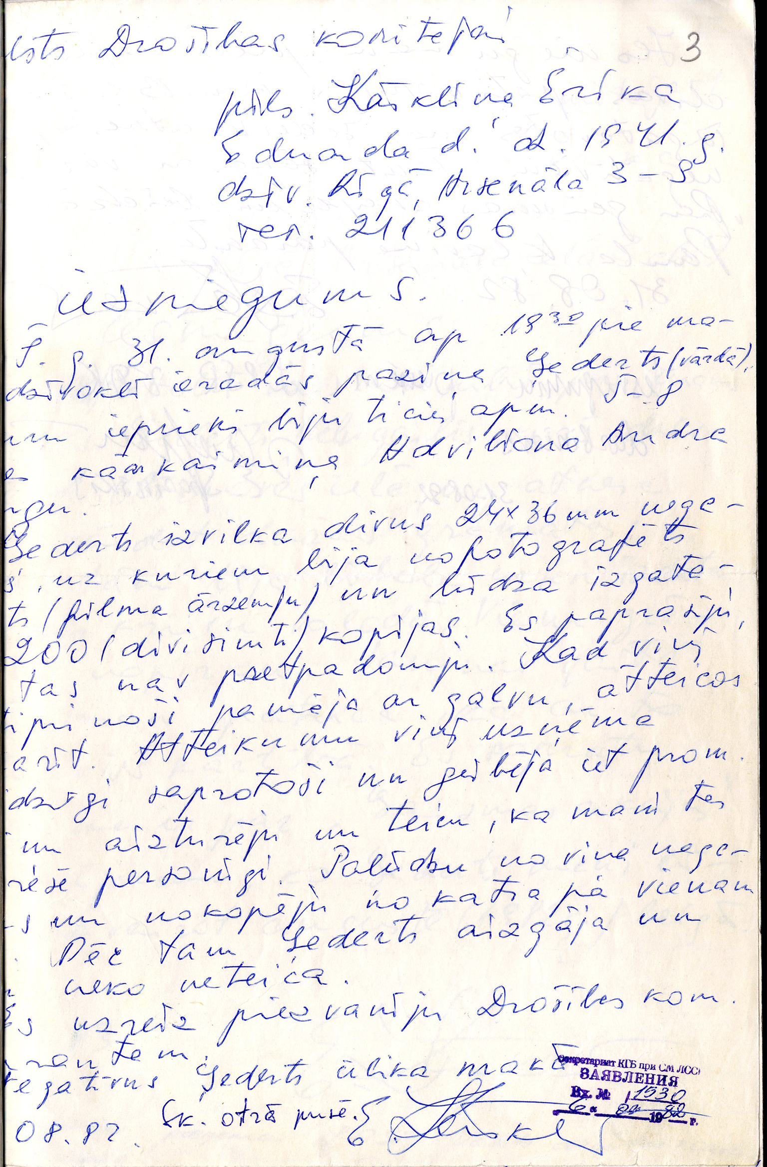 5. Ērika Kārkliņa iesniegums Valsts Drošības komitejai. 1982. gada 31. augusts.