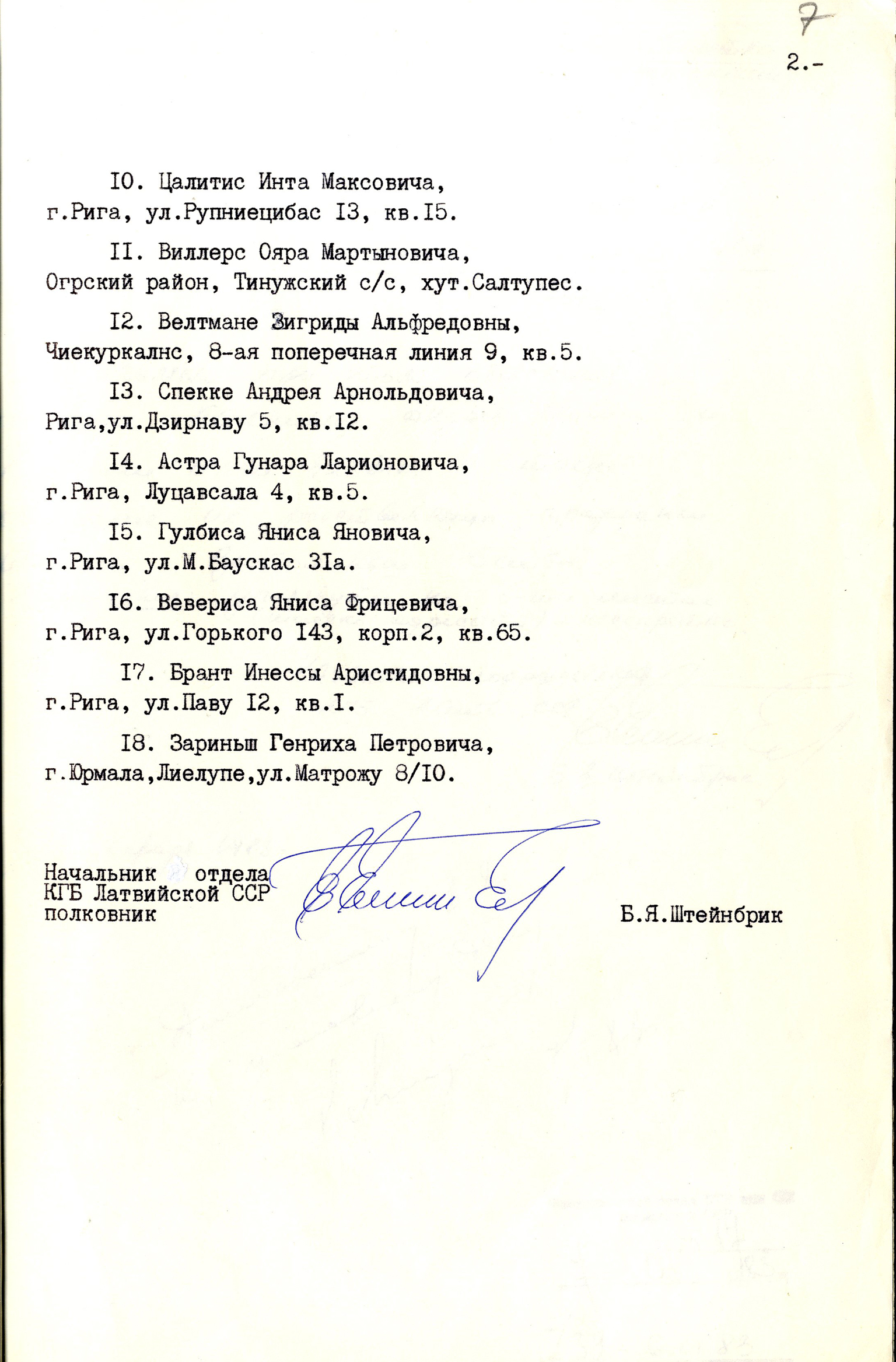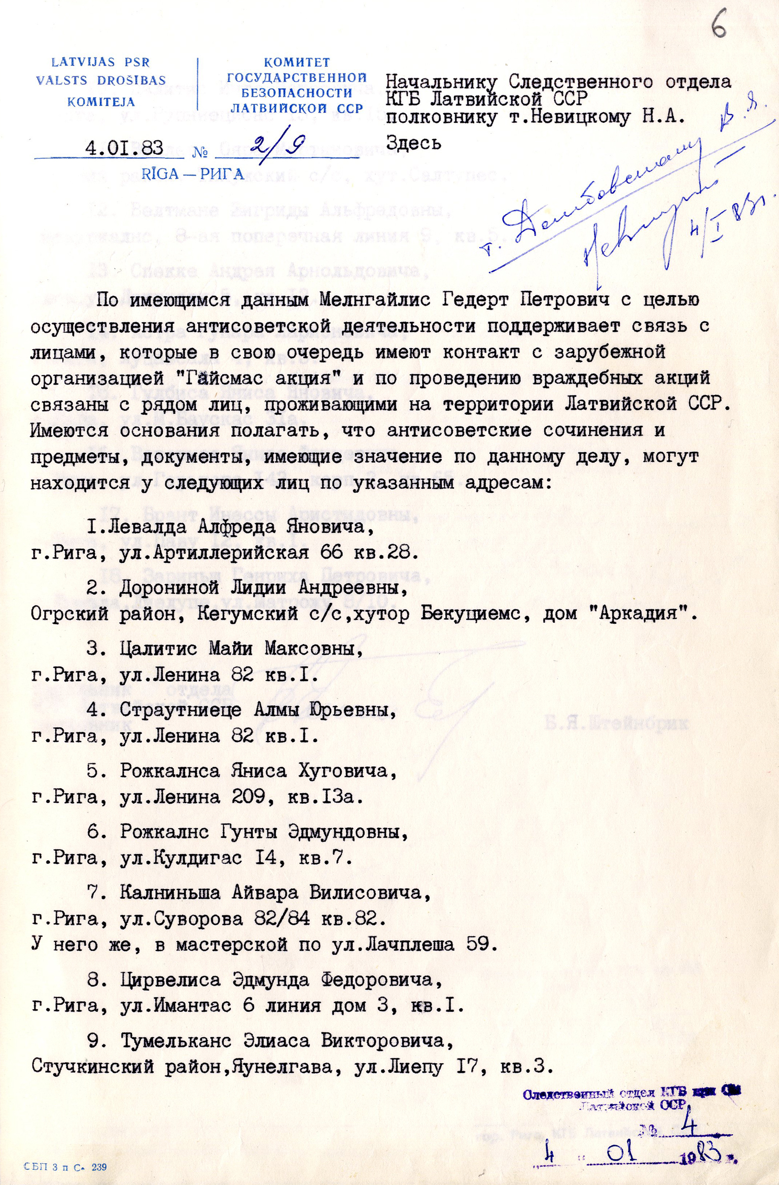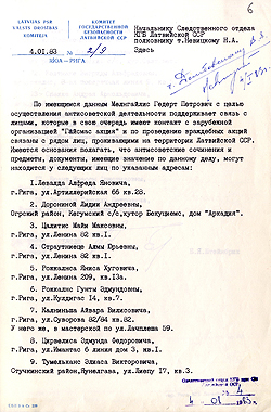 7. Latvijas PSR Valsts Drošības komitejas Izmeklēšanas daļas priekšnieka N. Ņevicka dienesta vēstule Desmitās daļas priekšniekam. 1983. gada 6. janvāris.