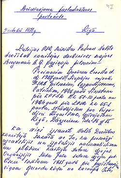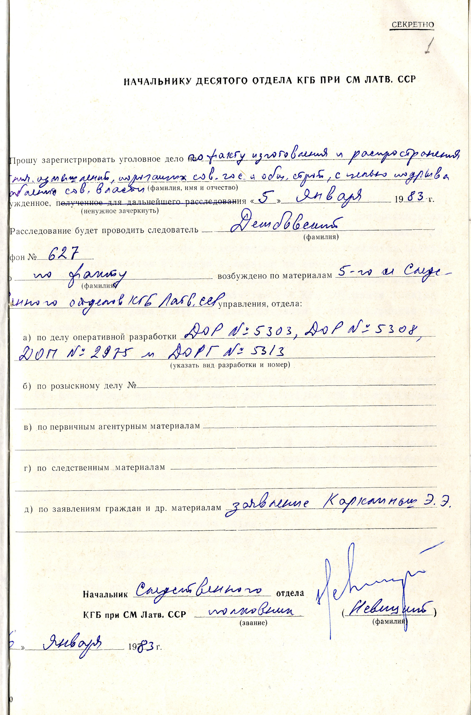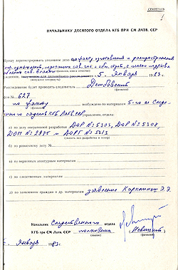 Dokumenta labās puses augšējā stūrī ir atzīme, ka šī vēstule bija slepena. Vēstules uz šādām veidlapām VDK Izmeklēšanas daļas priekšnieks rakstīja VDK Desmitās daļas (Uzskaites un arhīva daļa) priekšniekam un tajās bija minēts lietas ierosināšanas pamats.