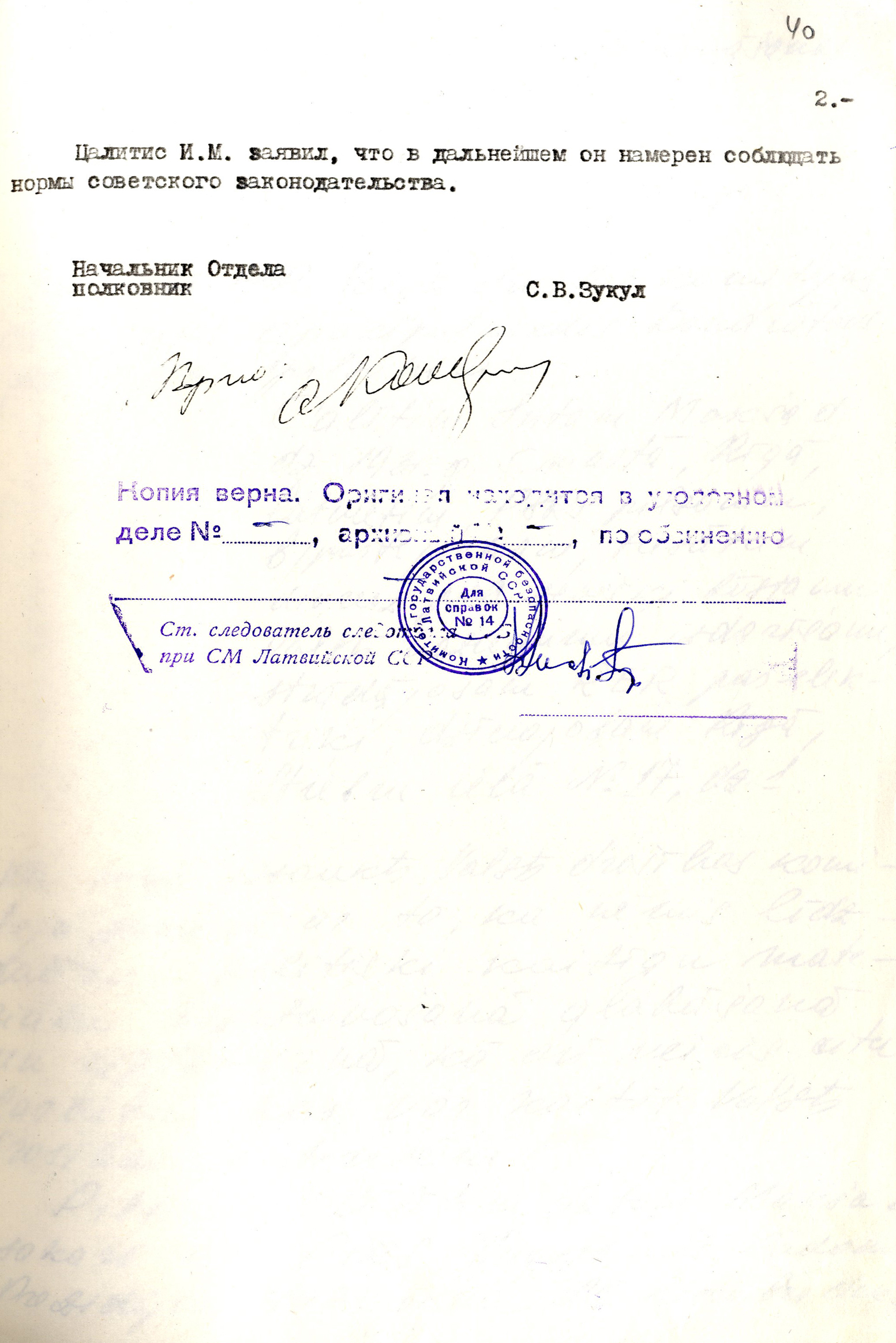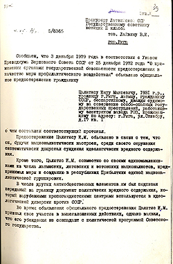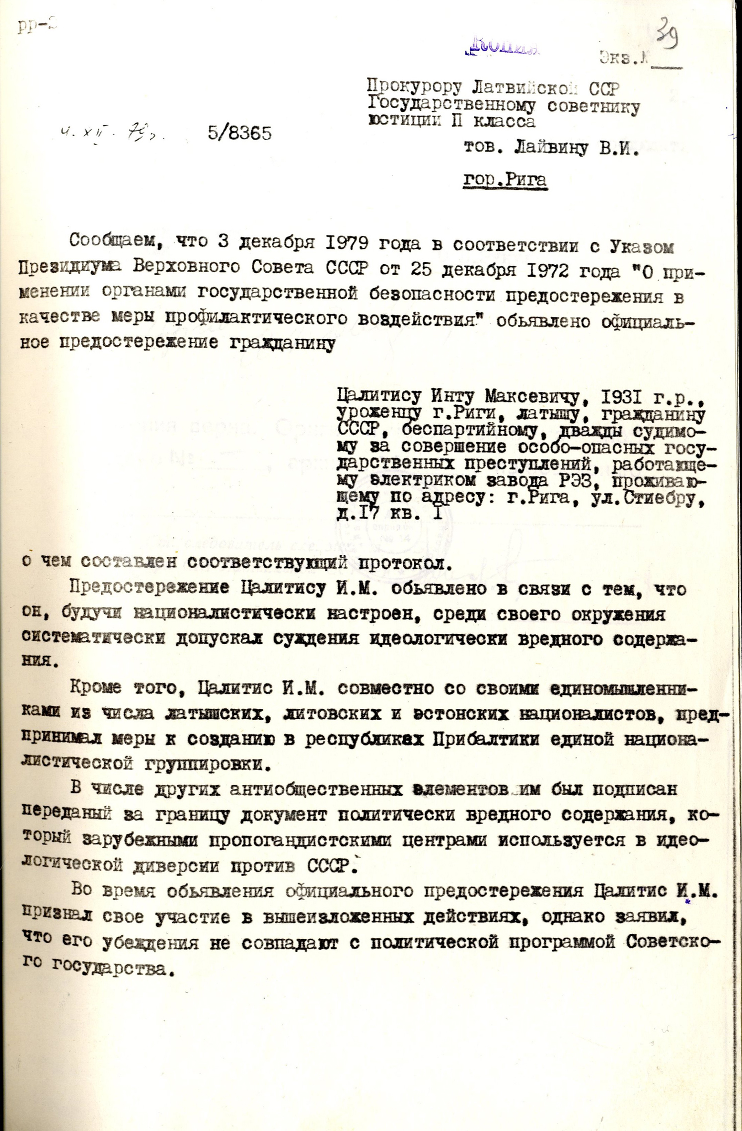 2. Latvijas PSR Valsts Drošības komitejas daļas priekšnieka S. Zukuļa vēstule prokuroram V. Laiviņam par oficiāla brīdinājuma izteikšanu Intam Cālītim 1979. gada 3. decembrī. 1979. gada 4. decembris.