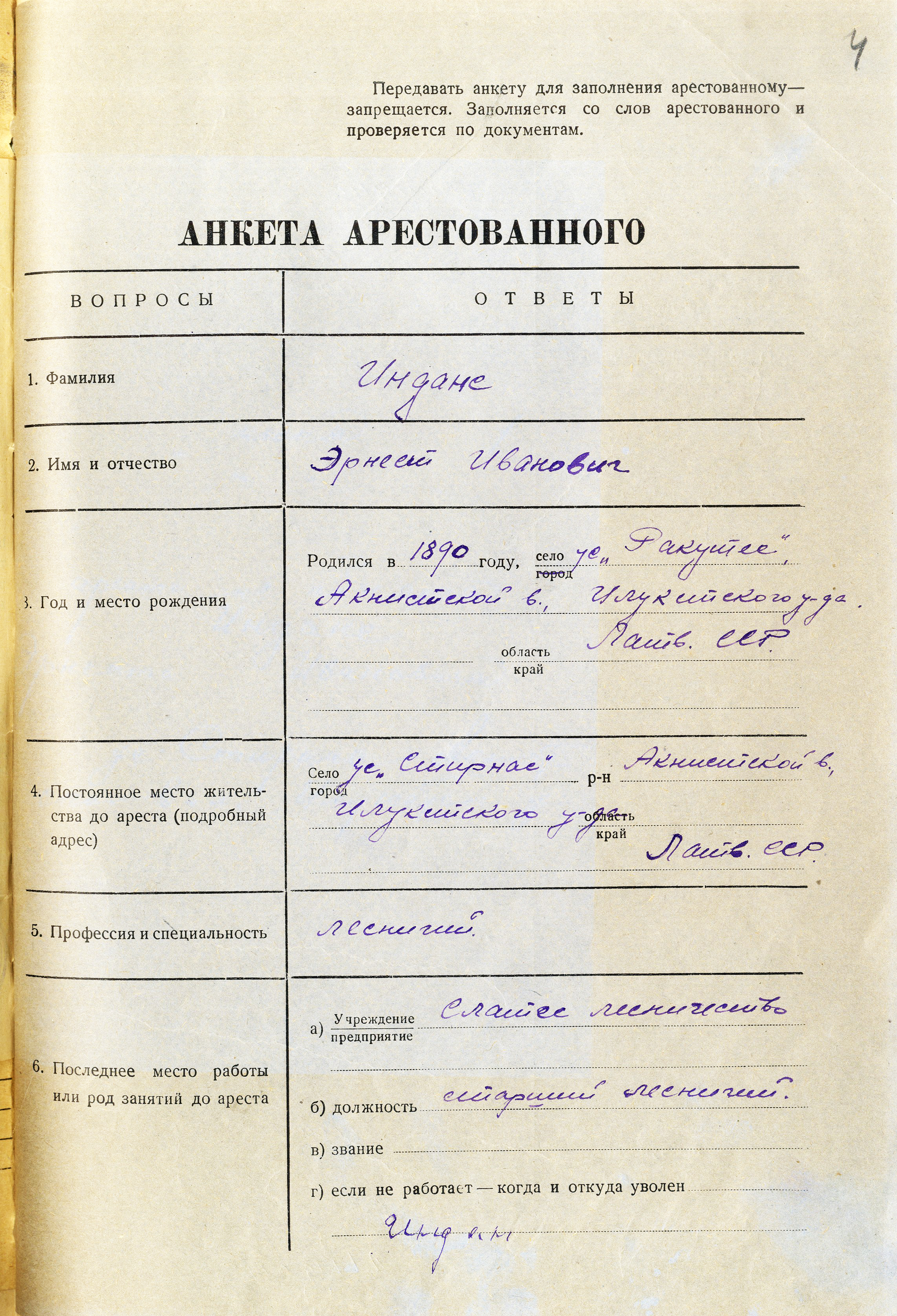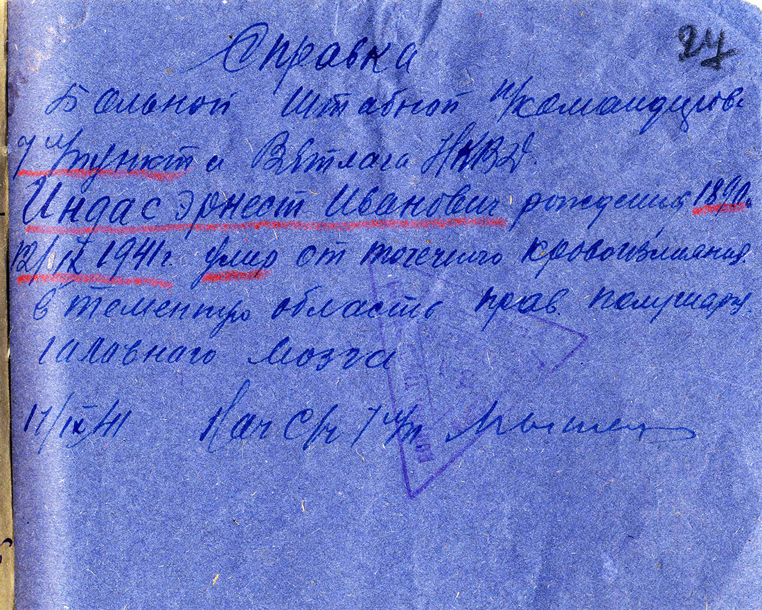 Ernestu Indānu aizsūtīja uz Kirovas apgabalu, Vjatlagu. Miris 12.09.1941.