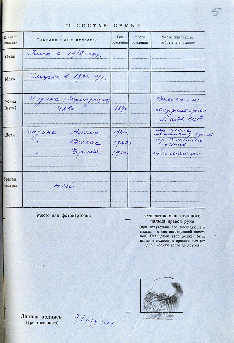 Ernesta Indāna ģimeneIndāns Ernests Jāņa d., dz. 1890, dzīvoja Ilūkstes apriņķa, Aknīstes pagasta Stirnās. Arestēts 14.06.1941., ieslodzīts Vjatlagā. Miris 12.09.1941. Vjatlaga 7. nometnē. LVA, 1987. f., 1. apr. (Ilūkste), 14250. lieta. Sieva Indāne Ieva Jura m., dz. 1890., dzīvoja Ilūkstes apriņķa, Aknīstes pagasta Stirnās. Izsūtīta 14.06.1941. uz Krasnojarskas novada, Ņižņijingašas rajonu. 15.04.1947. atgriezās Latvijā. 19.03.1949. Nosūtīta atpakaļ uz Krasnojarskas novadu. Atbrīvota 07.08.1954. LVA, 1987. f., 1. apr. (Ilūkste), 14250. lieta. Dēls Indāns Vilis Ernesta d., dz. 1923., dzīvoja Ilūkstes apriņķa, Aknīstes pagasta Stirnās. Arestēts 23.06.1941., izsūtīts uz Novosibirskas apgabalu. Miris 16.04.1943. LVA, 1987. f., 1. apr. (Ilūkste), 14250. lieta. Meita Indāne Ērika Ernesta m., dz. 1931, dzīvoja Ilūkstes apriņķa, Aknīstes pagasta Stirnās. Izsūtīta 14.06.1941. uz Krasnojarskas novada, Ņižņijingašas rajonu. Atbrīvota 15.07.1946. LVA, 1987. f., 1. apr. (Ilūkste), 14250. lieta. |