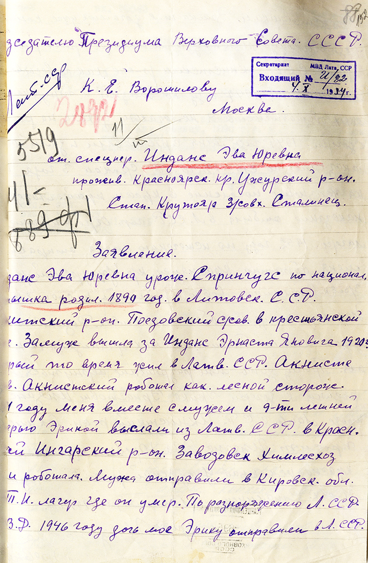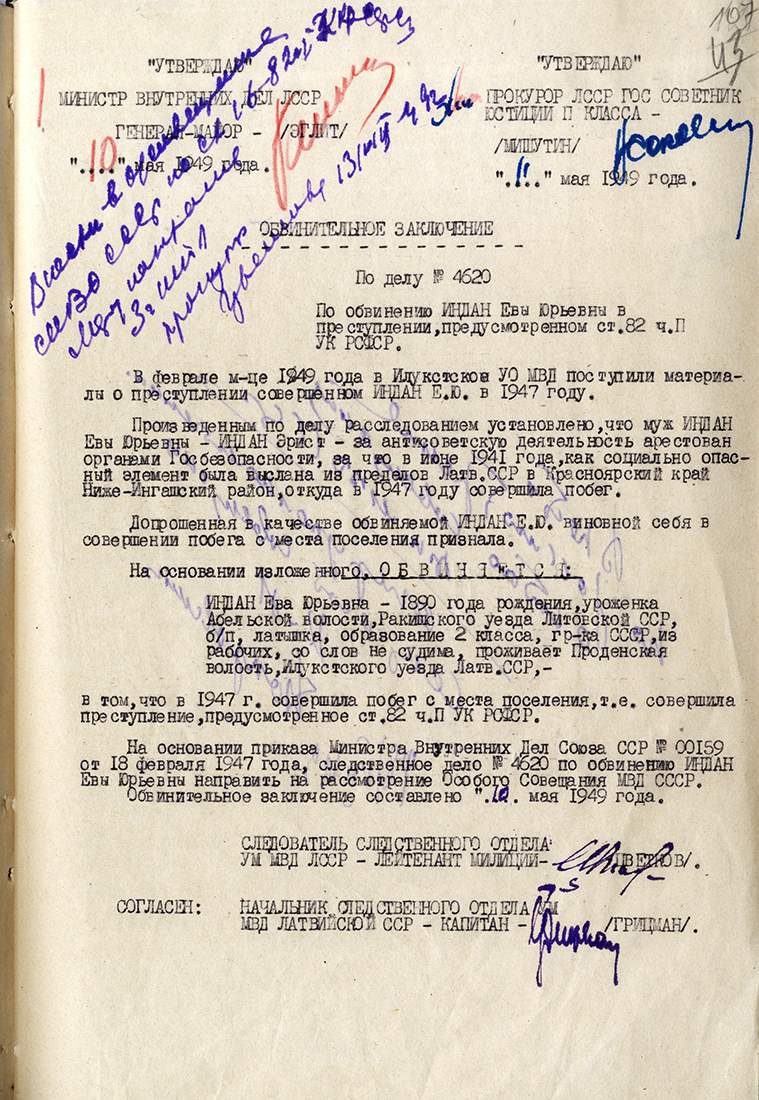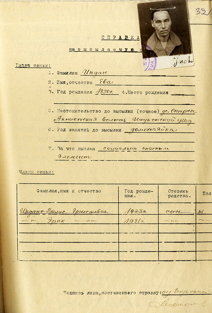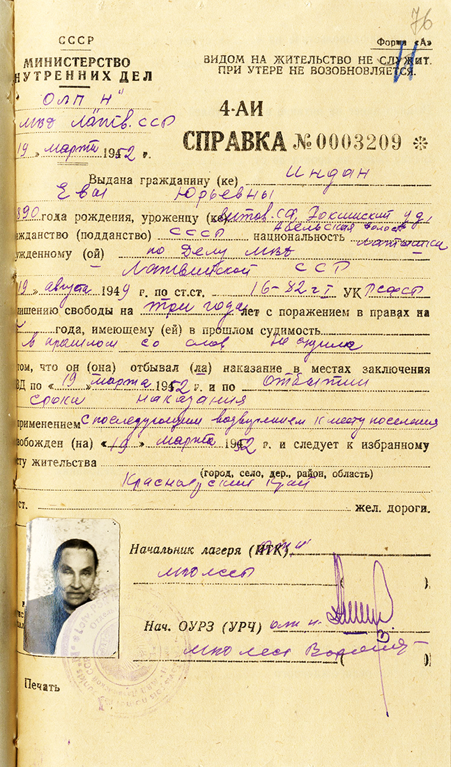 Ievu Indāni un meitu Ēriku aizsūtīja uz Krasnojarskas apgabalu, strādāja taigā, vāca sveķus.