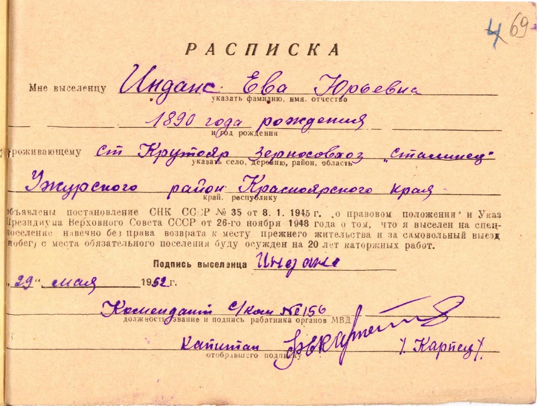 Pēc tam, kad sods bija izciests, [viņu] aizsūtīja atpakaļ uz Krasnojarskas apgabalu. Uz taigu darbos neaizsūtīja, bet norīkoja par kalponi ierēdņa (funkcionāra) ģimenē.