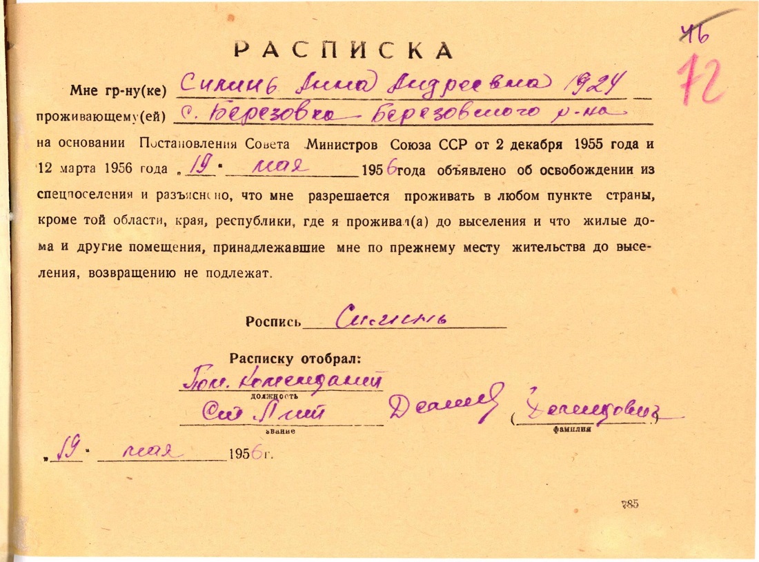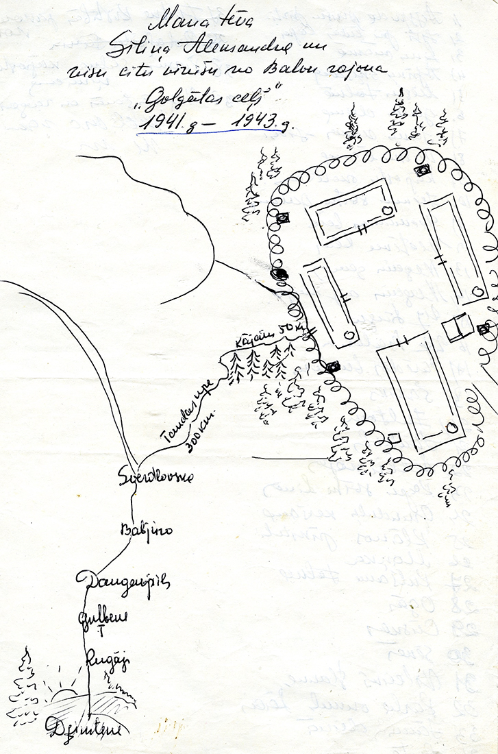 1941. gada 5. jūlija vakarā atvēra durvis un paziņoja, ka esam atbraukuši. Kamēr gaidījām transportu, lai aizkļūtu no stacijas laukuma, mūsu pavadītāji sarīkoja prieka brīžus. Viņi šāva gaisā raķetes. Cik tās bija skaistas! Drīz pienāca automašīna un pavadoņi norīkoja kraut mantas. Nakšņojām zem klajas debess.