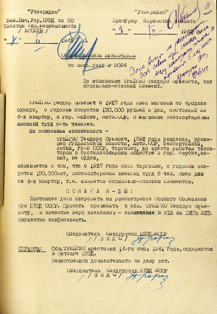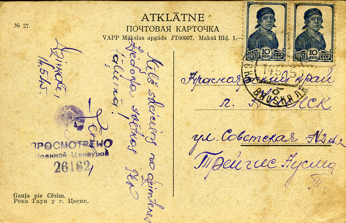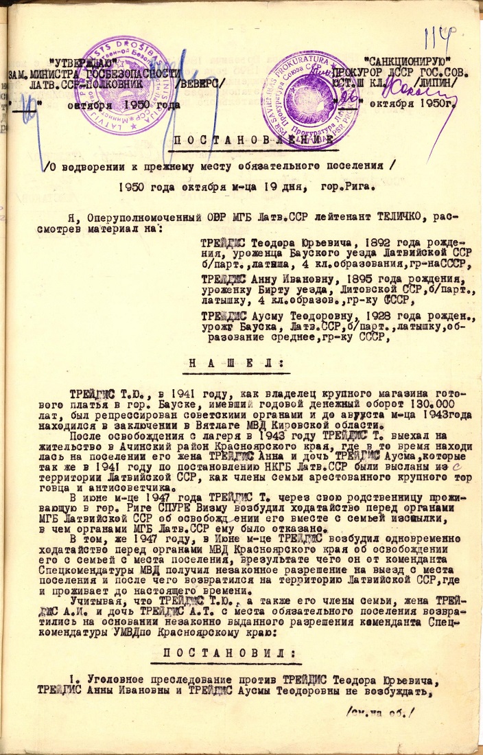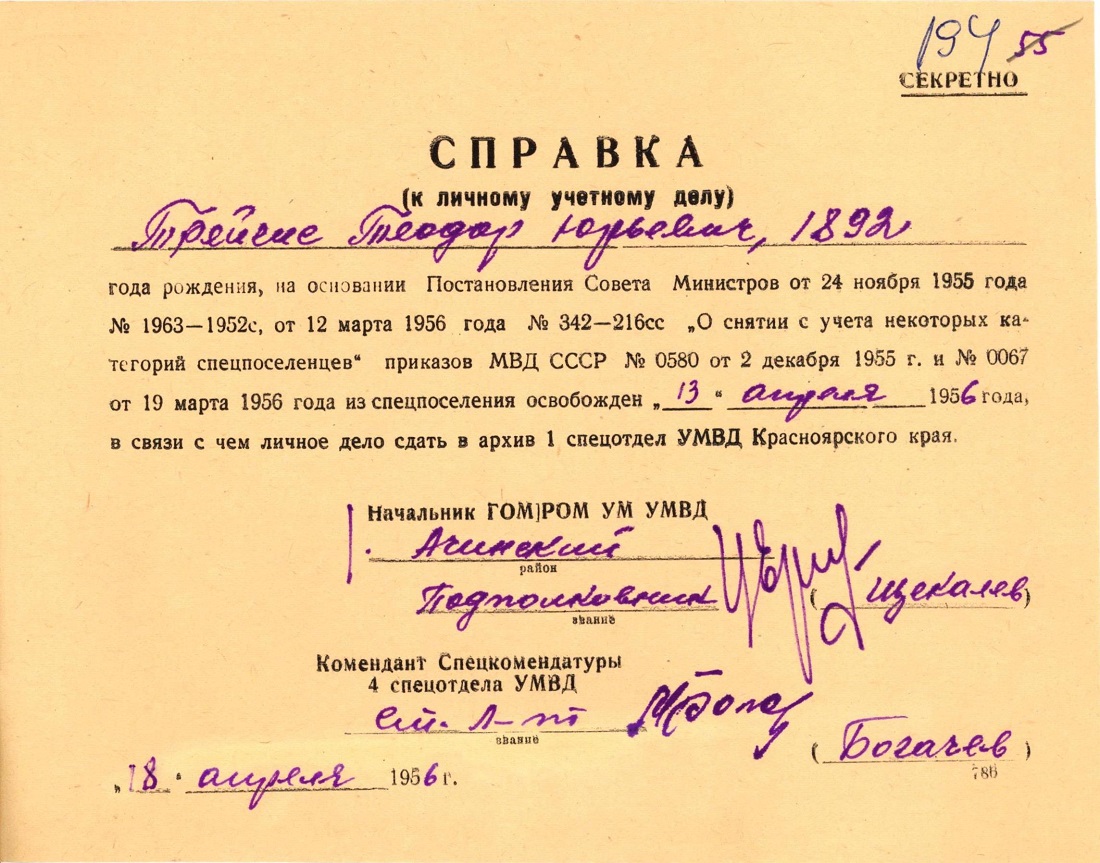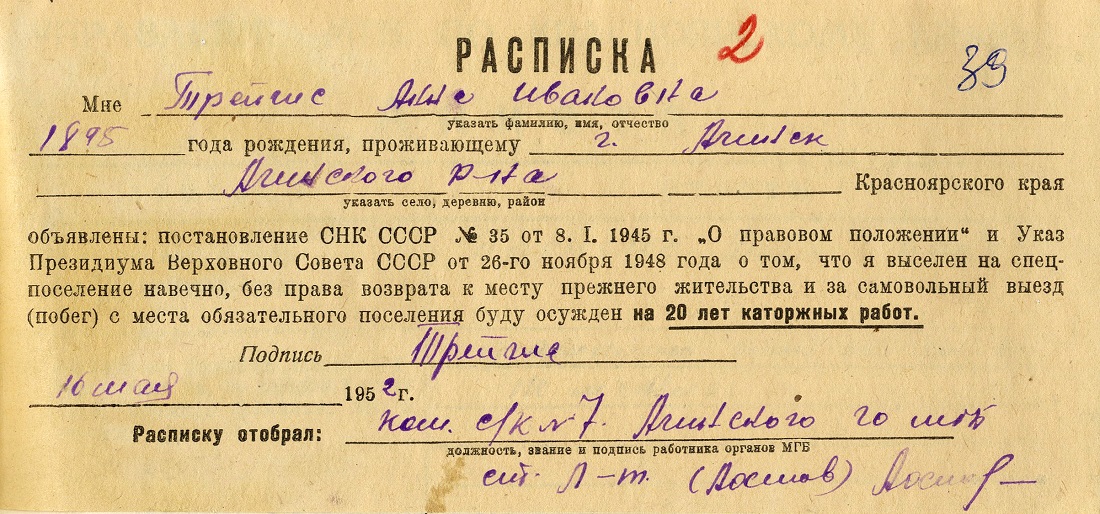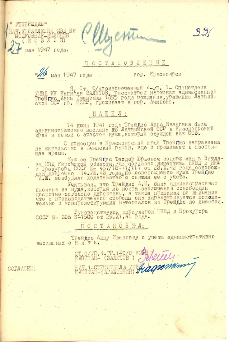 1943. g. nejauši ar atbrīvota novadnieka palīdzību uzzinājām, ka tēvs atrodas Kirovas apg[abala], Kaiskas raj[ona] st[acijā] Volostņica, Vjatlagā. Sākām sarakstīties un 1943. g. augustā tēvs atbrauca pie mums uz Ačinsku, jo bija atbrīvots. Atbrīvošanas dokumentā bija rakstīts, ka tēvs bijis notiesāts uz 5 gadiem pēc “СОЭ” (“социально опасный элемент” [“sociāli bīstams elements”]) panta. Tagad viņš bija pilnīgi atbrīvots, bez nometinājuma. Tēvs par to, uz cik ilgu laiku un pantu [bijis notiesāts] uzzināja tikai pēc šīs izziņas. Tēvam izdeva tīru pasi, karaklausības apliecību, Taču pēc tam, kad tēvs sāka taujāt par māti un mani (jo mēs tikām izsūtītas viņa dēļ), arī viņam pasi atņēma un mēs drīkstējām dzīvot tikai Ačinskas rajonā. Tēvs strādāja par sargu, māte par šuvēju un piegriezēju, es pabeidzu no 5. – 8. klasei.