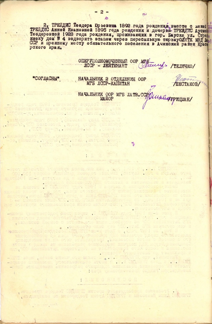 Treiģe Ausma Teodora m., dz. 1928, dzīvoja Bauskā, Strēlnieku ielā 4. Izsūtīta 14.06.1941. uz Krasnojarskas novada Ačinskas rajonu. 27.05.1947. atbrīvota no nometinājuma un atgriezusies Latvijā. 11.12.1950. atkārtoti izsūtīta uz Krasnojarskas novada Ačinskas rajonu, atbrīvota 10.03.1956. LVA, 1987. f., 1. apr. (Bauska), 15925. l.