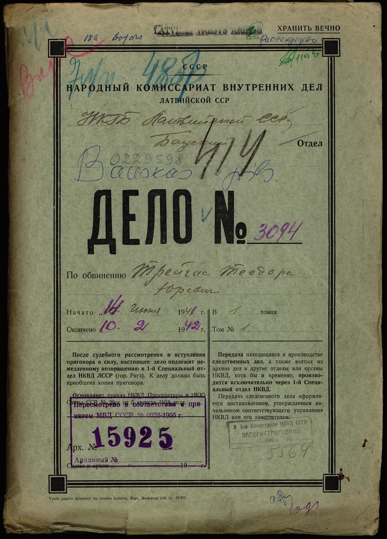 1941. gada 14. jūnijā ap plkst. 4 no rīta mūsu mājās ieradās bruņota grupa, kuru vadīja LPSR IeTK VDP darbinieks Derkačs, kā arī Semjonovs un baušķenieks Alnis. Viņi izdarīja kratīšanu, aprakstīja mantas un 1 stundas laikā lika mums sakravāties projām braukšanai, līdzi ņemot 100 kg. drēbes kopā ar pārtiku. Mūs kravas mašīnā nogādāja Iecavas stacijā, kur tēvu nošķīra atsevišķi, bet mani un māti restotos lopu vagonos nogādāja Krasnojarskas novada Ačinskā. Līdz ziemai nodzīvojām Ačinskas raj[ona] c[iemā] “Timoņino”, kur māte strādāja kolhozā, lauku brigādē. 1941. gada ziemā aizbraucām dzīvot uz Ačinsku, jo māte sāka strādāt savā specialitātē šūšanas fabrikā.