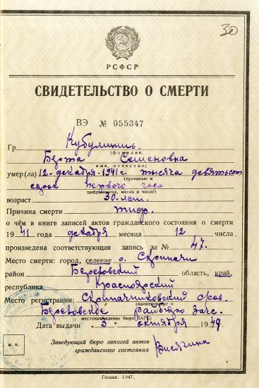 Tā mana māte Kubuliņa (jaunībā Bērziņa) Berta nomira 12. decembrī 1941. gadā. Atgriezies mājās biju viens pats bez iztikas līdzekļiem, bez drēbēm. Kaimiņi mūsu drēbes bija paguvuši jau apmainīt pret ēdamo, jo domājuši, ka mēs abi nepārnāksim. Tā to ziemu iztiku ar to, ko kāds labs cilvēks man iedeva. Mani pārņēma utis. Pleci, mugura bija nokasīti, utu noēsti vienās krevelēs. Kad novilku drēbes gabalu, kas bija mugurā, to nokratīju, tad zeme palika balta no utīm. Varbūt lasītājiem radīsies doma – vai tā var būt? Jā – tā bija taisnība.