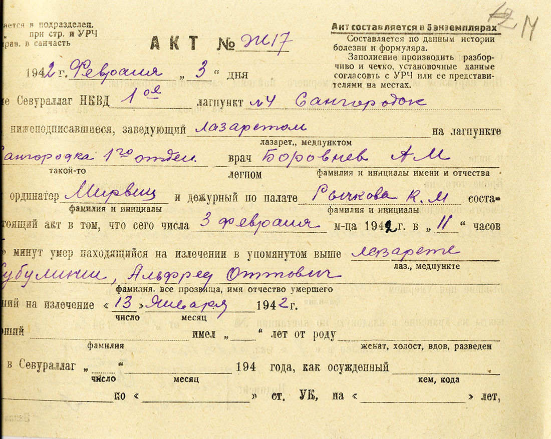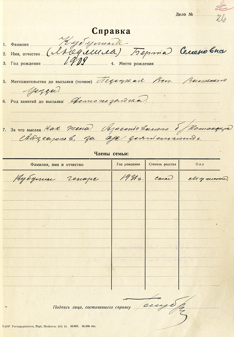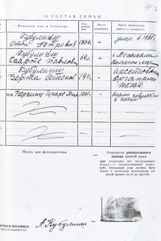 Audžutēvs Kubuliņš Alfrēds Otto d., dz. 1900, dzīvoja Valkas apriņķa, Pededzes pagasta, Mežmalās. Arestēts 14.06.1941. Ieslodzīts Sevurallagā, miris 03.02.1942. LVA, 1987.f., 1.apr. (Valka), 20202. lieta.