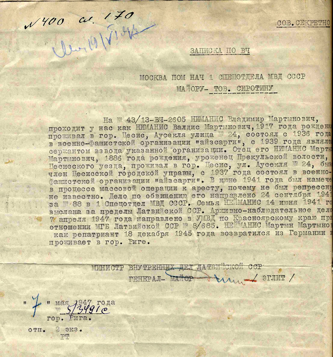 Valda Nīmaņa ģimeneNīmanis Valdis Mārtiņa d., dz. 1917, dzīvoja Cēsīs, Ausekļa ielā 24., izsūtīts 14.06.1941. uz Krasnojarskas nov. Ačinskas rajonu, atbrīvots 27.06.56. Lieta Nr. 15668. Sieva Nīmane Zenta Cēzara m., dz. 1918, dzīvoja Cēsīs, Ausekļa ielā 24., izsūtīta 14.06.1941. uz Krasnojarskas nov. Ačinskas rajonu, atbrīvota 01.07.44. Lieta Nr. 15668. Dēls Nīmanis Lotārs Valda d., dz. izsūtījumā 01.09.1941. uz Krasnojarskas nov. Ačinskas rajonu, miris 30.09.41. Lieta Nr. 15668. Māte Nīmane Otīlija Anša m., dz. 1880, dzīvoja Cēsīs, Ausekļa ielā 24., izsūtīta 14.06.1941. uz Krasnojarskas nov. Ačinskas rajonu, mirusi 06.11.42. Lieta Nr. 15668. Tēva māsa Nīmane Ženija Mārtiņa m., dz. 1912, dzīvoja Cēsīs, Ausekļa ielā 24., izsūtīta 14.06.1941. uz Krasnojarskas nov. Ačinskas rajonu, atbrīvota 16.03.56. Lieta Nr. 15668. Tēva māsa Nīmane Aina Mārtiņa m., dz. 1927, dzīvoja Cēsīs, Ausekļa ielā 24., izsūtīta 14.06.1941. uz Krasnojarskas nov. Ačinskas rajonu, atbrīvota 16.03.56. Lieta Nr. 15668. |