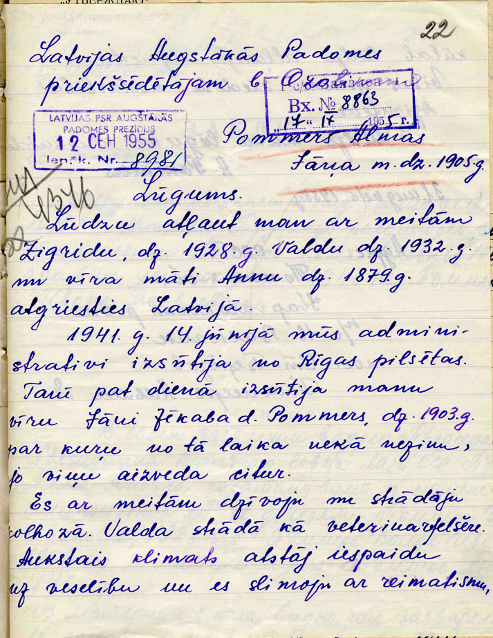 Esmu Sibīrijas bērns ar 18 gadu stāžu Sibīrijā. Ardievu meitenes, varbūt vairāk neredzēsimies – tā atvadījās mūsu tēvs Jānis Pommers 1941. gada 14. jūnija rītā Šķirotavas stacijā. Apsargi teica, ka kopā ar vīriešiem braukt nebūšot „ērti”, ka gala punktā visi satikšoties.