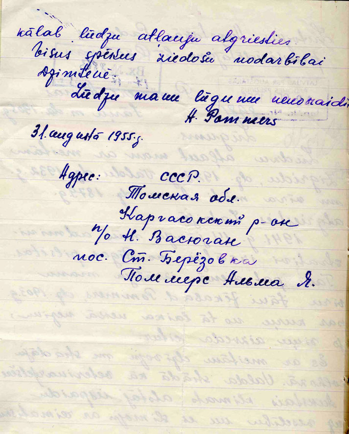 1954. gadā kolhozs mums pārdeva māju no baļķiem celtu, kur bija divas istabas, lielā krievu krāsns un pieci logi. Es strādāju par slaucēju. Manā grupā bija 18 govis. Labāko, kuru sauca Zarja, deva 8-10 litrus dienā. Tas bija labs sasniegums. No citām slaucām pa 6-7 litri dienā. Ziemā, kad dzirdināšana notiek tikai pie upes no izcirstiem āliņģiem un ārā ir mīnuss 40 grādu, tad pienu slauca pāris litrus no govs. Sibīrijā cieta visi, arī lopiņi, arī tiem nebija viegli. Vasarā, kad pienāca ganu laiks, mani izsauca uz kantori un teica, ka jāslauc govis un jāiet arī ganos, citādi nevarēšot to pirkto māju atpelnīt. Nācu mājās un tik ļoti raudāju, mamma ar vecomāti skrēja pretī un prasīja, vai mūs sūtīs vēl kur citur, ka es tā raudu. Man ļoti nepatika iet ganos, nerunājot nemaz par fizisko slodzi. Vakarā ātrāk par 12 naktī gulēt netiec, kamēr kūtī visu sakop un no rīta četros jāceļas uz slaukšanu. Ganos līdz paņemto ēdamo varēju ēst tika kājās stāvot, jo kā uz kāda ciņa purvā apsēstos, tā tūlīt aizmigtu. Reiz biju tā aizmigusi, ka puse no ganāmpulka bija sanākusi mājās. Par laimi netiku sodīta, tad jau ar mums apgājās labāk. Pēc lielā „valdnieka” nāves mūsu dzīves apstākļi jūtami uzlabojās. Mūs jau pa daļai sāka pielīdzināt vietējiem iedzīvotājiem. Veciem bija grūti pie tā visa pierast un samierināties ar to dzīves veidu, kādā bija jāturpina dzīvot. Mamma un vecāmāte vēl arvien dzīvoja ar cerību, ka nāks laiki, kad atgriezīsimies mājās.. Es nemanot jau biju iegājusi tai dzīves ritmā, kas valdīja apkārt. Lielāko laiku no gada atrados prom no mājām. Velākajos gados vasarā braucām pļaut sienu tālu no sādžas uz Obas apkārtējām pļavām. Kad pienāca ziema, jaunlopus dzina uz turienu barot. Tur arī sākās manas jaunības dēkas... Macēju dziedāt častuškas, tāpat kā visi un pļaskas (krievu kazačoku) arī tīri labi mācēju izdancot. Apavus tur šuva paši. Man arī no izģērētas teļa ādas pašuva zābakus. Kas tas bija par lepnumu, tad varēju kārtīgi ar papēžiem uzsist danča ritmu, ko sauca par kazačoku. Vasjugans, tā saucās mūsu upe, kuras krasti daudz ko ir pieredzējuši jau sākot ar 1930 tajiem gadiem, kad Krievija izsūtīja savu tautu uz ziemeļiem un neapdzīvoto Sibīriju. Izsūtīja tos, kuri nepakļāvās vietējām varām dibinot kolhozus. Galvenā nokļūšana no sādžas uz sādžu bija pa upi. Ne katru reizi nācās braukt ar lielām laivām. Bieži nācās pārvietoties ar mazām laiviņām, ko sauca par „oblasok”. Tā ir no resna koka izgrebta, viegla, plāna un līdz ar to ļoti svārstīga laiva, ar kuru, līdz iemācījās braukt, bija tīrais negals. Kā nedaudz ātrāk un nemākulīgi pakusties, tā laiva uz riņķi un pats ūdenī. Rajona centrs atradās 150 km tālu, tā kā lielākoties viss notika uz vietas savā sādžā. Liels notikums bija, kad pēckara gados atveda vasarā ar kuteri kādu krievu filmu parādīt. Tad salasījās visi sādžas iedzīvotāji, kas vien varēja kustēties. Kad 1956. gadā kolhozā ierīkoja ar dīzeli apgaismojumu un katrā mājā vakarā iedegās spuldzīte un staba galā sādža „runāja” vietējais radio, tad pēc visa pārdzīvotā un piedzīvotā bada un aukstuma likās, ka dzīve jāpieņem tāda, kāda tā ir izveidojusies. Tik tālos Sibīrijas apdzīvotos nostūros arī vietējie cilvēki no dzīves neprasīja daudz. Kūtiņā govs un cūka, vistas ziemā zem krāsns, teļš aizdurvē piesiets, zem grīdas, pagrabā kartupeļi un muca ar sālītiem gurķiem, muca ar skābētiem kāpostiem uz lieveņa. Cik vajag, tik ar cirvi pacērt un ienes istabā lai atkūst. Ogas, sēnes salasītas, zivis sazvejotas. Pufaikas un kājās filči. Ziemā jau aitādas kažociņu dažs varēja nopirkt un kartūna audumu jau sāka pārdot. Ziemā pārvietošanās tikai ar zirgiem. Arī pastu veda ar zirgu pajūgiem , kam pie loka zvaniņi piesieti, lai zina, ka brauc pastnieki. Arī kolhoza priekšnieks uz rajona centru 150 km ziemā brauca ar zirgu. Vasarā mazie tvaikonīši nāca biezāk pa upi, no vasaras sākuma, kamēr vēl upe nebija palikusi sekla, atnāca kādas reizes lielāki pasažieru kuģi. Tas jau bija vesels notikums, kas atkal sādžas ļaudis pulcējās krastā kuģi sagaidīt un pavadīt tālāk. Par ģimeni sāku domāt tīri vai aprēķina dēļ. Lai varētu palikt mājās. Jo jaunos vienmēr sūtīja prom no mājām kā vasarā, tā arī ziemā. 1956. gadā piedzima meita un pēc gada dēls. Biju tā pārkrievojusies, ka meitai vārdu iedevu Ņina, kas vēl būtu pieņemams, bet dēlu nosaucu par Vladimiru. Lai gan mamma un vecāmāte centās atrunāt vārdu došanā, bet paliku pie sava, jo biju jau sākusi pat domāt krieviski, ne tikai runāt. Tagad bieži domāju, cik tomēr dzīve un apkārtējā vide var jauniešus ietekmēt. Mans vīrs bija krievu tautības, ļoti labs cilvēks. Arī viņš bija no trīsdesmito gadu izsūtītajiem. Trīs gadu vecumā viņam bija jāsāk izbaudīt Sibīrijas skarbums. Vīra māte gan teica viņam, ko tu tajā latiškā esi atradis, ka pat brauc viņai līdz uz Latviju.