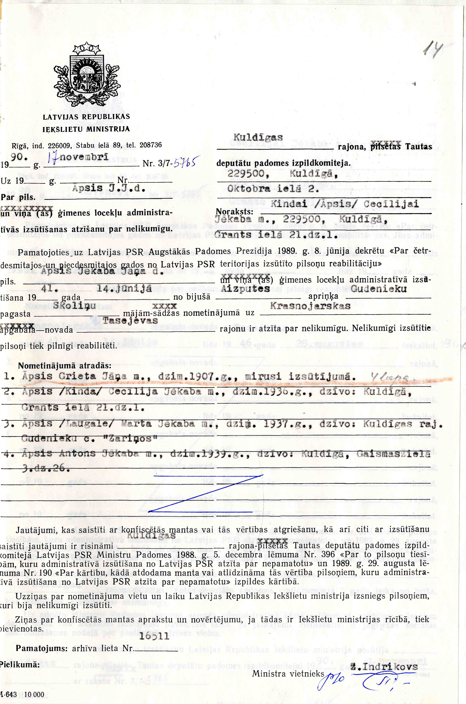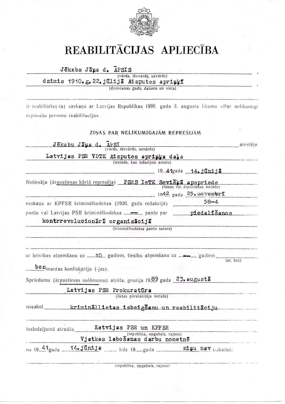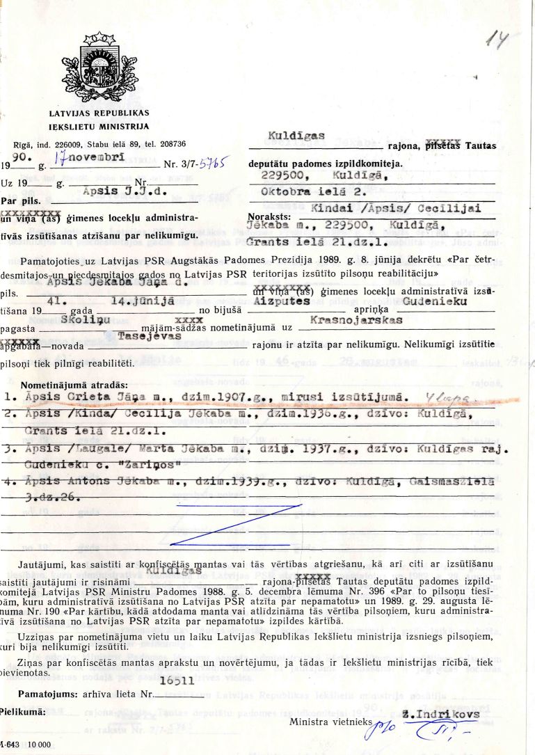 Cecīlijas Āpses ģimeneĀpse Cecīlija Jēkaba m., dz. 1936, dzīvoja Aizputes apriņķa Gudenieku pagasta Skoliņās, izsūtīta 14.06.1941. uz Krasnojarskas novada Tasejevas rajonu, atbrīvota 28.08.46. Lieta Nr. 16511. Tēvs Āpsis Jēkabs Jāņa d., dz. 1910, dzīvoja Aizputes apriņķa Gudenieku pagasta Skoliņās, arestēts 14.06.1941., ieslodzīts Kirovas apgabala Vjatlagā, miris 17.06.43. Lieta Nr. 16511., P-7602. Māte Āpse Grieta Jāņa m., dz. 1907, dzīvoja Aizputes apriņķa Gudenieku pagasta Skoliņās, izsūtīta 14.06.1941. uz Krasnojarskas novada Tasejevas rajonu, mirusi pirms 1946. gada. Lieta Nr. 16511. Māsa Āpse Marta Jēkaba m., dz. 1937, dzīvoja Aizputes apriņķa Gudenieku pagasta Skoliņās, izsūtīta 14.06.1941. uz Krasnojarskas novada Tasejevas rajonu, atbrīvota 28.08.46. Lieta Nr. 16511. Brālis Āpsis Antons Jēkaba d., dz. 1939, dzīvoja Aizputes apriņķa Gudenieku pagasta Skoliņās, izsūtīts 14.06.1941. uz Krasnojarskas novada Tasejevas rajonu, atbrīvots 28.08.46. Lieta Nr. 16511. |