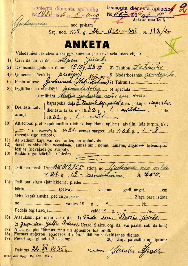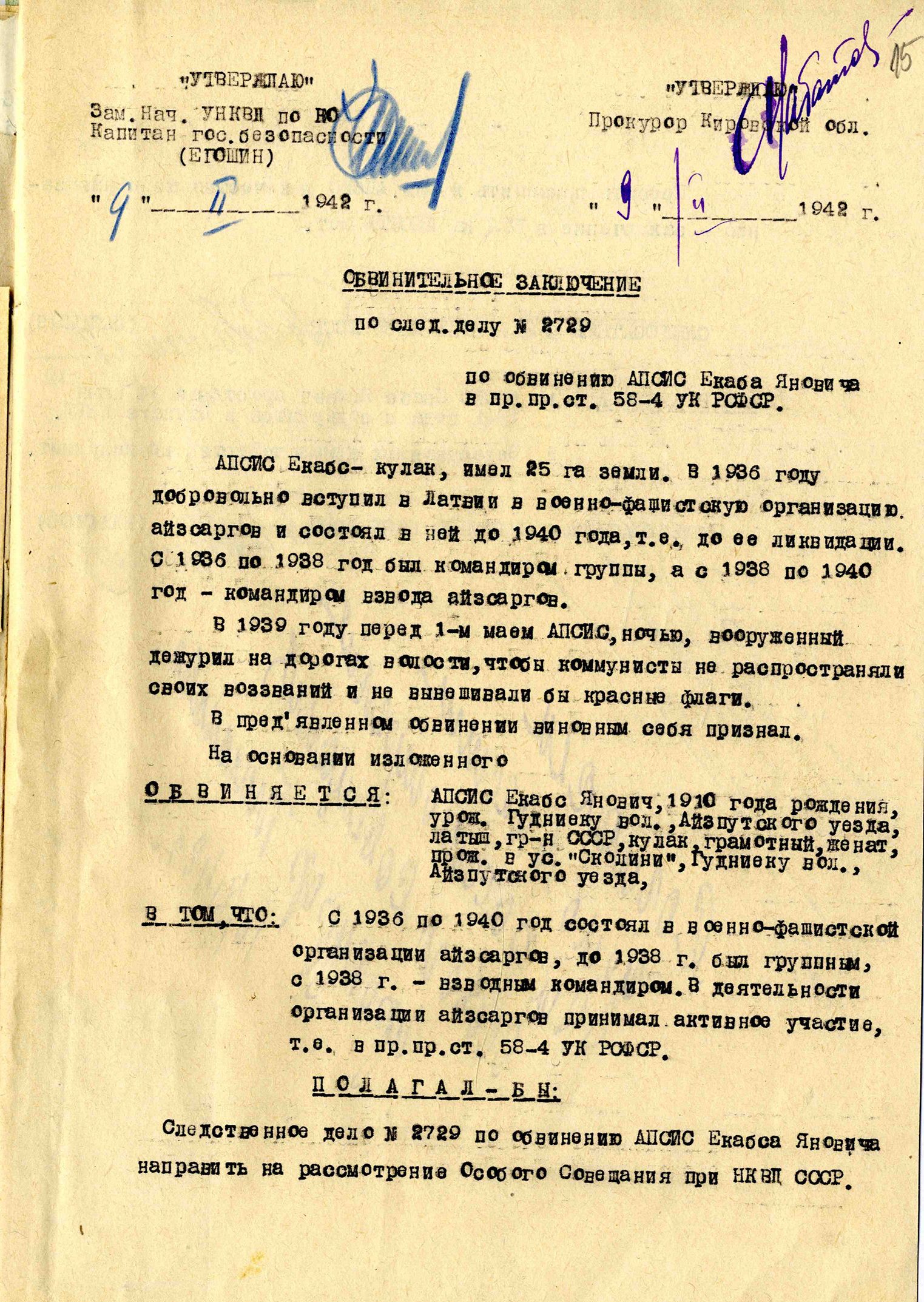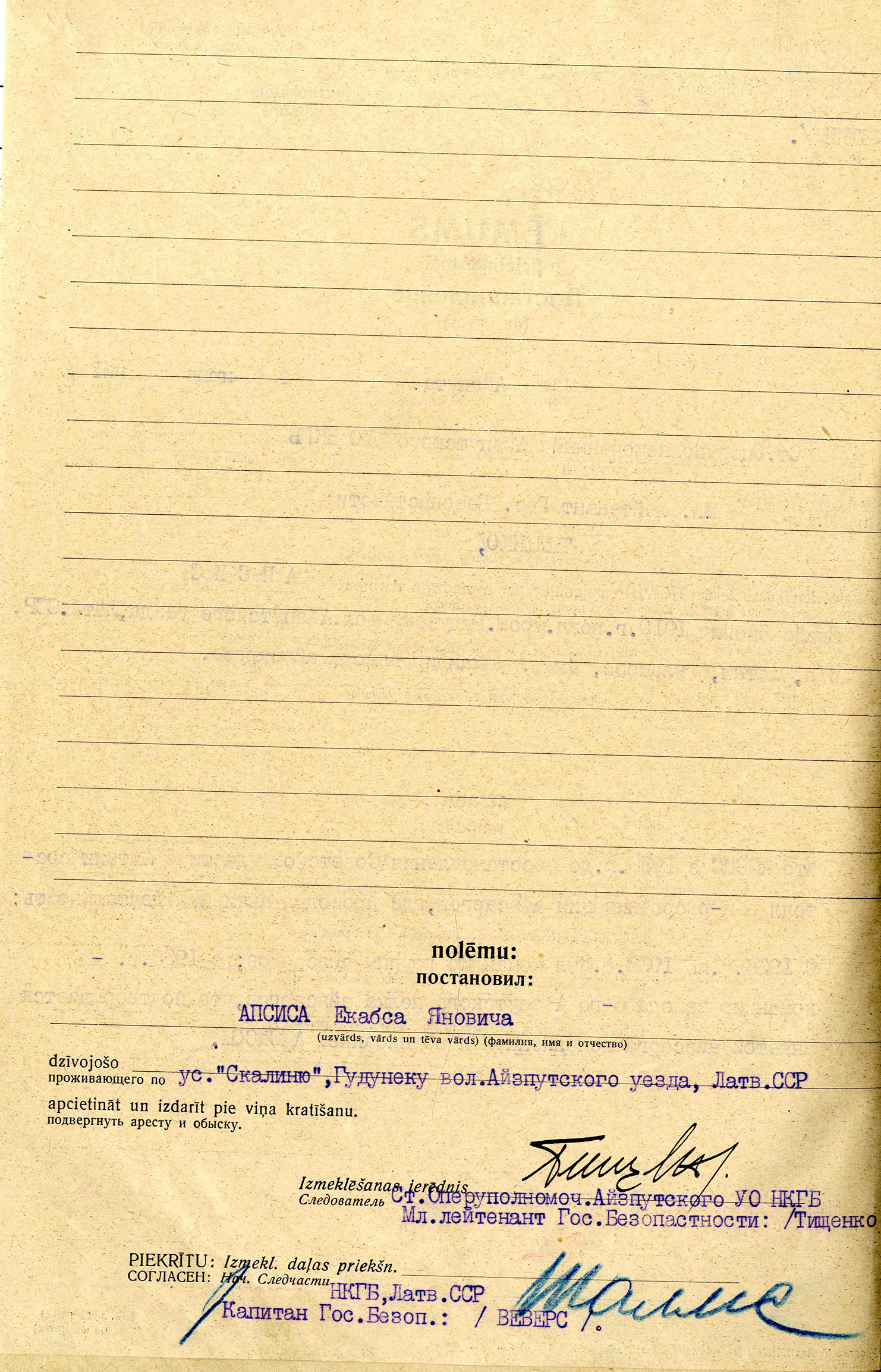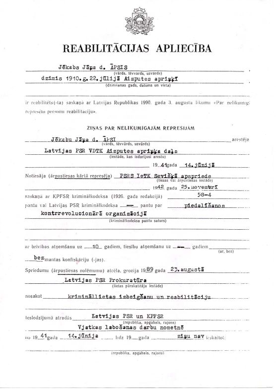 Cecīlijas Āpses ģimeneĀpse Cecīlija Jēkaba m., dz. 1936, dzīvoja Aizputes apriņķa Gudenieku pagasta Skoliņās, izsūtīta 14.06.1941. uz Krasnojarskas novada Tasejevas rajonu, atbrīvota 28.08.46. Lieta Nr. 16511. Tēvs Āpsis Jēkabs Jāņa d., dz. 1910, dzīvoja Aizputes apriņķa Gudenieku pagasta Skoliņās, arestēts 14.06.1941., ieslodzīts Kirovas apgabala Vjatlagā, miris 17.06.43. Lieta Nr. 16511., P-7602. Māte Āpse Grieta Jāņa m., dz. 1907, dzīvoja Aizputes apriņķa Gudenieku pagasta Skoliņās, izsūtīta 14.06.1941. uz Krasnojarskas novada Tasejevas rajonu, mirusi pirms 1946. gada. Lieta Nr. 16511. Māsa Āpse Marta Jēkaba m., dz. 1937, dzīvoja Aizputes apriņķa Gudenieku pagasta Skoliņās, izsūtīta 14.06.1941. uz Krasnojarskas novada Tasejevas rajonu, atbrīvota 28.08.46. Lieta Nr. 16511. Brālis Āpsis Antons Jēkaba d., dz. 1939, dzīvoja Aizputes apriņķa Gudenieku pagasta Skoliņās, izsūtīts 14.06.1941. uz Krasnojarskas novada Tasejevas rajonu, atbrīvots 28.08.46. Lieta Nr. 16511. |
