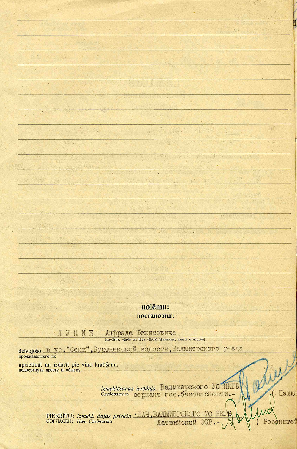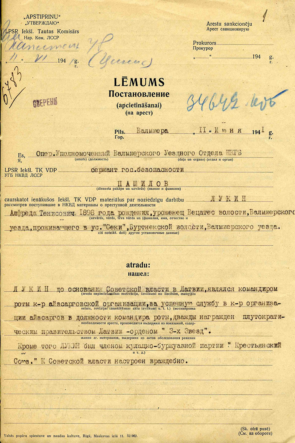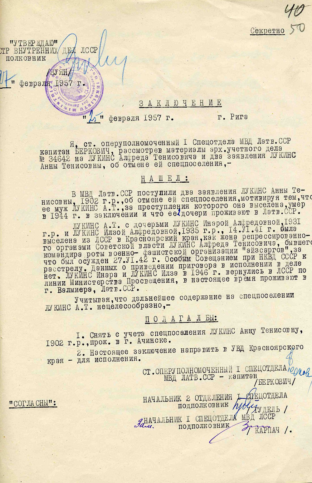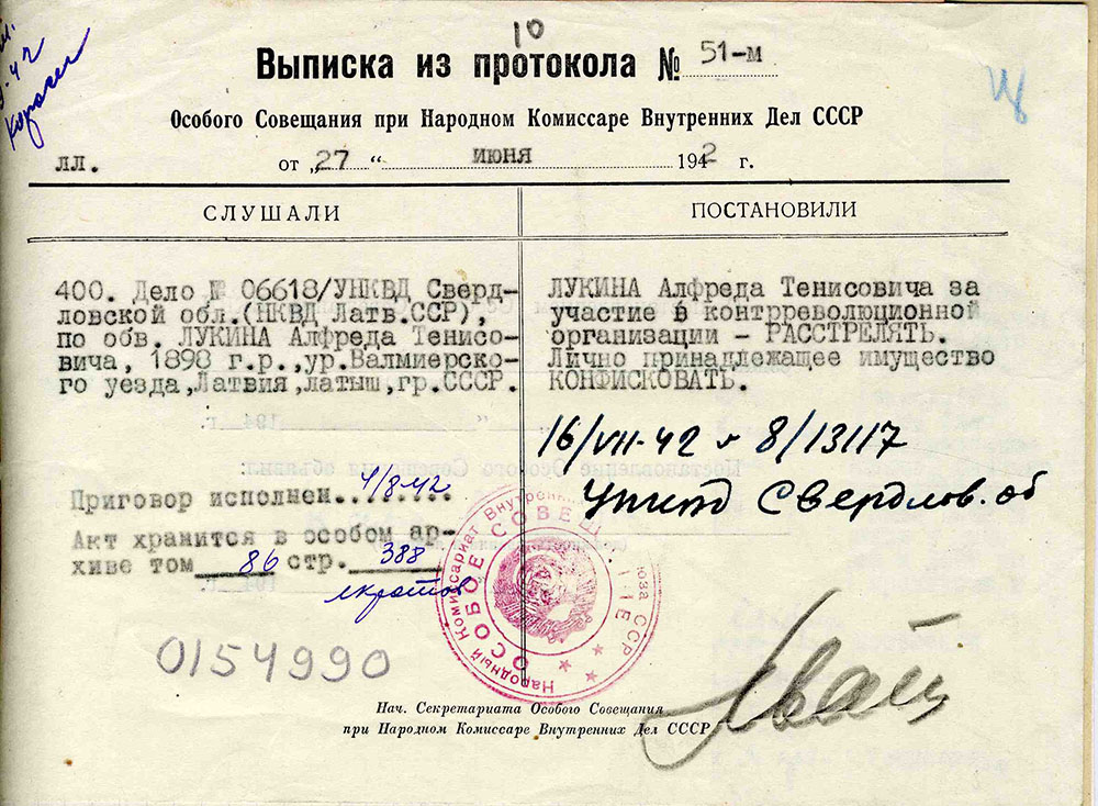 Ināras Lūkinas ģimeneLūkina Ināra Alfrēda m., dz. 1930, dzīvoja Valmieras apriņķa Burtnieku pagasta Seķos, izsūtīta 14.06.1941. uz Krasnojarskas novada Ačinskas rajonu, atbrīvota 13.09.46. Lieta Nr. 17134. Tēvs Lūkins Alfrēds Teņa d., dz. 1898, dzīvoja Valmieras apriņķa Burtnieku pagasta Seķos, arestēts 14.06.1941. ieslodzīts Sverdlovskas apgabala Sevurallagā, nošauts 04.08.42. Lieta Nr. 17134, P-5823. Māte Lūkina Anna Teņa m., dz. 1902, dzīvoja Valmieras apriņķa Burtnieku pagasta Seķos, izsūtīta 14.06.1941. uz Krasnojarskas novada Ačinskas rajonu, atbrīvota 19.03.57. Lieta Nr. 17134. Māsa Lūkina Ilze Alfrēda m., dz. 1934, dzīvoja Valmieras apriņķa Burtnieku pagasta Seķos, izsūtīta 14.06.1941. uz Krasnojarskas novada Ačinskas rajonu, atbrīvota 13.09.46. Lieta Nr. 17134. |