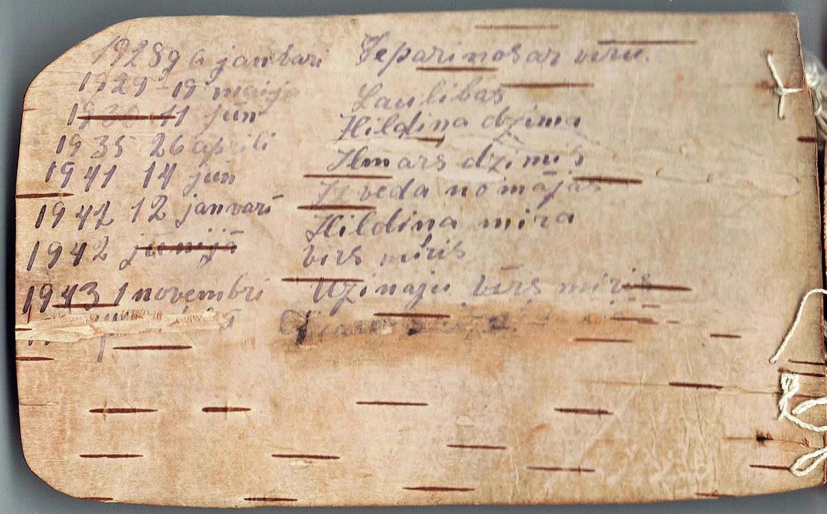 Mamma mani palūdza no bērzu tāss uztaisīt tādas lapiņas un ar lillā ķīmisko tinti visu no sienas pārrakstīja uz bērzu tāss, un tur atskaņās ir visa viņas dzīve… Tās lapiņas vēl šodien ir pie manis, kā tāda ģimenes relikvija… Mamma piecpadsmit gadus nodzīvoja Sibīrijā, un ar visu to, viņa nomira gandrīz 90 gadu vecumā, tikai trīs mēneši pietrūka līdz 90 gadiem… Kad atgriezās Latvijā, izstrādāja pensiju.