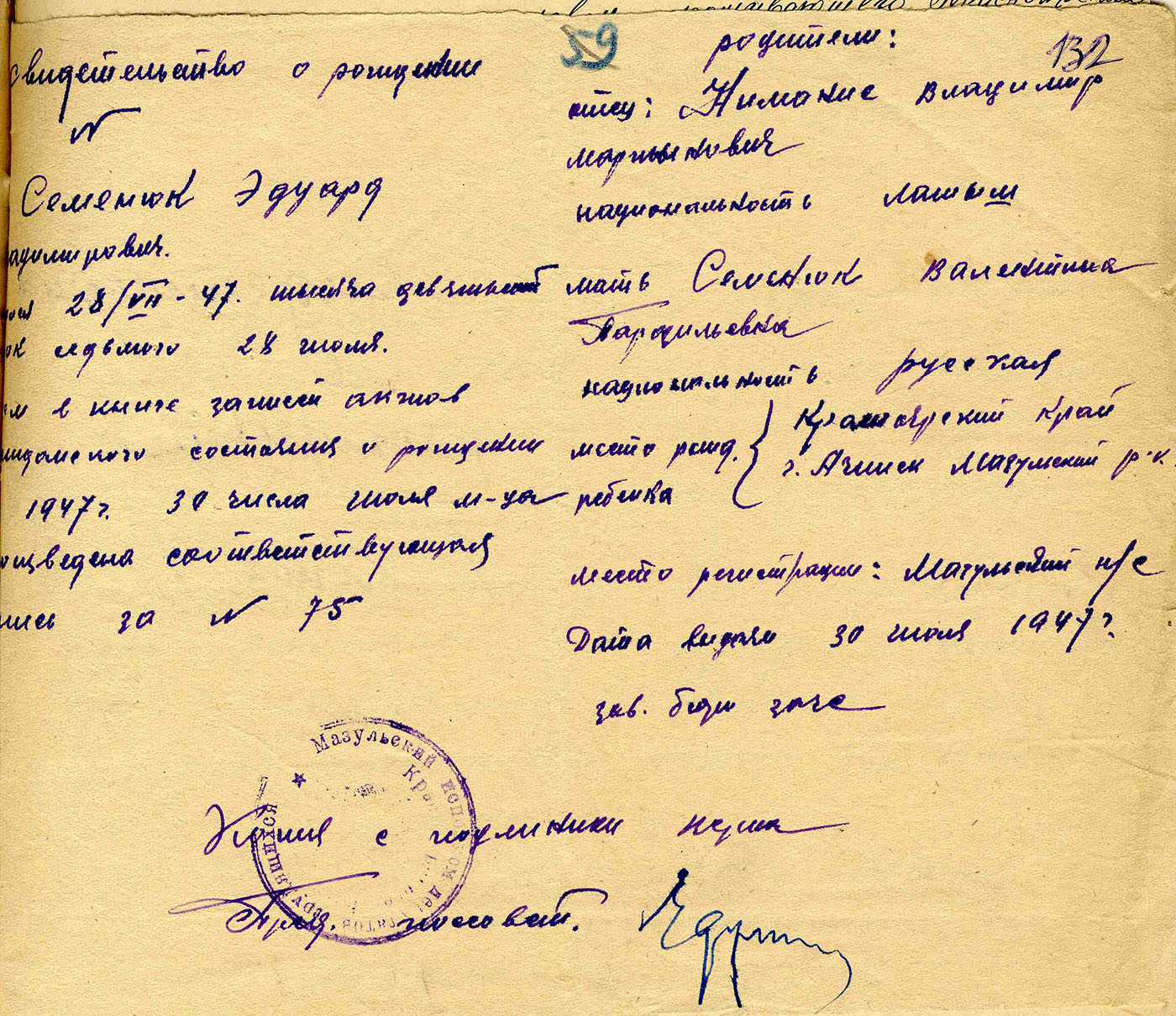 Visu kara laiku nebija nekādu ziņu no Dzimtenes. Ja kaut kur tālumā sadzirdējām vilciena troksni, tad teicām, ka arī mēs tā brauksim uz mājām, uz Latviju. Ne vienu brīdi mūs neatstāja doma par to, kā atgriezties, neskatoties uz to, ka dzīve ar laiku uzlabojās. Pēc kara bija iespēja sūtīt bērnus uz Latviju, bet mēs to nedarījām. Tā kā mēs neko nezinājām par manu tēvu, nosūtījām vēstuli tēva brālim, kurš strādāja bērnu klīnikā Jūrmalā. Onkulis vēstuli bija saņēmis un sazinājies ar tēvu. 1952. gadā pienāca pirmā ziņa – telegramma no tēva. Tēvs atbrauca ciemos. Izrādījās, ka tikai mēs visi esam noziedznieki, bet tēvs ir nevainīgs. Valentīna ar vienu dēlu atbrauca uz Latviju un Krimuldā to nokristīja. Viņi atgriezās Sibīrijā.