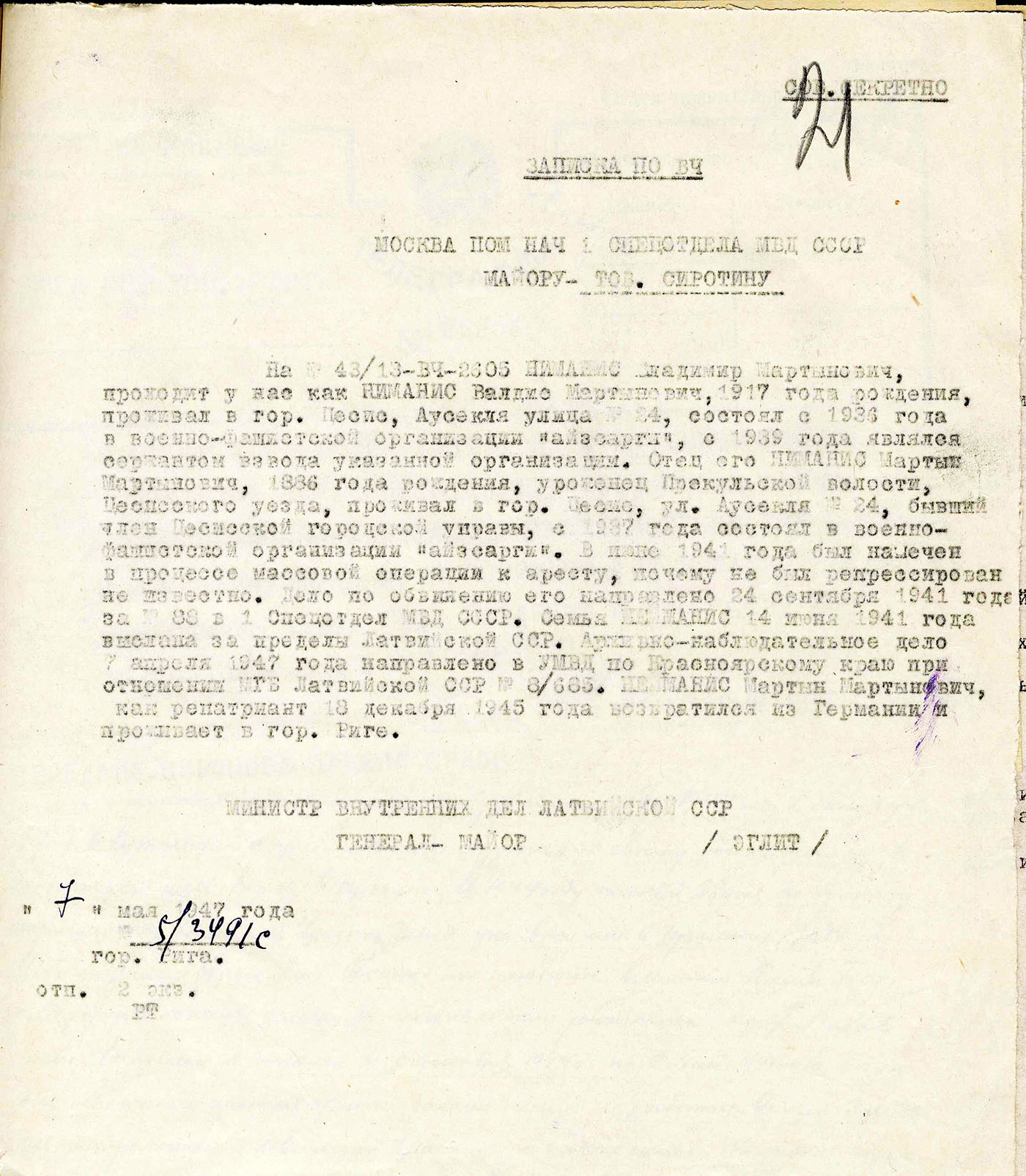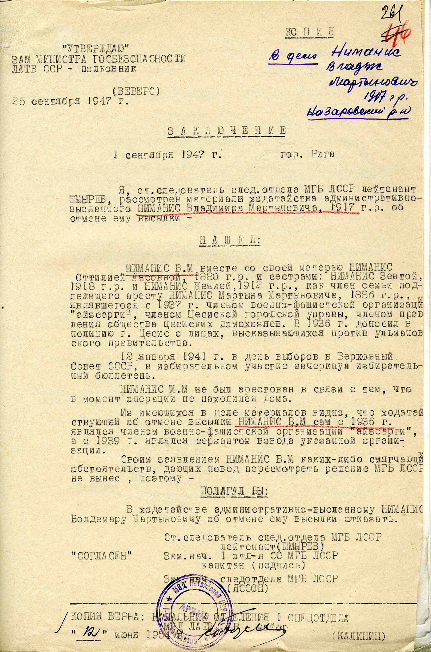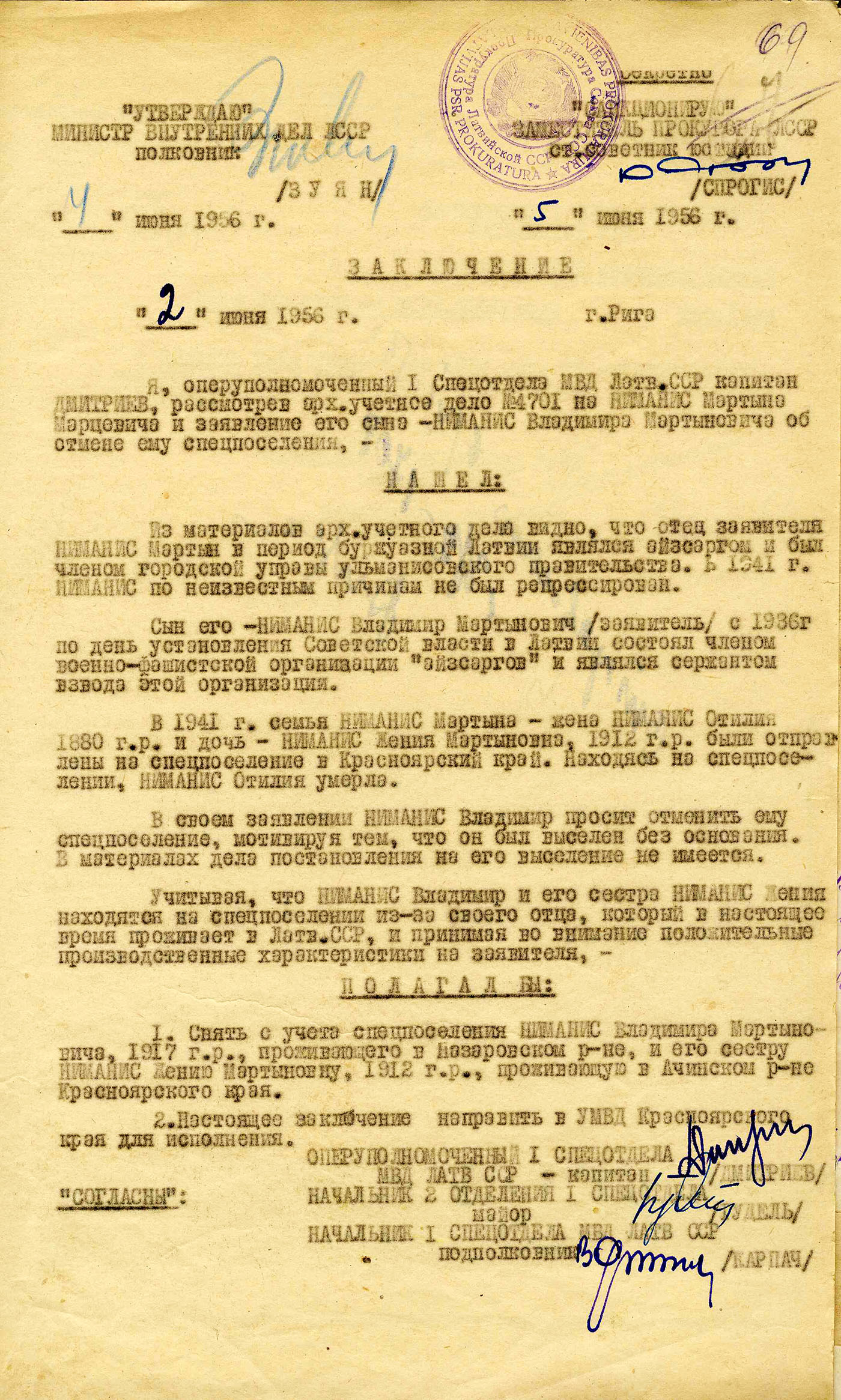 Valda Nīmaņa ģimeneNīmanis Valdis Mārtiņa d., dz. 1917, dzīvoja Cēsīs, Ausekļa ielā 24., izsūtīts 14.06.1941. uz Krasnojarskas nov. Ačinskas rajonu, atbrīvots 27.06.56. Lieta Nr. 15668. Sieva Nīmane Zenta Cēzara m., dz. 1918, dzīvoja Cēsīs, Ausekļa ielā 24., izsūtīta 14.06.1941. uz Krasnojarskas nov. Ačinskas rajonu, atbrīvota 01.07.44. Lieta Nr. 15668. Dēls Nīmanis Lotārs Valda d., dz. izsūtījumā 01.09.1941. uz Krasnojarskas nov. Ačinskas rajonu, miris 30.09.41. Lieta Nr. 15668. Māte Nīmane Otīlija Anša m., dz. 1880, dzīvoja Cēsīs, Ausekļa ielā 24., izsūtīta 14.06.1941. uz Krasnojarskas nov. Ačinskas rajonu, mirusi 06.11.42. Lieta Nr. 15668. Tēva māsa Nīmane Ženija Mārtiņa m., dz. 1912, dzīvoja Cēsīs, Ausekļa ielā 24., izsūtīta 14.06.1941. uz Krasnojarskas nov. Ačinskas rajonu, atbrīvota 16.03.56. Lieta Nr. 15668. Tēva māsa Nīmane Aina Mārtiņa m., dz. 1927, dzīvoja Cēsīs, Ausekļa ielā 24., izsūtīta 14.06.1941. uz Krasnojarskas nov. Ačinskas rajonu, atbrīvota 16.03.56. Lieta Nr. 15668. |