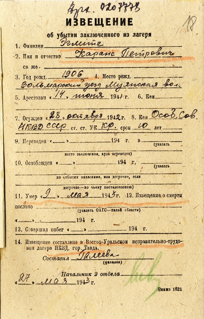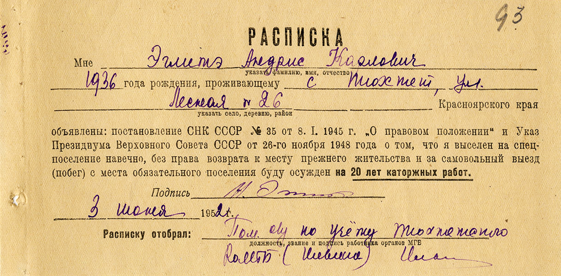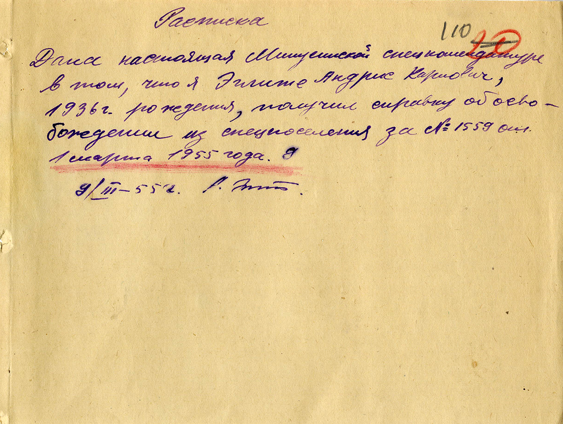 Andra Eglīša ģimeneEglītis (Eglīte) Andris Kārļa d., 1936, dzīvoja Cēsīs, Sarkanarmijas ielā 6. Izsūtīts 14.06.1941. uz Krasnojarskas novada Tjuhtetas rajonu. Atbrīvots 1946. g. un atgriezies Latvijā. 25.03.1949. kopā ar vecvecākiem izsūtīts atkārtoti uz Tomskas apgabala Koževņikovskas rajonu; vēlāk pārvietots uz Krasnojarskas novada Tjuhtetas rajonu. Atbrīvots 07.1957. LVA, 1987. f., 1. apr. (Cēsis), 17591. l.; LVA, 1894. f., 1. apr. (Cēsis), 12051. l. Tēvs Eglītis (Eglīte) Kārlis Pētera d., 1906, dzīvoja Cēsīs, Sarkanarmijas ielā 6. Arestēts 14.06.1941., ieslodzīts Sevurallagā. Miris ieslodzījumā 09.05.1943. vai 22.05.1943. LVA, 1986. f., 2. apr., P-9892. l.; LVA, 1987. f., 1. apr. (Cēsis), 17591. l. Māte Eglīte Luize Emīla m., 1912, dzīvoja Cēsīs, Sarkanarmijas ielā 6. Izsūtīta 14.06.1941. uz Krasnojarskas novada Tjuhtetas rajonu. Atbrīvota 16.08.1956. LVA, 1987. f., 1. apr. (Cēsis), 17591. l. Brālis Eglītis (Eglīte) Guntis Kārļa d., 1939, dzīvoja Cēsīs, Sarkanarmijas ielā 6. Izsūtīts 14.06.1941. uz Krasnojarskas novada Tjuhtetas rajonu. Atrīvots 1950. gados. LVA, 1987. f., 1. apr. (Cēsis), 17591. l. Brālis Eglītis (Eglīte) Kārlis Kārļa d., 1941, dzīvoja Cēsīs, Sarkanarmijas ielā 6. Izsūtīts 14.06.1941., miris ceļā. LVA, 1987. f., 1. apr. (Cēsis), 17591. l. |