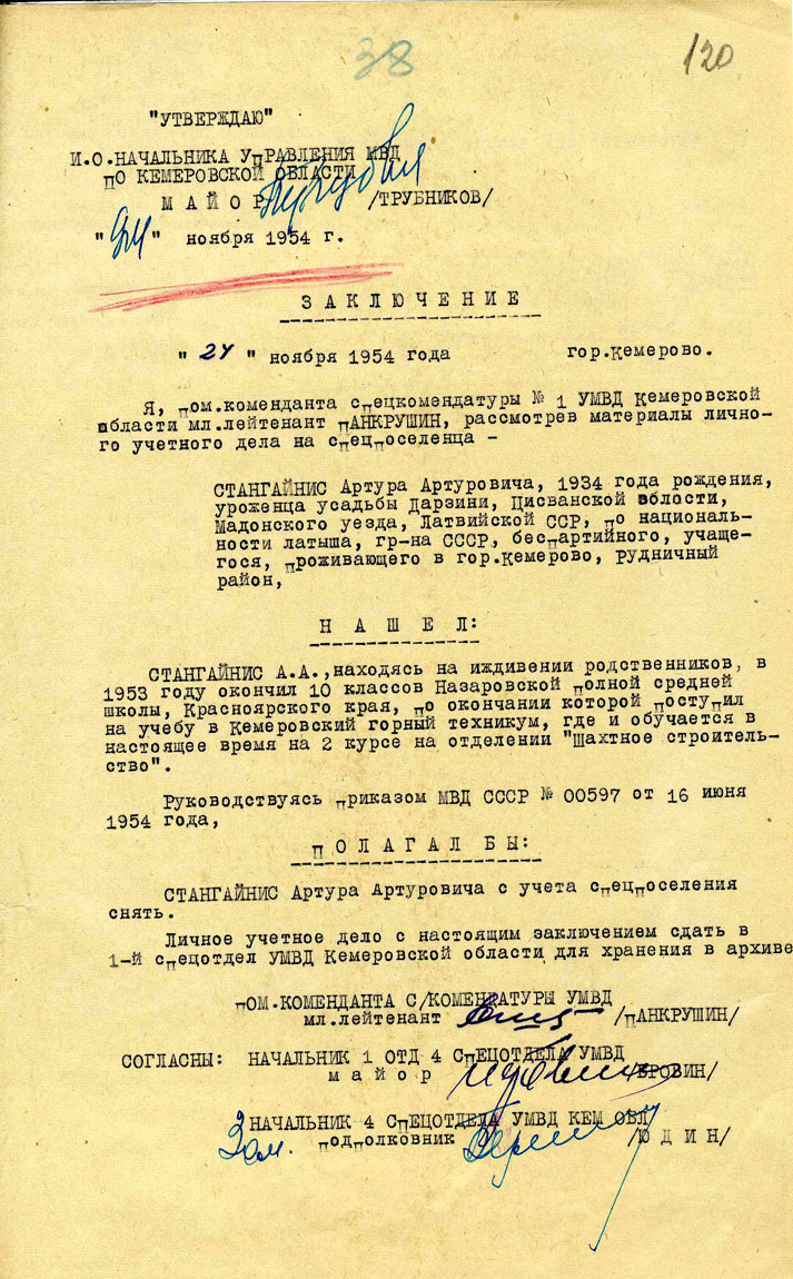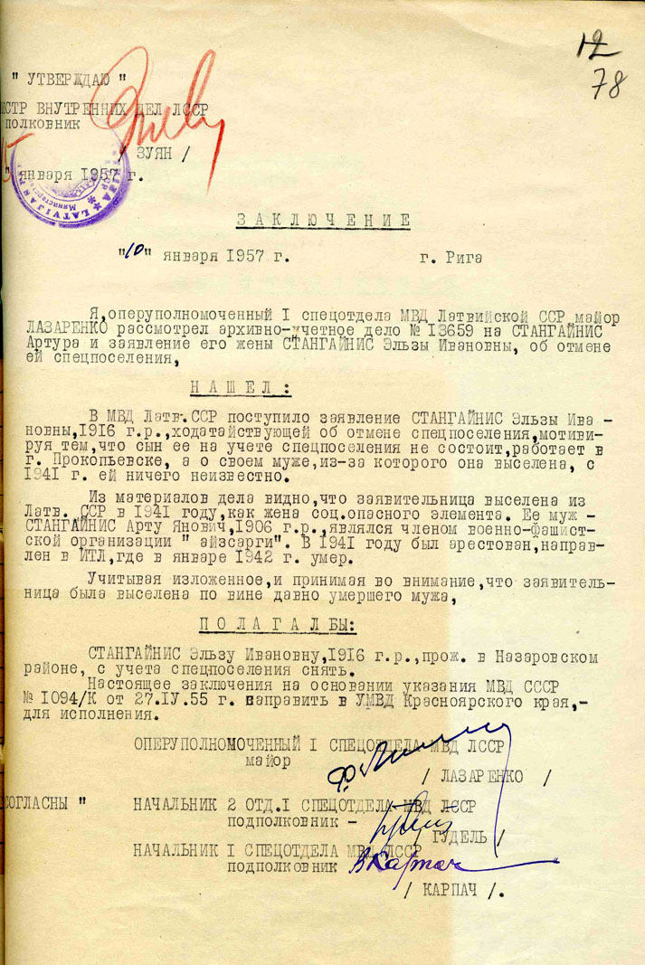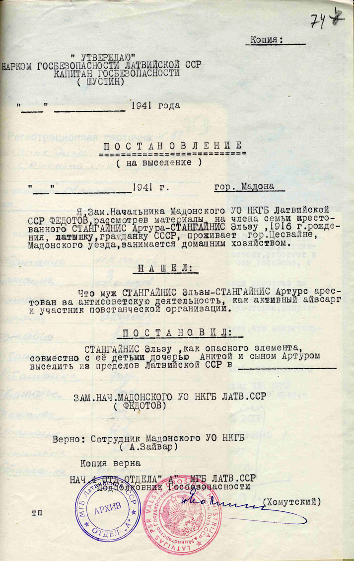 Anitas Stangaines ģimeneStangaine Anita Artūra m., dz. 1940, dzīvoja Madonas apriņķa Cesvaines pagasta Jaunpavāros, izsūtīta 14.06.1941. uz Krasnojarskas novada Nazarovas rajonu, atbrīvota 05.02.57. Lieta Nr. 13659. Tēvs Stangainis Artūrs Jāņa d., dz. 1906, dzīvoja Madonas apriņķa Cesvaines pagasta Jaunpavāros, arestēts 14.06.1941., ieslodzīts Sverdlovskas apgabala Sevurallagā, miris 02.01.42. Lieta Nr. 13659. Māte Stangaine Elza Jāņa m., dz. 1916, dzīvoja Madonas apriņķa Cesvaines pagasta Jaunpavāros, izsūtīta 14.06.1941. uz Krasnojarskas novada Nazarovas rajonu, atbrīvota 05.02.57. Lieta Nr. 13659. Brālis Stangainis Artūrs Artūra d., dz. 1934, dzīvoja Madonas apriņķa Cesvaines pagasta Jaunpavāros, izsūtīts 14.06.1941. uz Krasnojarskas novada Nazarovas rajonu, atbrīvots 01.12.54. Lieta Nr. 13659. |