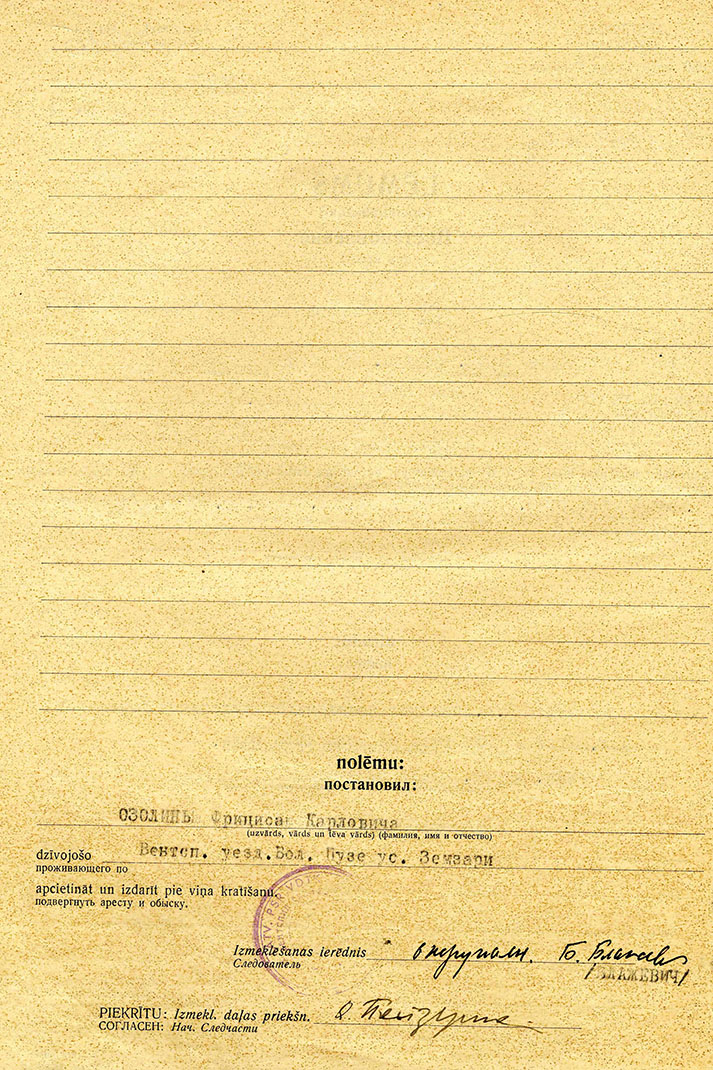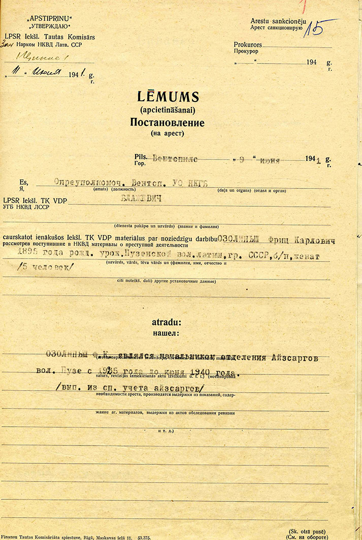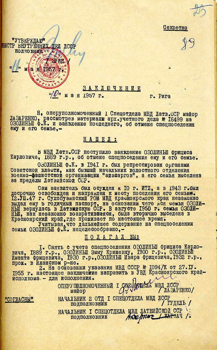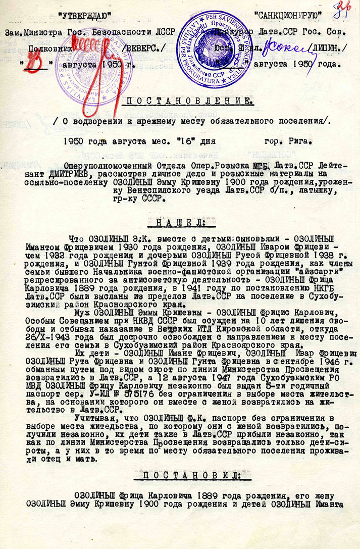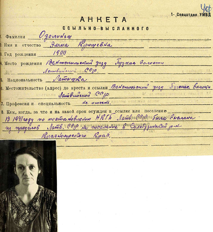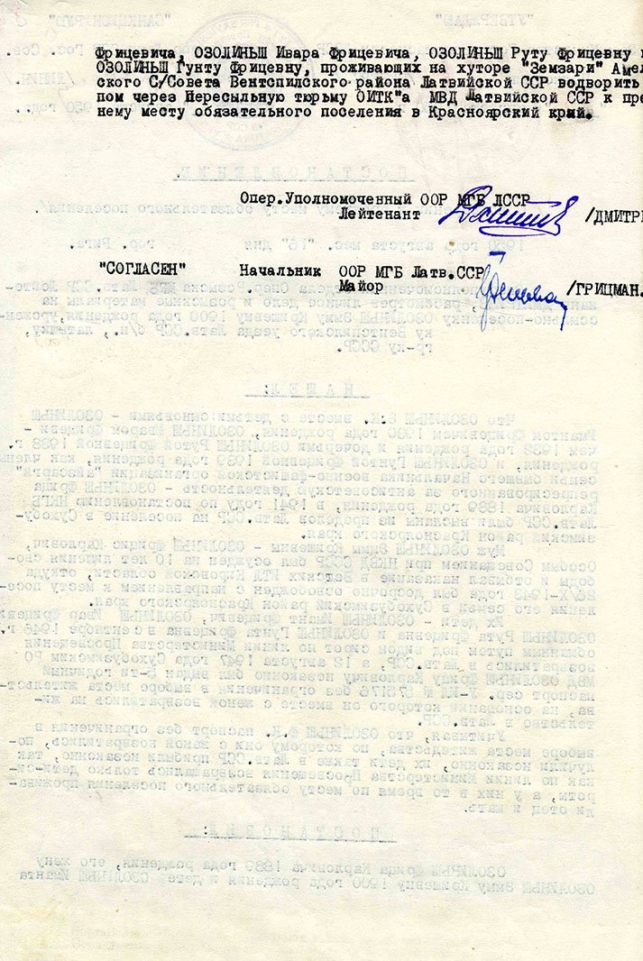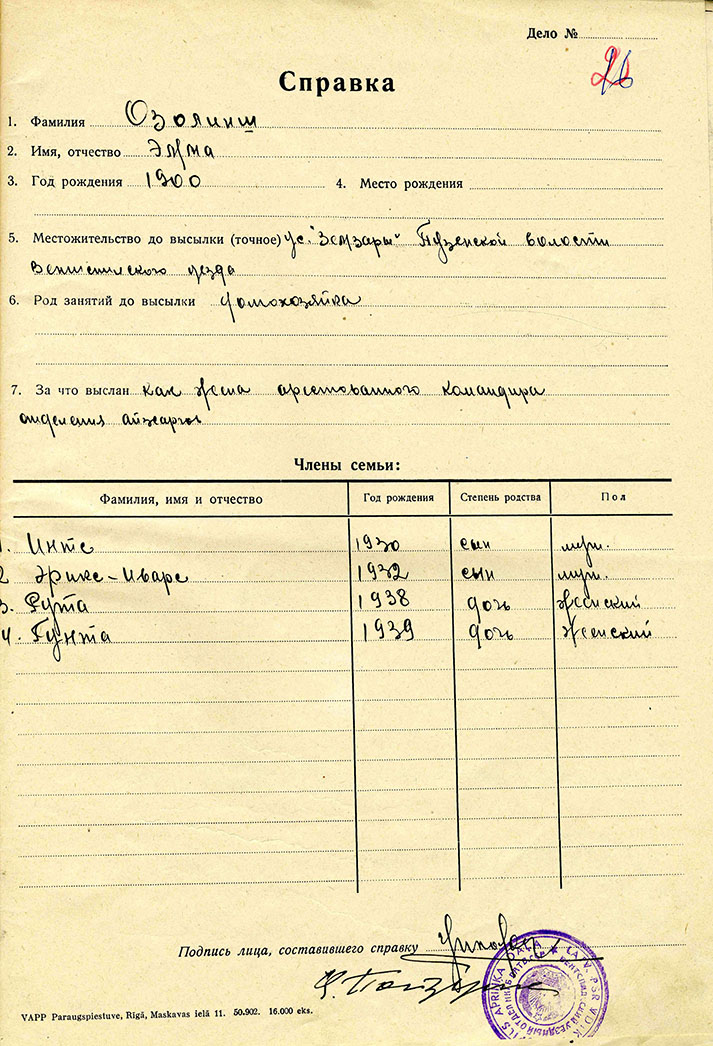 Guntas Ozoliņas ģimeneOzoliņa Gunta Friča m., dz. 1939, dzīvoja Ventspils apriņķa Puzes pagasta Zemzaros, izsūtīta 14.06.41 uz Krasnojarskas novada Suhobuzimskas rajonu, bēgusi 15.09.46, nosūtīta atpakaļ 16.09.50, atbrīvota 30.05.57. Lieta Nr.16499. Tēvs Ozoliņš Fricis Kārļa d., dz. 1895, dzīvoja Ventspils apriņķa Puzes pagasta Zemzaros, arestēts 14.06.41, ieslodzīts Kirovas apgabala Vjatlagā, atbrīvots 30.10.43, pēc tam nometinājumā Krasnojarskas novada Suhobuzimskas rajonā, bēdzis 28.08.47, nosūtīts atpakaļ 16.09.50, atbrīvots, 30.05.57. Lieta Nr.16499. Māte Ozoliņa Emma Kriša m., dz. 1900, dzīvoja Ventspils apriņķa Puzes pagasta Zemzaros izsūtīta 14.06.41 uz Krasnojarskas novada Suhobuzimskas rajonu, bēgusi 28.08.47, nosūtīta atpakaļ 16.09.50, atbrīvota 30.05.57. Lieta Nr.16499. Brālis Ozoliņš Imants Friča d., dz. 1930, dzīvoja Ventspils apriņķa Puzes pagasta Zemzaros, izsūtīts 14.06.41 uz Krasnojarskas novada Suhobuzimskas rajonu, bēdzis 15.09.46, nosūtīts atpakaļ 16.09.50, atbrīvots 30.05.57. Lieta Nr.16499. Brālis Ozoliņš Ēriks Ivars Friča d., dz. 1932, dzīvoja Ventspils apriņķa Puzes pagasta Zemzaros, izsūtīts 14.06.41 uz Krasnojarskas novada Suhobuzimskas rajonu, bēdzis 15.09.46, nosūtīts atpakaļ 16.09.50, atbrīvots 30.05.57. Lieta Nr.16499. Māsa Ozoliņa Ruta Friča m., dz. 1938, dzīvoja Ventspils apriņķa Puzes pagasta Zemzaros, izsūtīta 14.06.41 uz Krasnojarskas novada Suhobuzimskas rajonu, bēgusi 15.09.46, nosūtīta atpakaļ 16.09.50, atbrīvota 30.05.57. Lieta Nr.16499. |